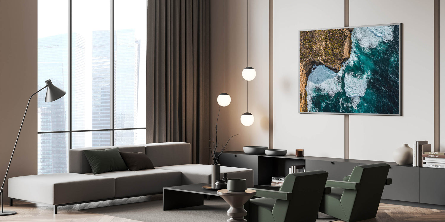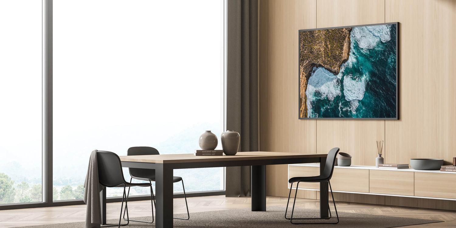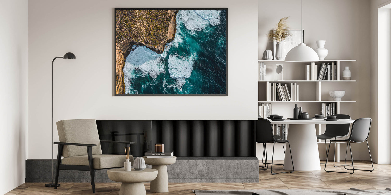 Add a touch of dramatic elegance to your home with this Cliffs Wall Art, featuring an aerial view of rugged coastal cliffs surrounded by powerful waves. The striking contrast between the textured rocky terrain and the vibrant blue ocean captures the untamed beauty of nature. Perfect for adding energy and sophistication to living spaces, this piece resonates with both adventure and tranquility.