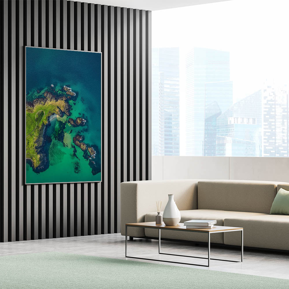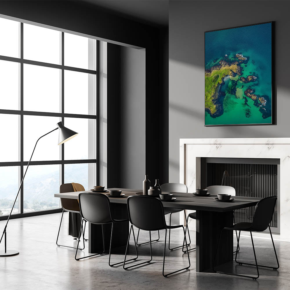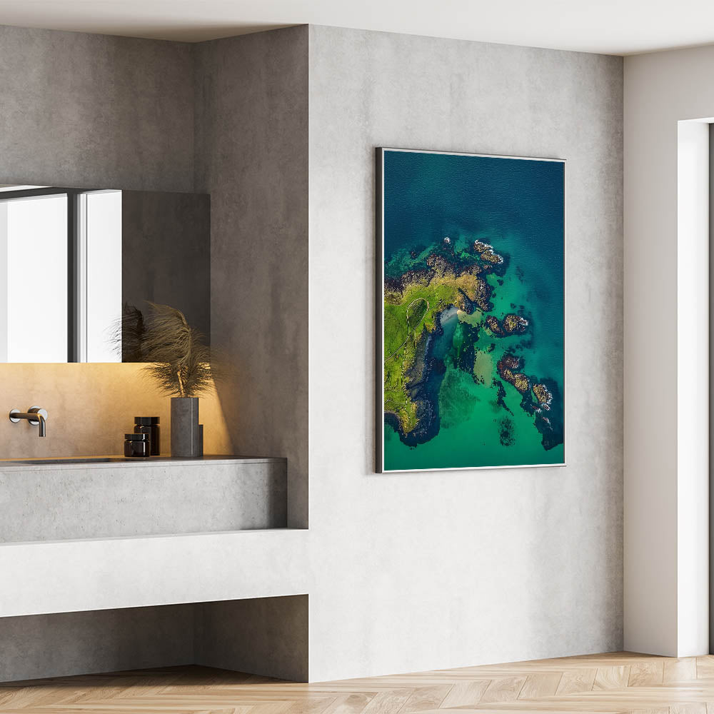 Transform your walls with this captivating Cliffs Wall Art, showcasing an aerial view of an emerald green coastline surrounded by crystal-clear blue waters. This artwork masterfully captures the natural beauty of rugged cliffs, tranquil beaches, and vibrant ocean hues, creating a mesmerizing and serene ambiance.