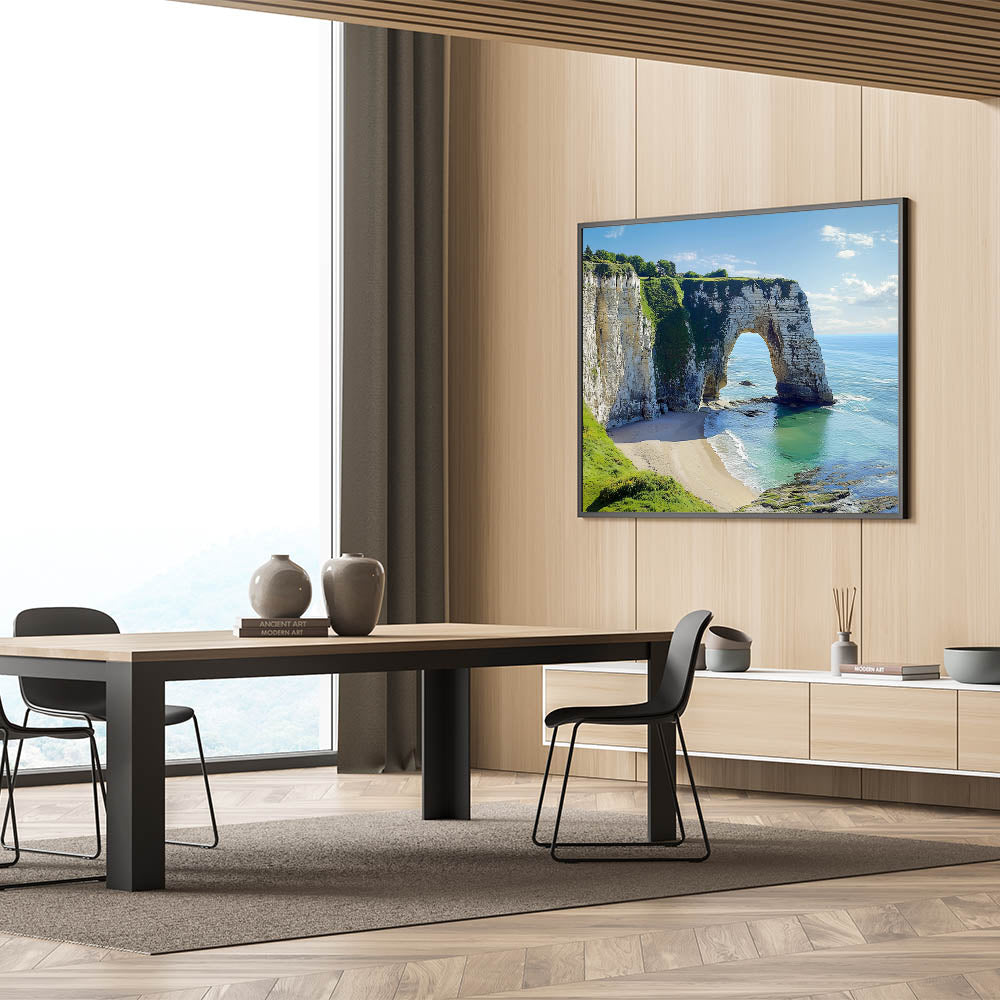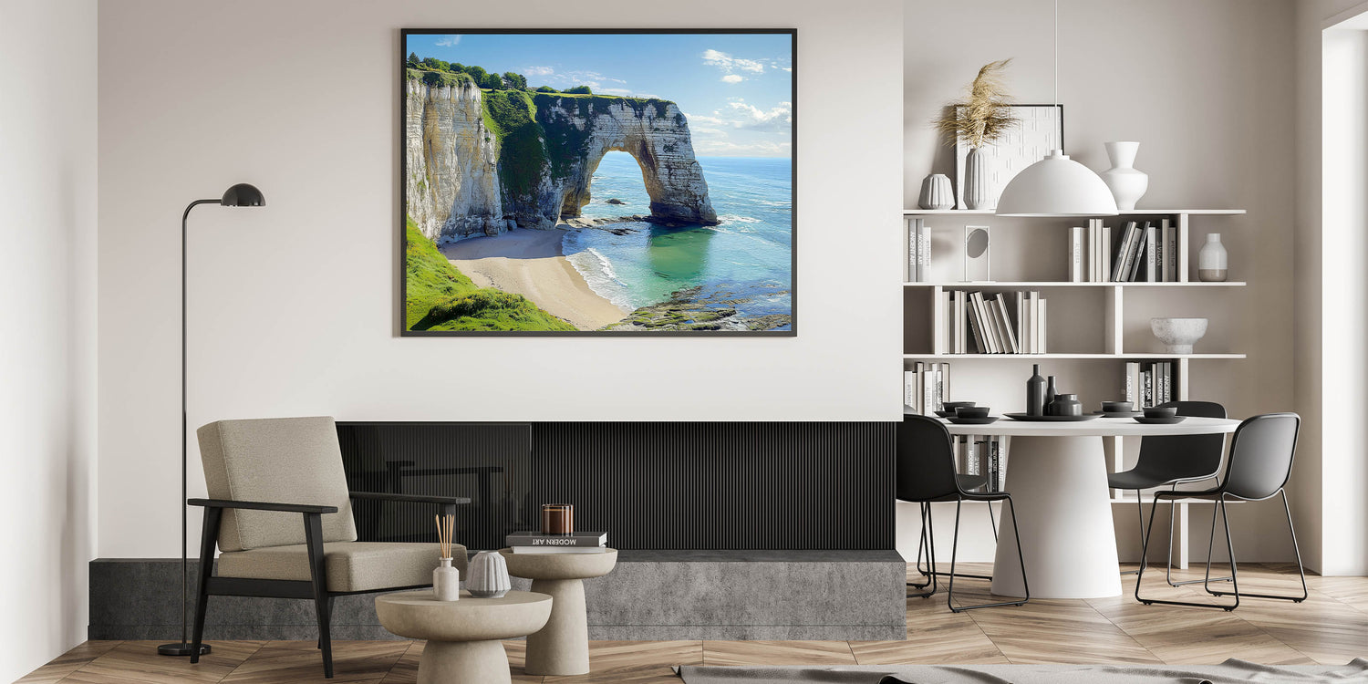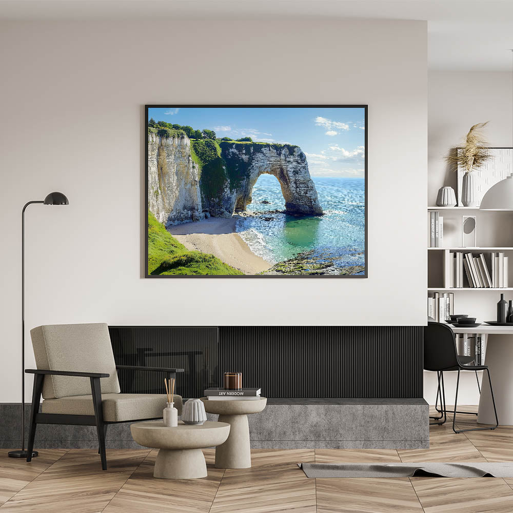 Capture the timeless beauty of nature with this Cliffs Wall Art, showcasing a stunning coastal arch towering above a pristine sandy beach. The natural elegance of this piece is enhanced by lush green cliffs and the glistening turquoise waters of the ocean, creating a serene and captivating scene. Perfect for lovers of coastal landscapes, this artwork brings tranquility and sophistication to any room.