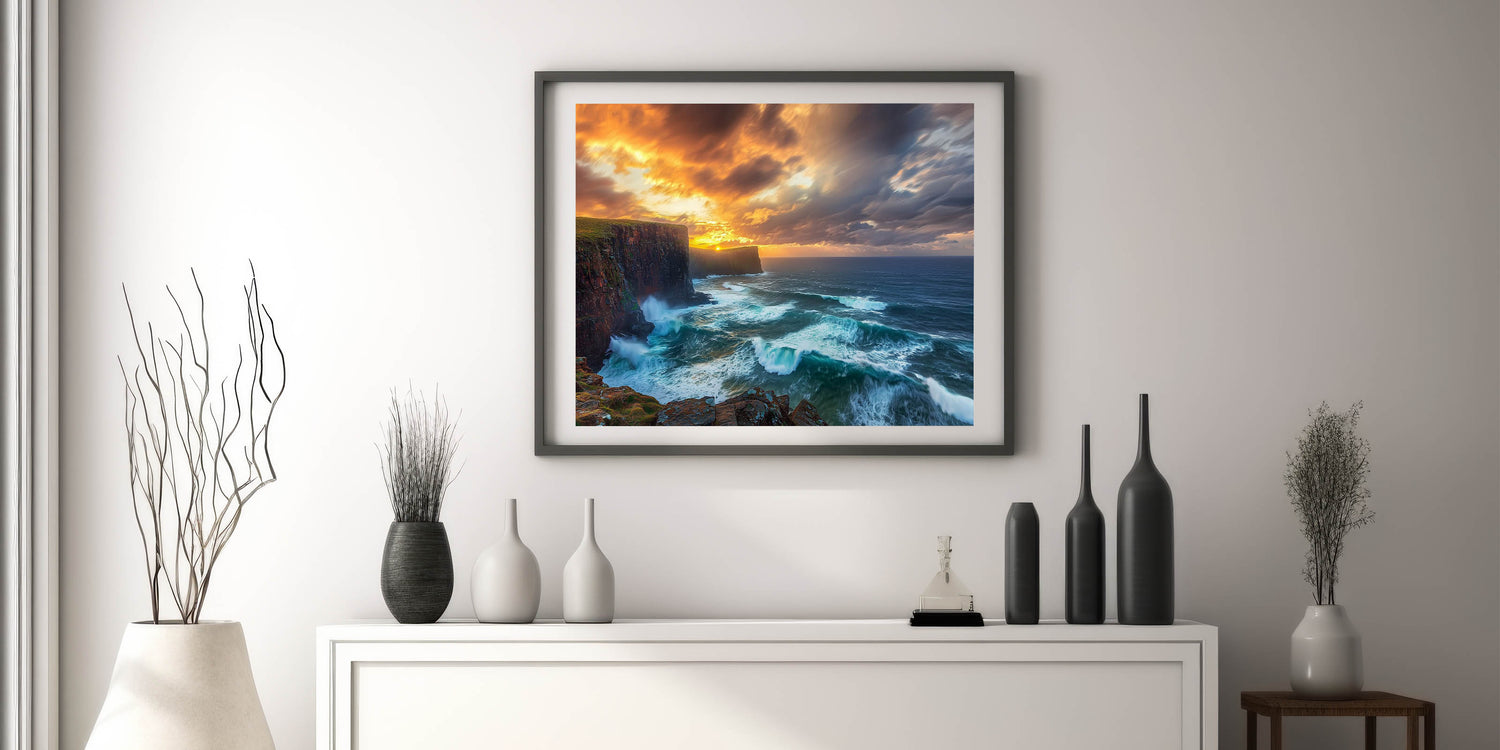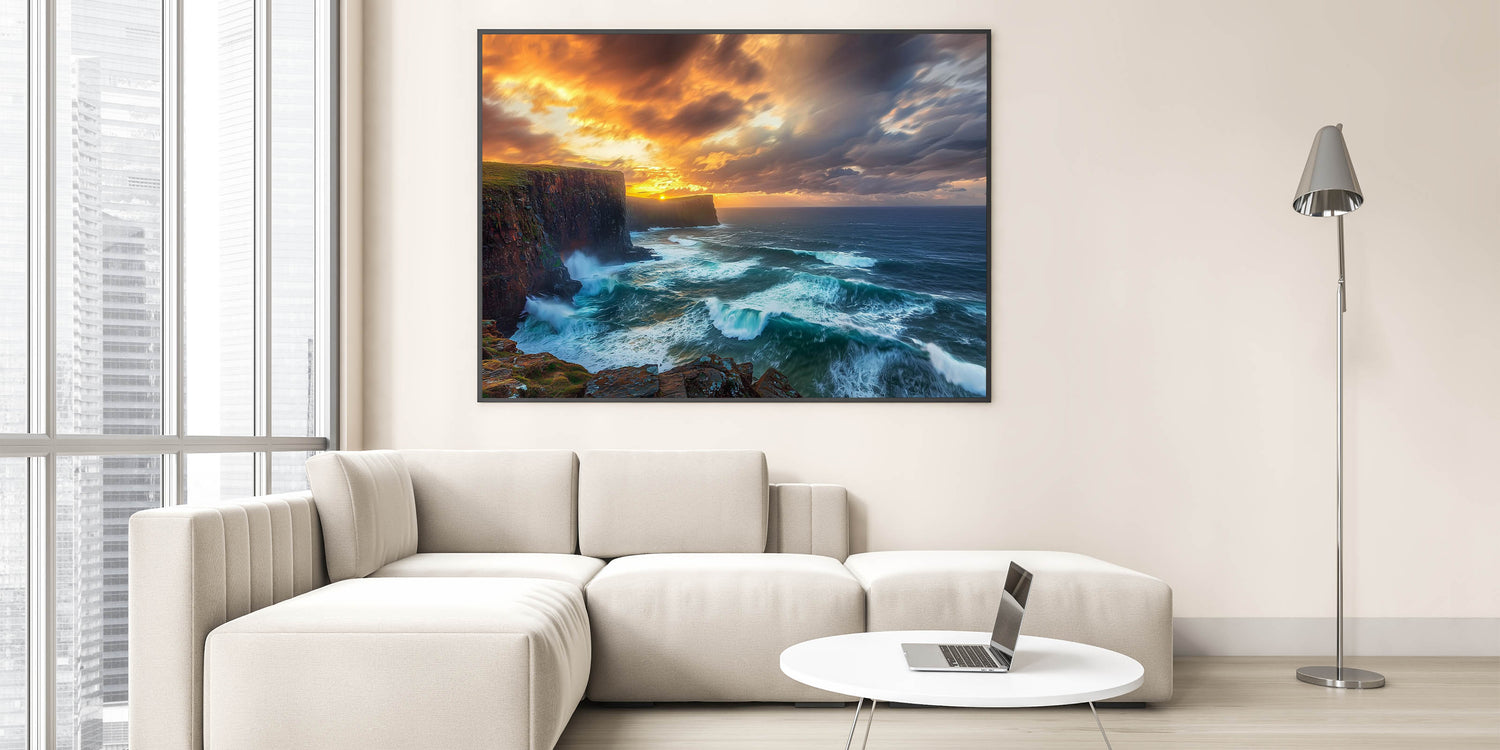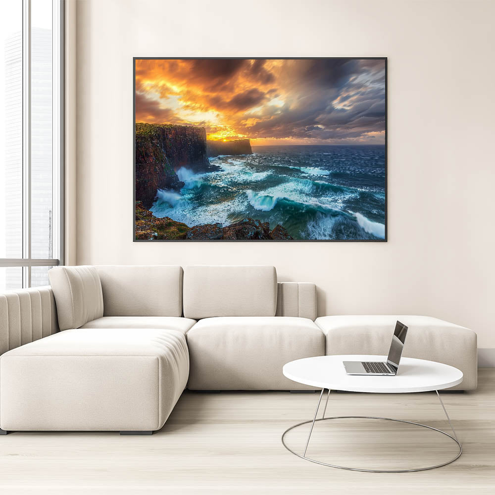 Transform your space with the dramatic beauty of this Cliffs Wall Art. Featuring towering cliffs illuminated by the fiery glow of a breathtaking sunset, this artwork captures the untamed power of nature. The vibrant oranges, reds, and golds in the sky contrast beautifully with the deep blues and whites of the crashing waves below. This piece brings a sense of energy and awe to any room, making it the perfect choice for lovers of bold and dramatic landscapes.