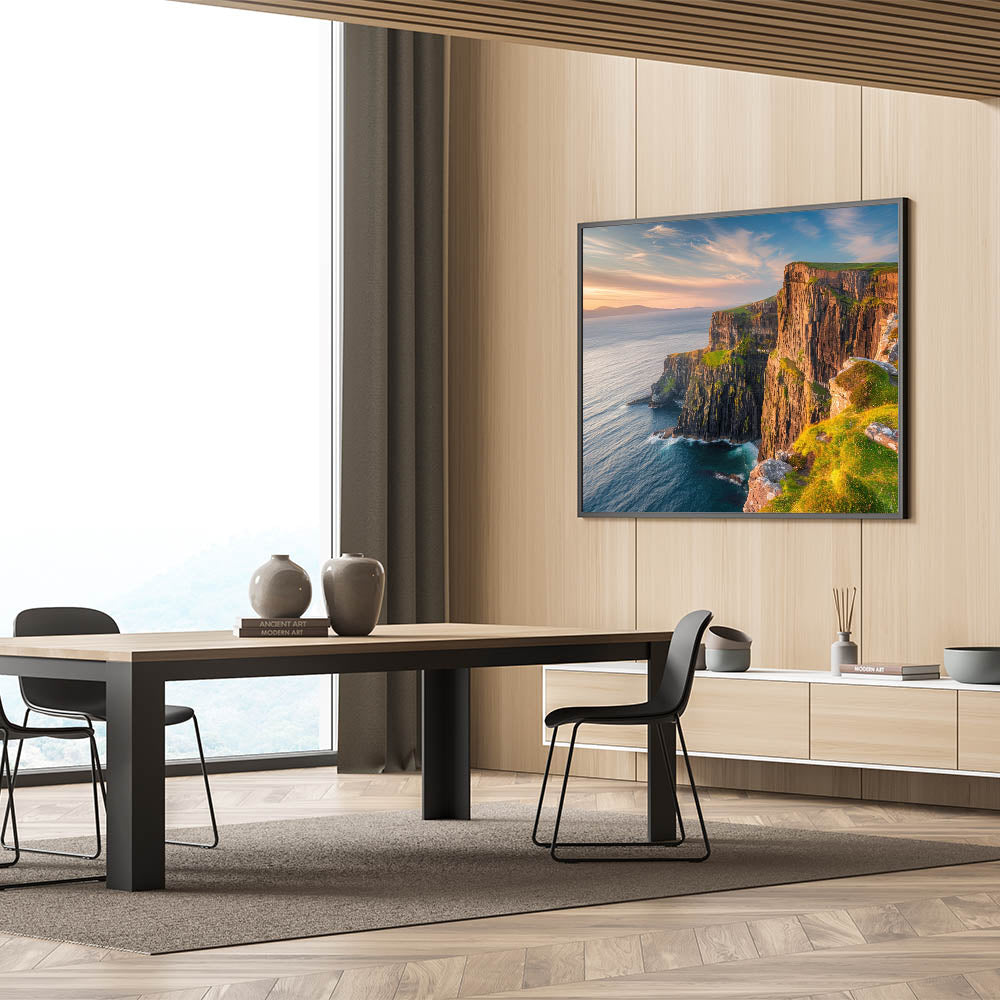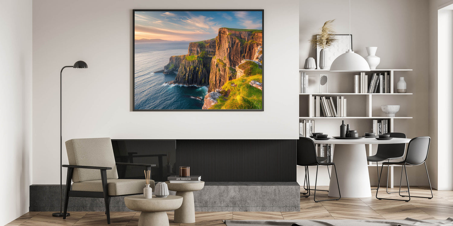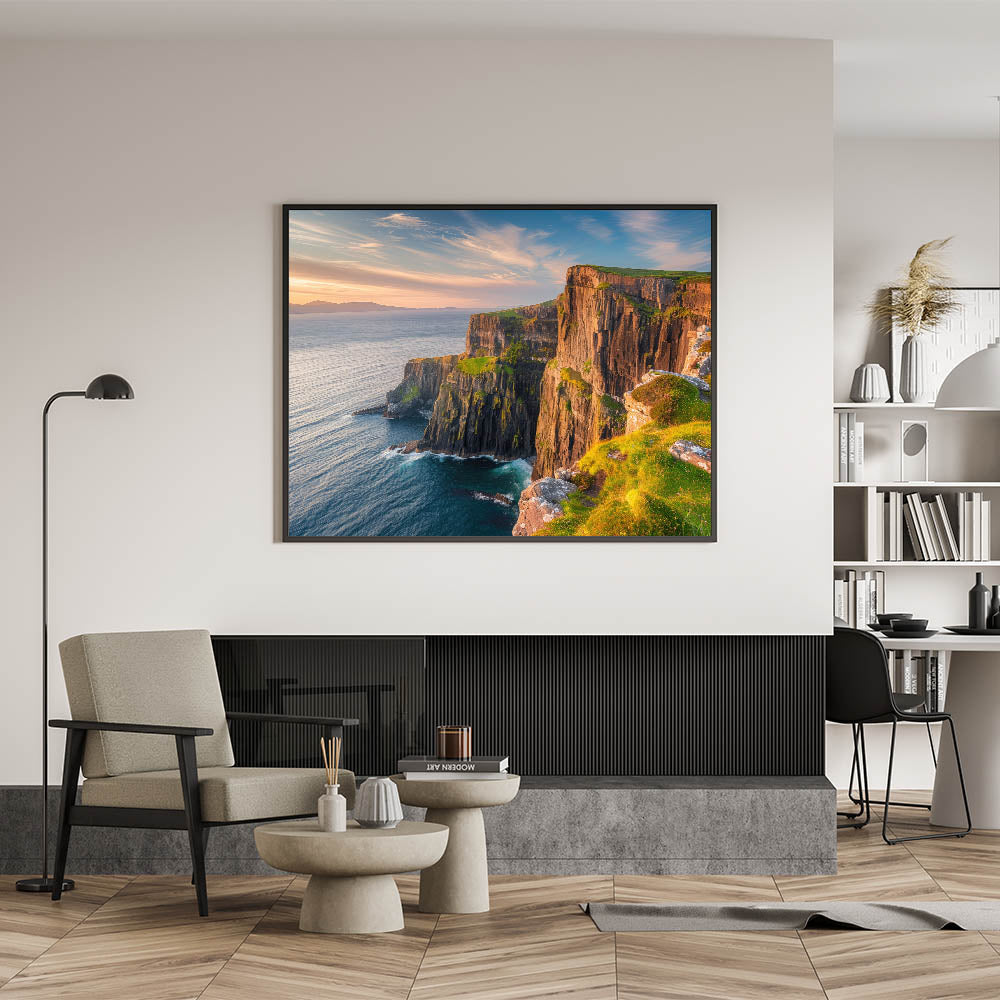- Vibrant Colors: The print captures the rich, warm tones of the sunset and the natural textures of the cliffs and ocean.