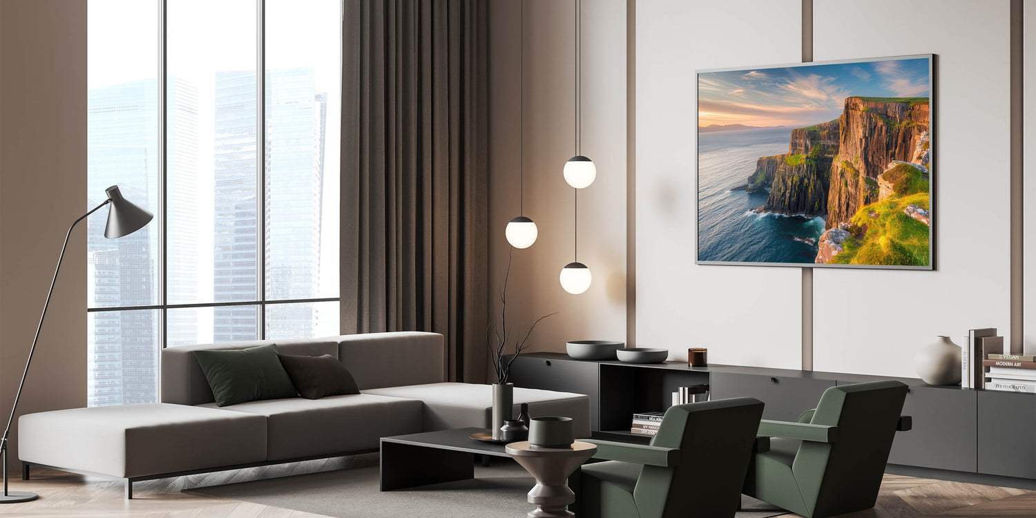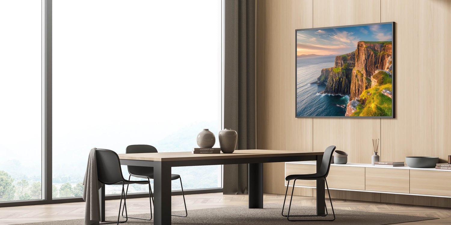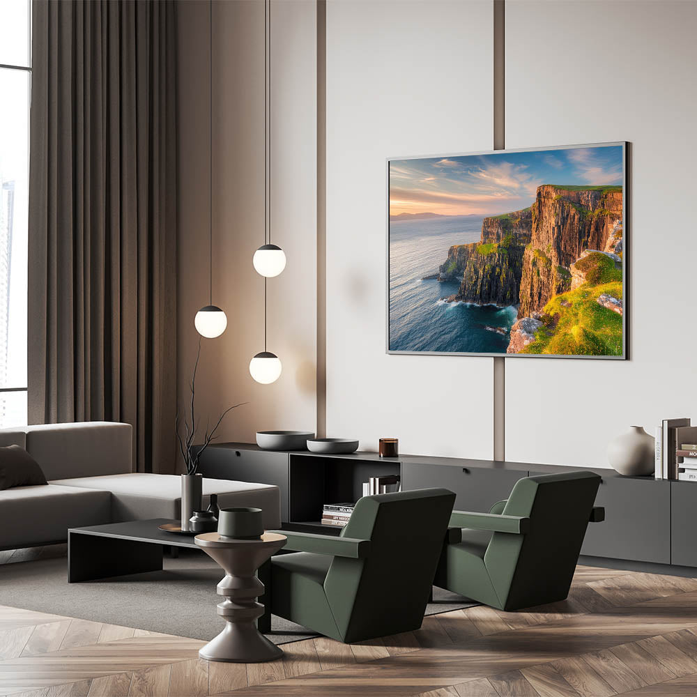 - Vibrant Colors: The print captures the rich, warm tones of the sunset and the natural textures of the cliffs and ocean.