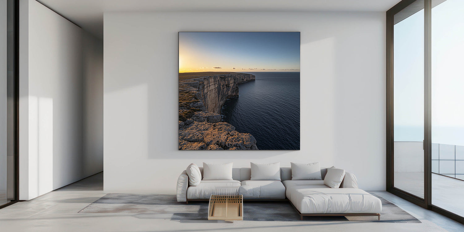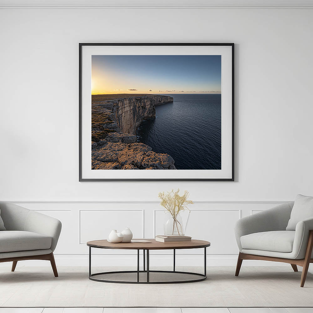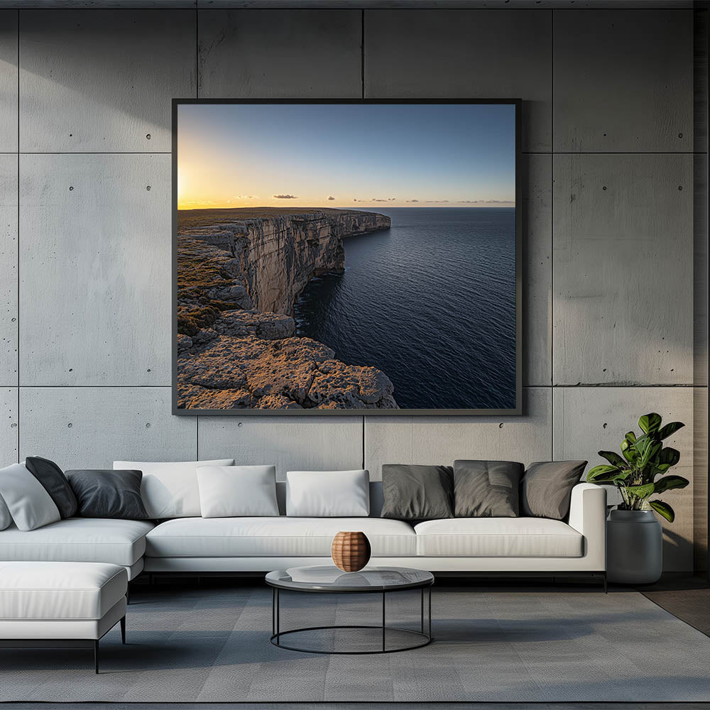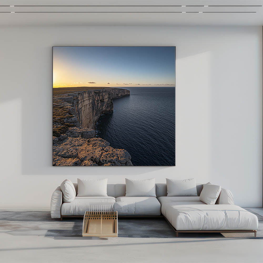 Embrace the timeless beauty of golden hour with this serene wall art depicting sunlit cliffs overlooking a tranquil ocean. The soft glow of the setting sun casts warm hues over the rugged cliffs, while the vast expanse of the calm sea adds a touch of tranquility. This stunning artwork is perfect for those who appreciate the harmony of nature.