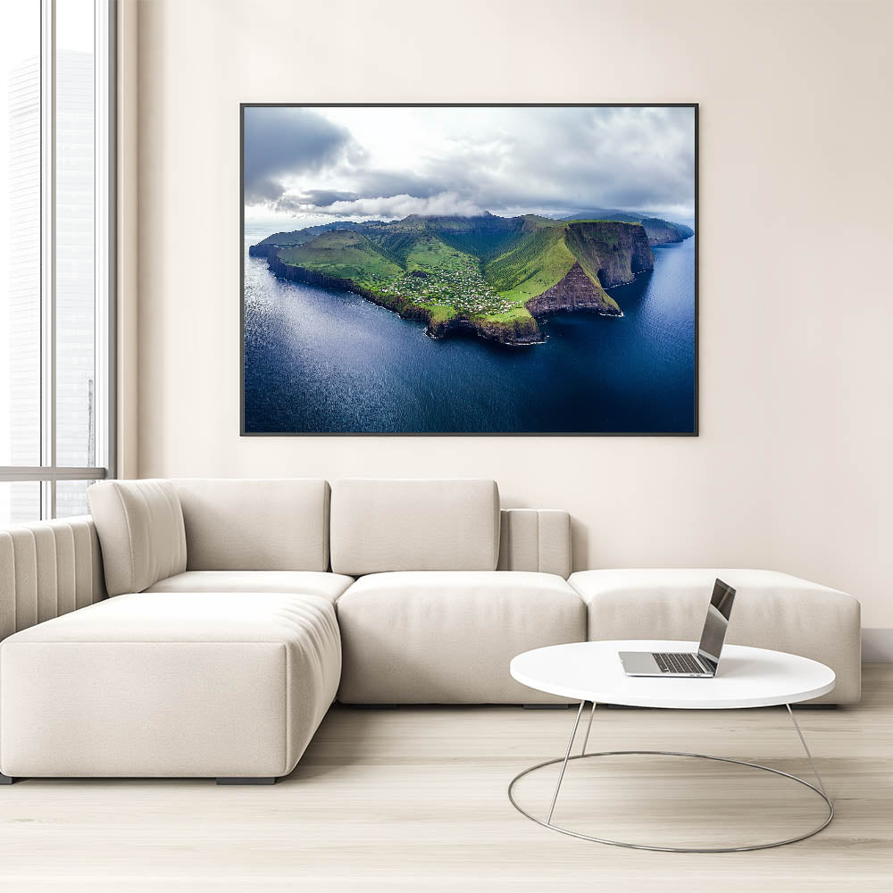 Capture the awe-inspiring beauty of majestic cliffs and serene coastal waters with this panoramic landscape wall art. Featuring a stunning aerial view of green-cloaked cliffs meeting deep blue ocean waves, this artwork exudes tranquility and natural charm.