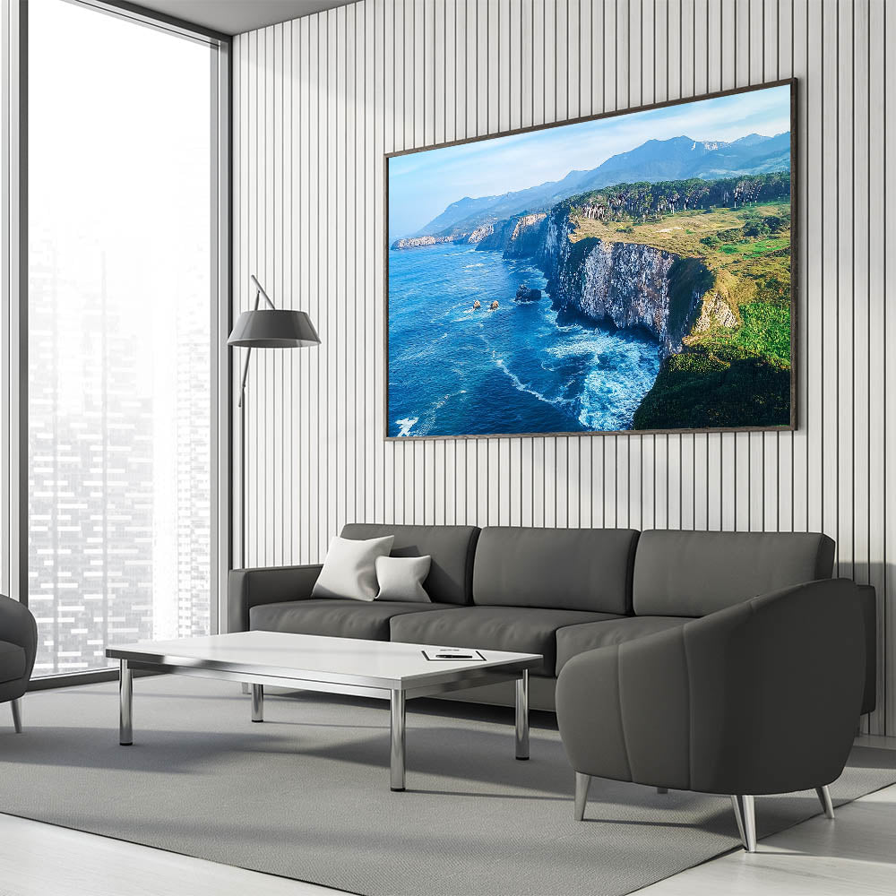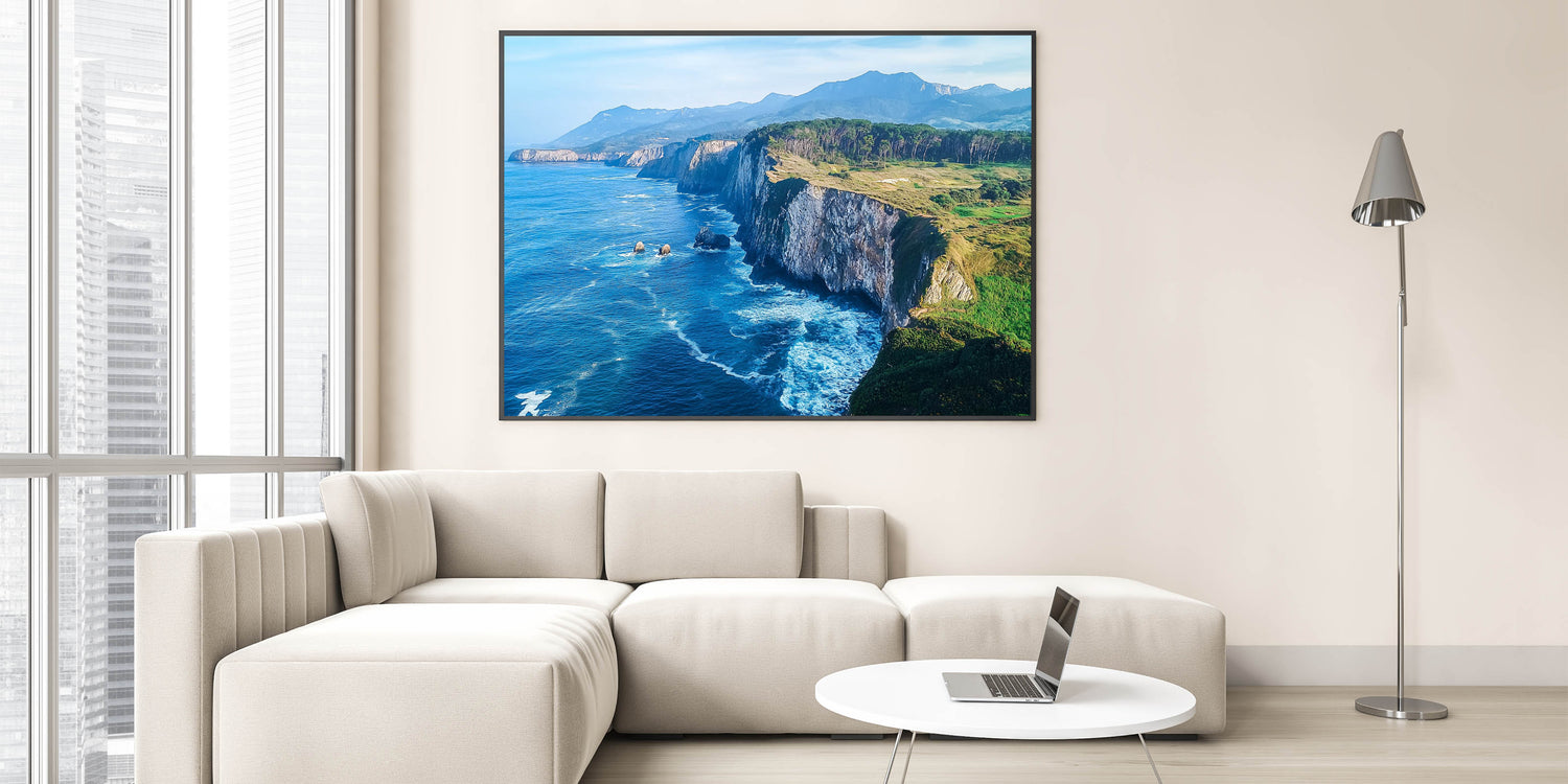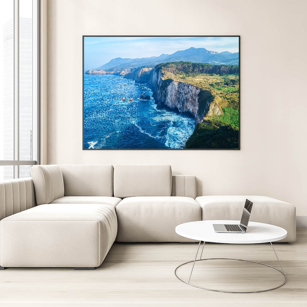 Transform your space with the serene beauty of this Scenic Cliffs Artwork, featuring dramatic coastal cliffs overlooking the expansive ocean. The vibrant blue waves crashing against the rugged shoreline create a dynamic composition, while the lush greenery adds a touch of natural elegance. Perfect for nature lovers and coastal decor enthusiasts, this artwork brings the essence of untouched landscapes into your home or office.