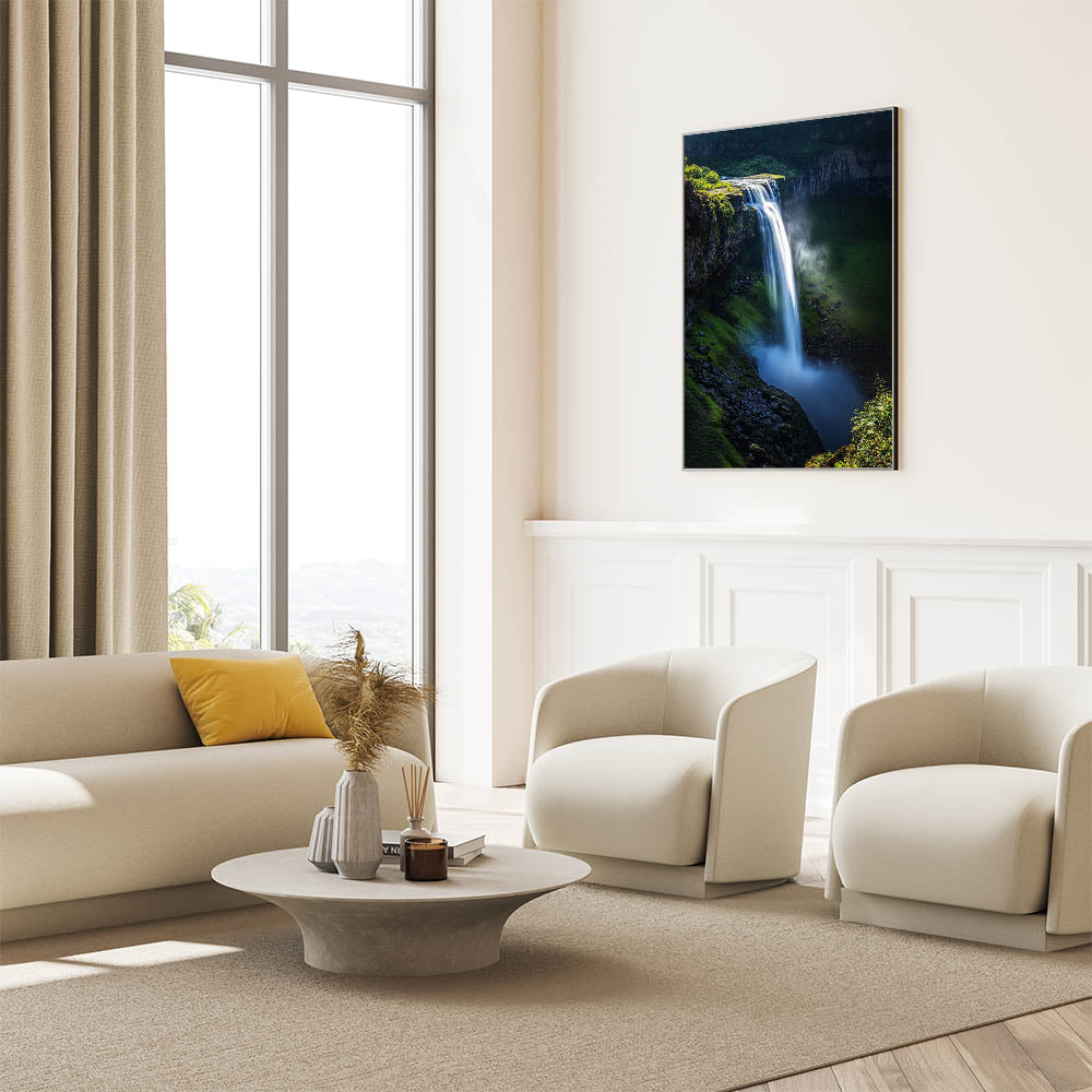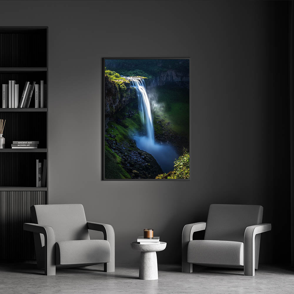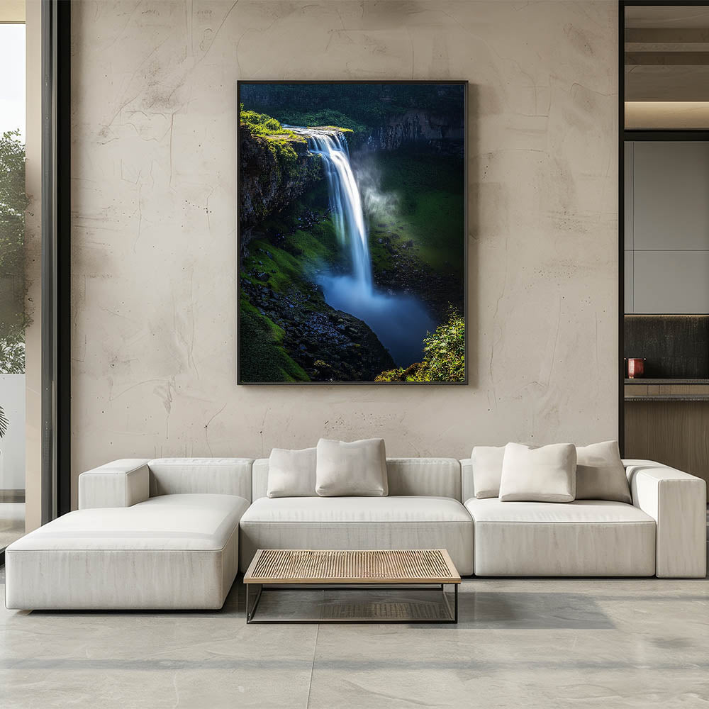Immerse yourself in the beauty of nature with this Scenic Cliffs Artwork, featuring a vibrant waterfall cascading over verdant cliffs. This mesmerizing piece captures the dynamic movement of water against the rich green foliage, creating a sense of tranquility and awe. Perfect for nature enthusiasts and anyone seeking to bring the outdoors inside.