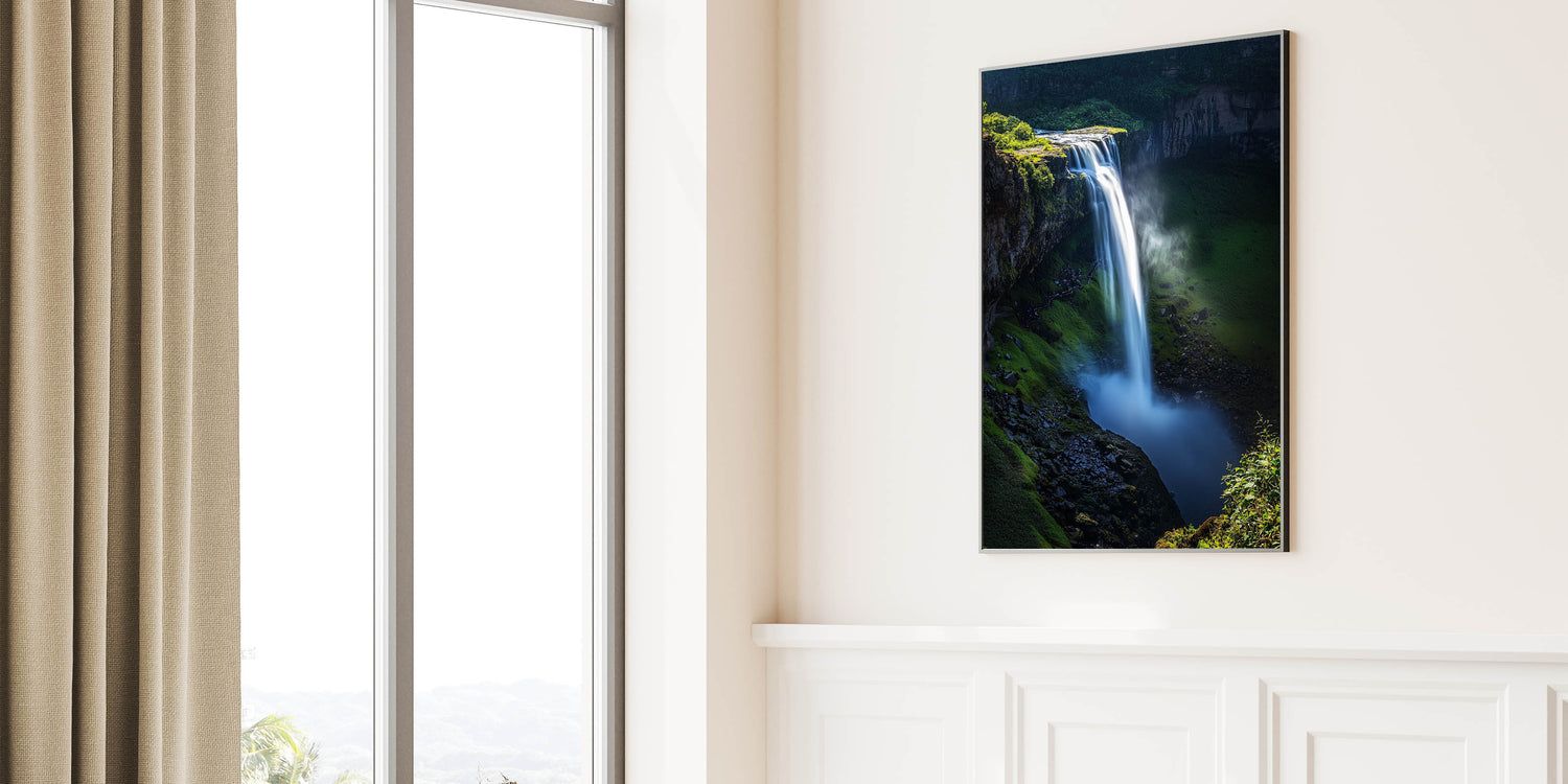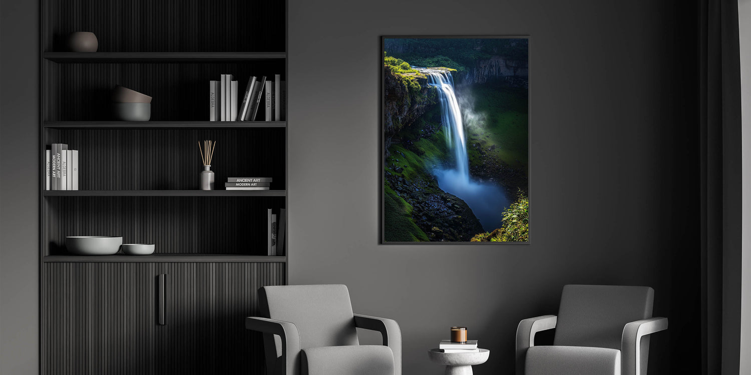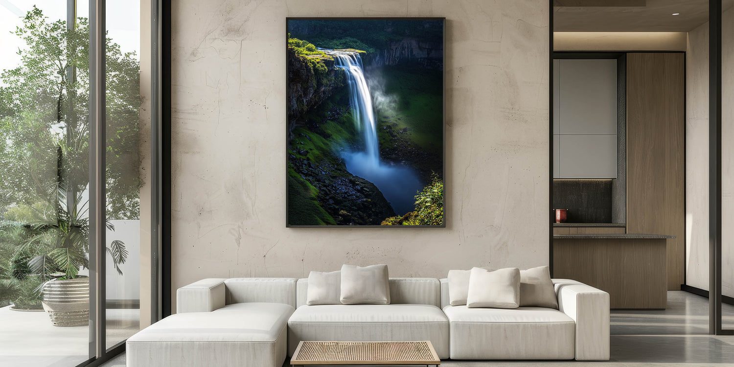 Immerse yourself in the beauty of nature with this Scenic Cliffs Artwork, featuring a vibrant waterfall cascading over verdant cliffs. This mesmerizing piece captures the dynamic movement of water against the rich green foliage, creating a sense of tranquility and awe. Perfect for nature enthusiasts and anyone seeking to bring the outdoors inside.