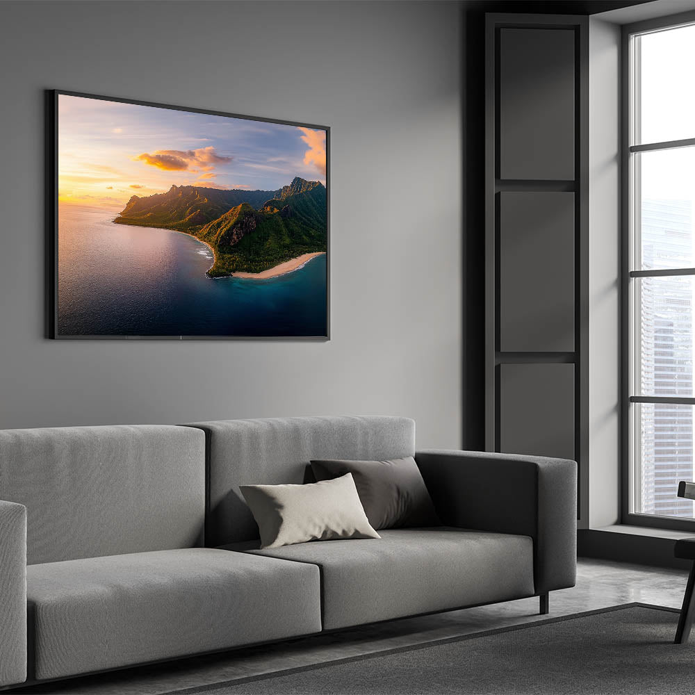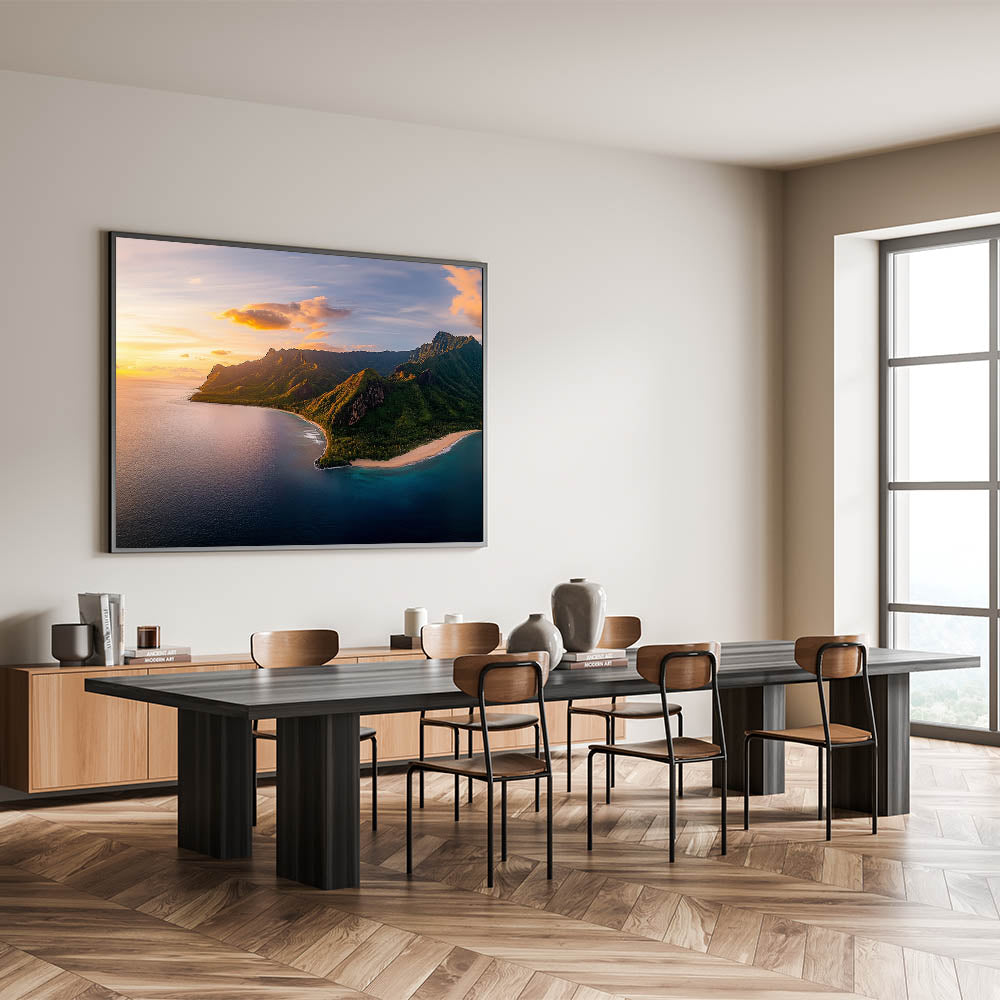 Experience the enchanting beauty of tropical coastal cliffs with this breathtaking wall art. The vibrant scene captures lush green mountains descending into golden sandy beaches, with the tranquil ocean stretching into the horizon. The warm hues of the setting sun add a touch of magic, creating a peaceful yet invigorating atmosphere.