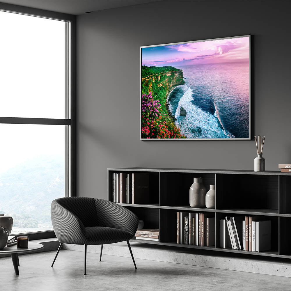 Transform your space with this "Vibrant Coastal Cliffs Canvas," capturing the breathtaking beauty of a coastal landscape at sunset. The vibrant hues of the setting sun, ranging from soft pinks to deep purples, illuminate the cliffs and ocean, creating a stunning contrast with the lush greenery and colorful flowers that adorn the scene. This piece of wall art is perfect for bringing a sense of energy and beauty into any room.
