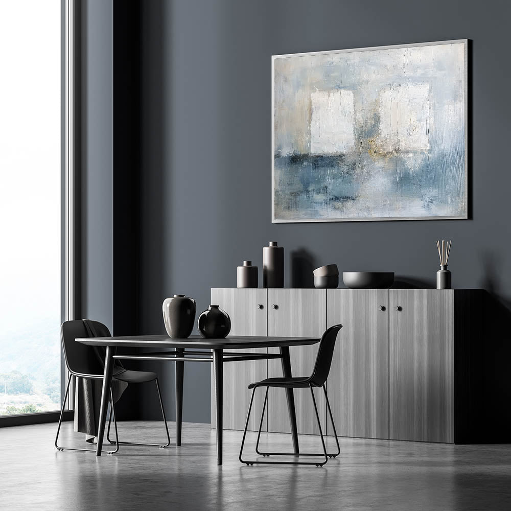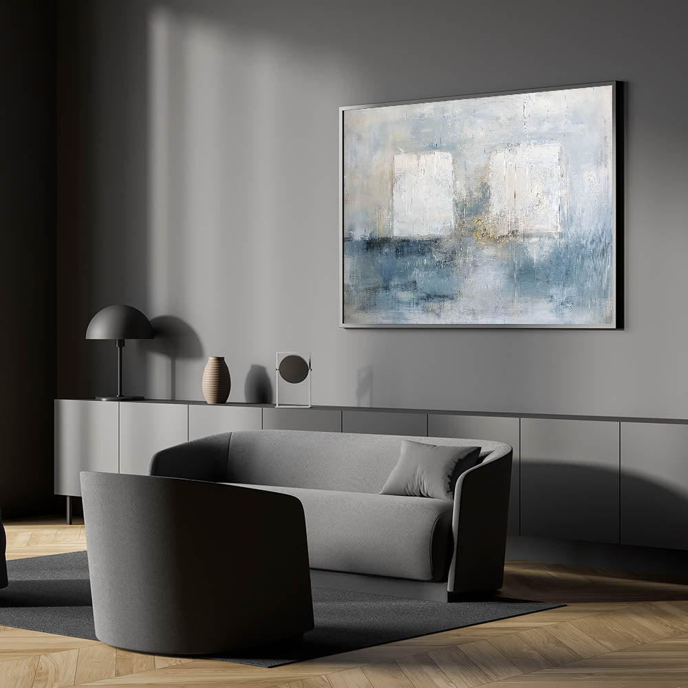 Enhance your home with this Living Room Wall Art, featuring a beautifully textured abstract composition in soft blues, whites, and beige. This Modern Wall Art captures a sense of depth and tranquility, making it a perfect addition to Modern Living Room Décor. With delicate brushstrokes and subtle hints of gold, this artwork brings a sophisticated touch to contemporary interiors.