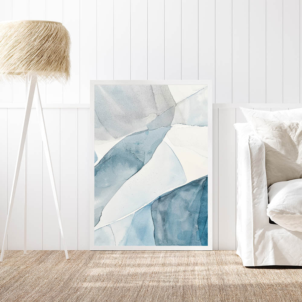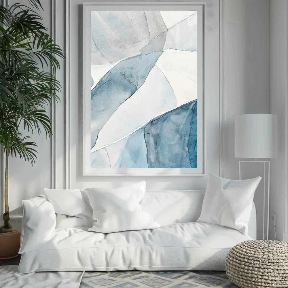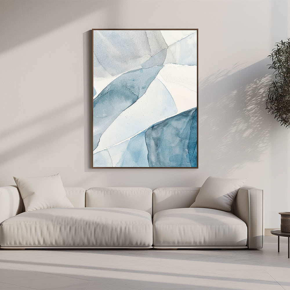 This coastal wall art features an abstract composition of overlapping watercolor shapes in soothing blue and gray tones, evoking the calm and fluidity of ocean waves. The blend of soft hues creates a sense of depth and tranquility, making this piece perfect for those looking to bring a modern, beach-inspired ambiance into their space. Its minimalist aesthetic fits seamlessly into various decor styles, offering a versatile and elegant option for enhancing living rooms, bedrooms, or offices.