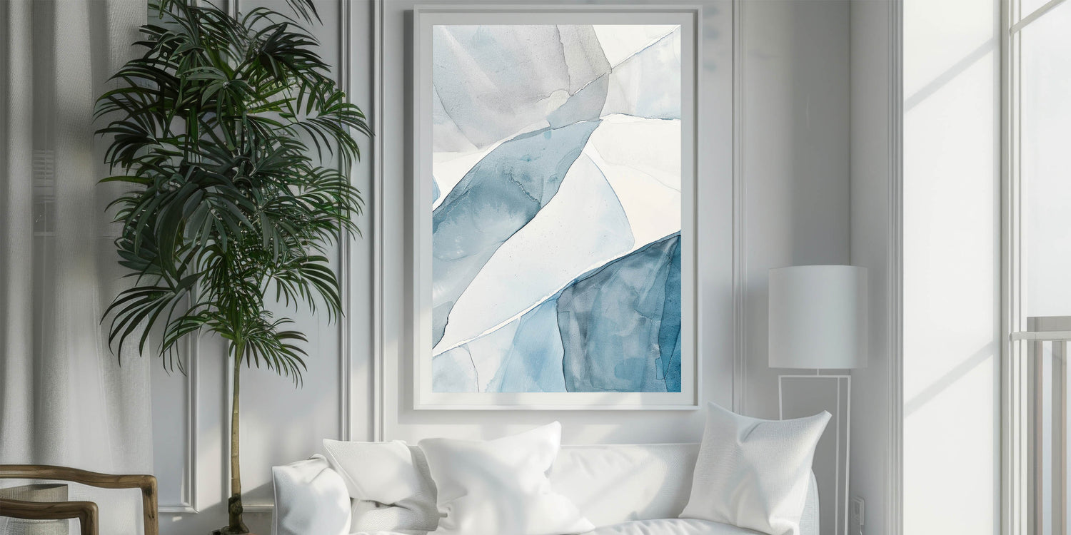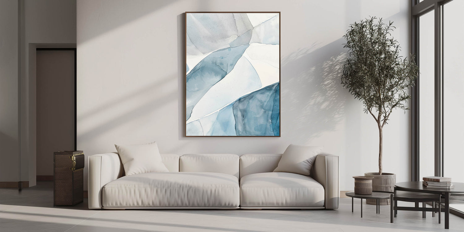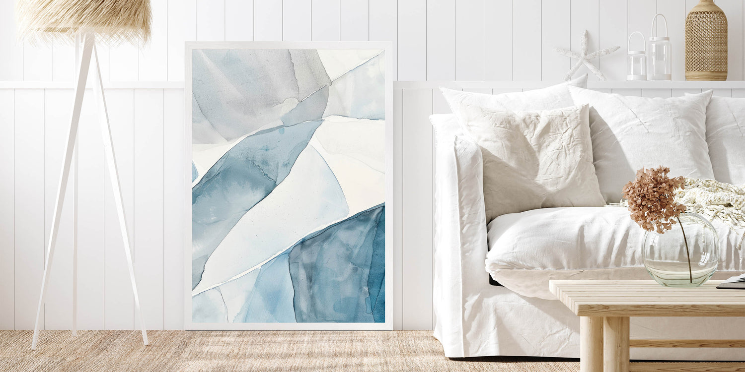 This coastal wall art features an abstract composition of overlapping watercolor shapes in soothing blue and gray tones, evoking the calm and fluidity of ocean waves. The blend of soft hues creates a sense of depth and tranquility, making this piece perfect for those looking to bring a modern, beach-inspired ambiance into their space. Its minimalist aesthetic fits seamlessly into various decor styles, offering a versatile and elegant option for enhancing living rooms, bedrooms, or offices.
