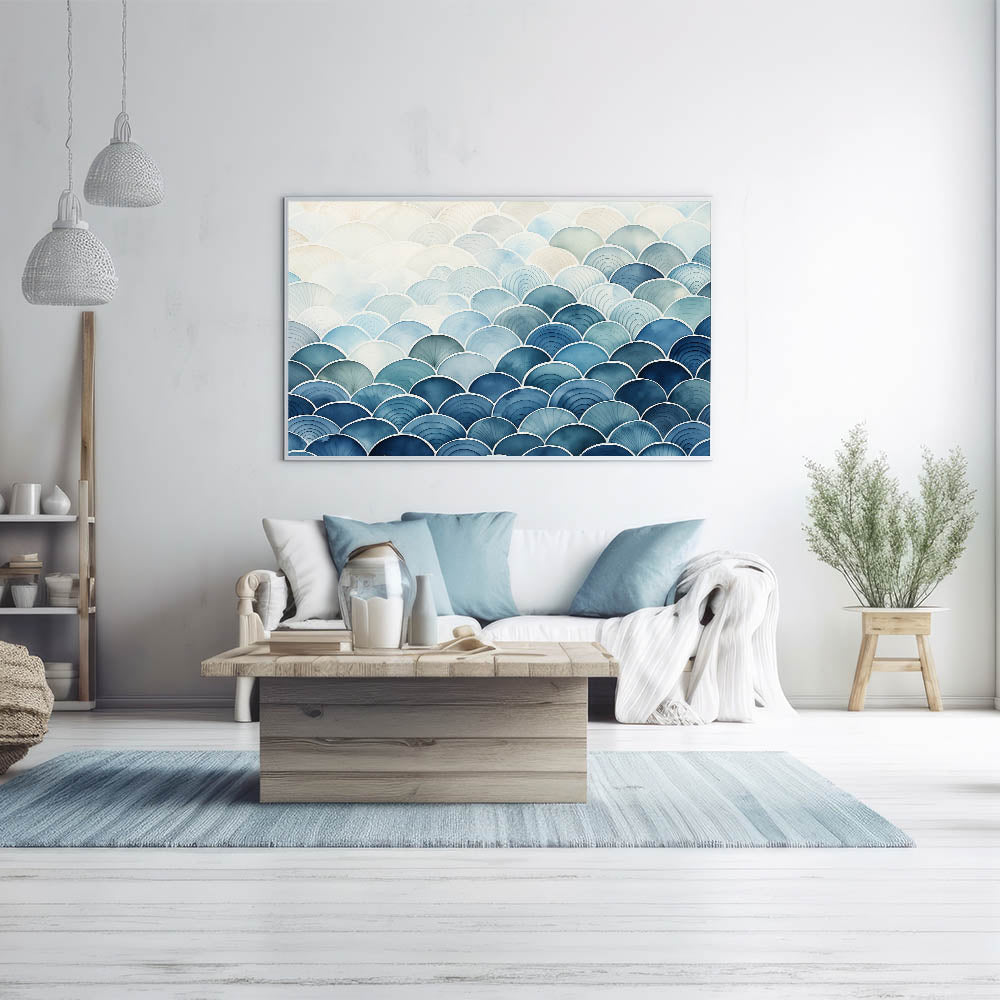 Elevate your space with this stunning abstract coastal wave pattern wall art. Featuring a mesmerizing array of blue and teal tones arranged in layered, wave-like shapes, this artwork evokes the calming essence of the ocean. The intricate design and soft gradient of colors create a sense of movement, making it a perfect addition to modern, beach-themed, or nautical decor. Its elegant, abstract form allows it to blend seamlessly with a variety of interior styles, adding a touch of coastal sophistication to your space.