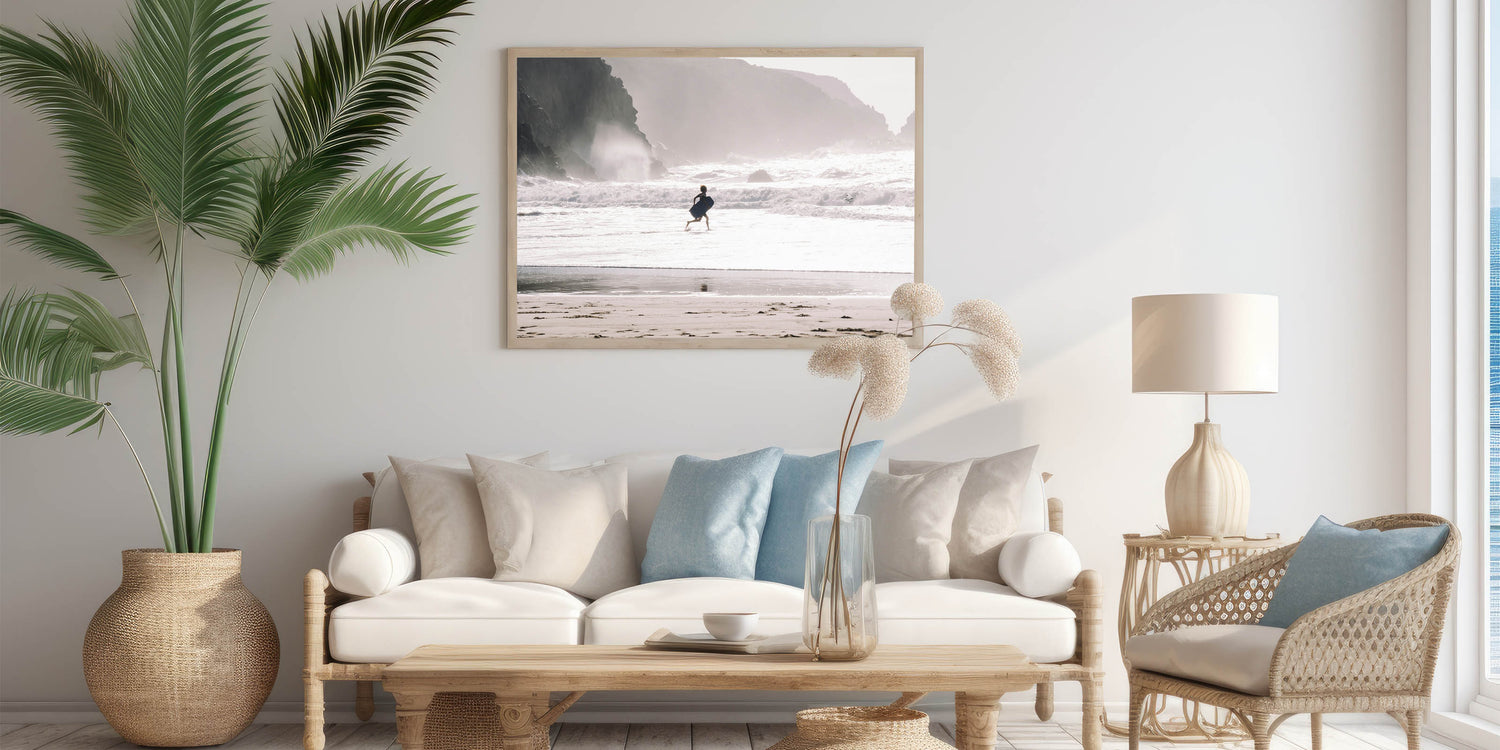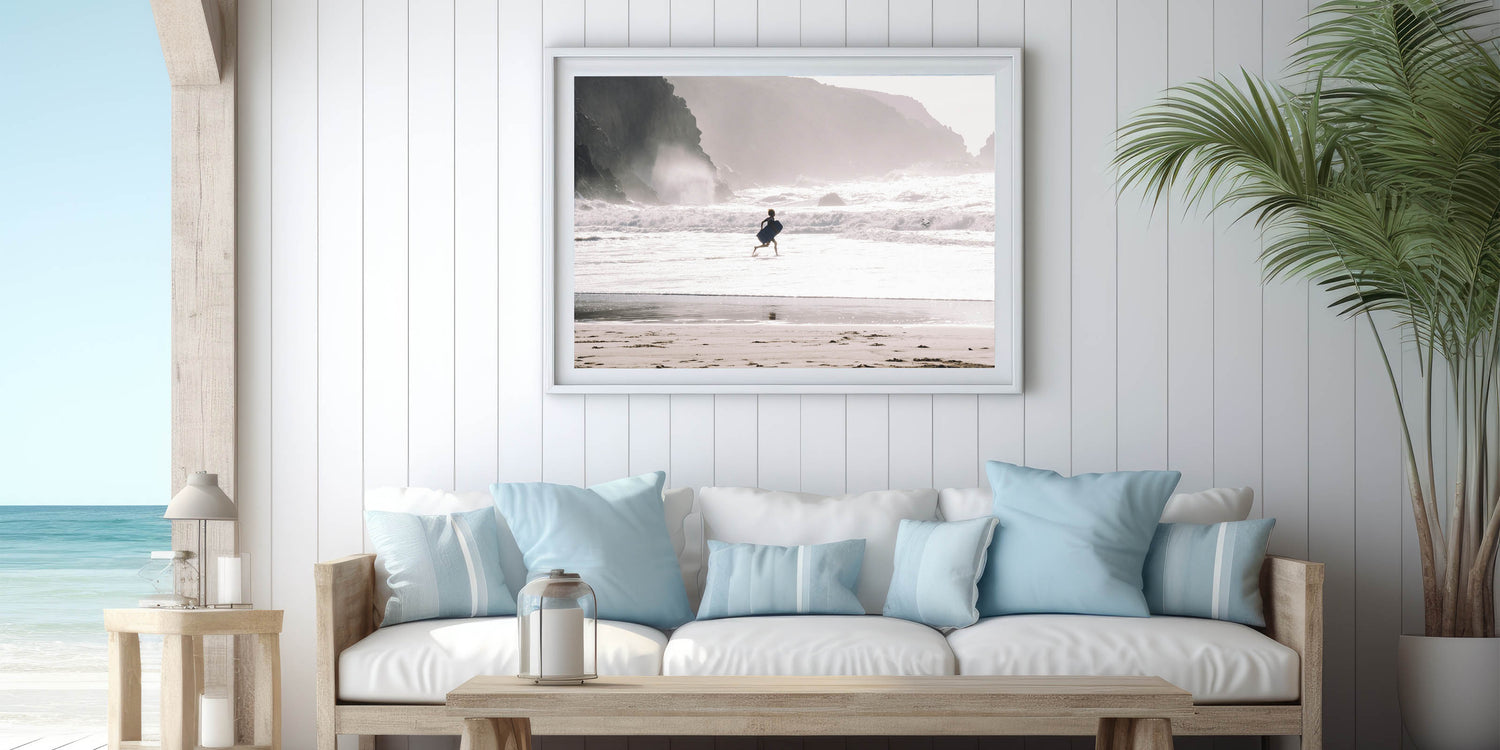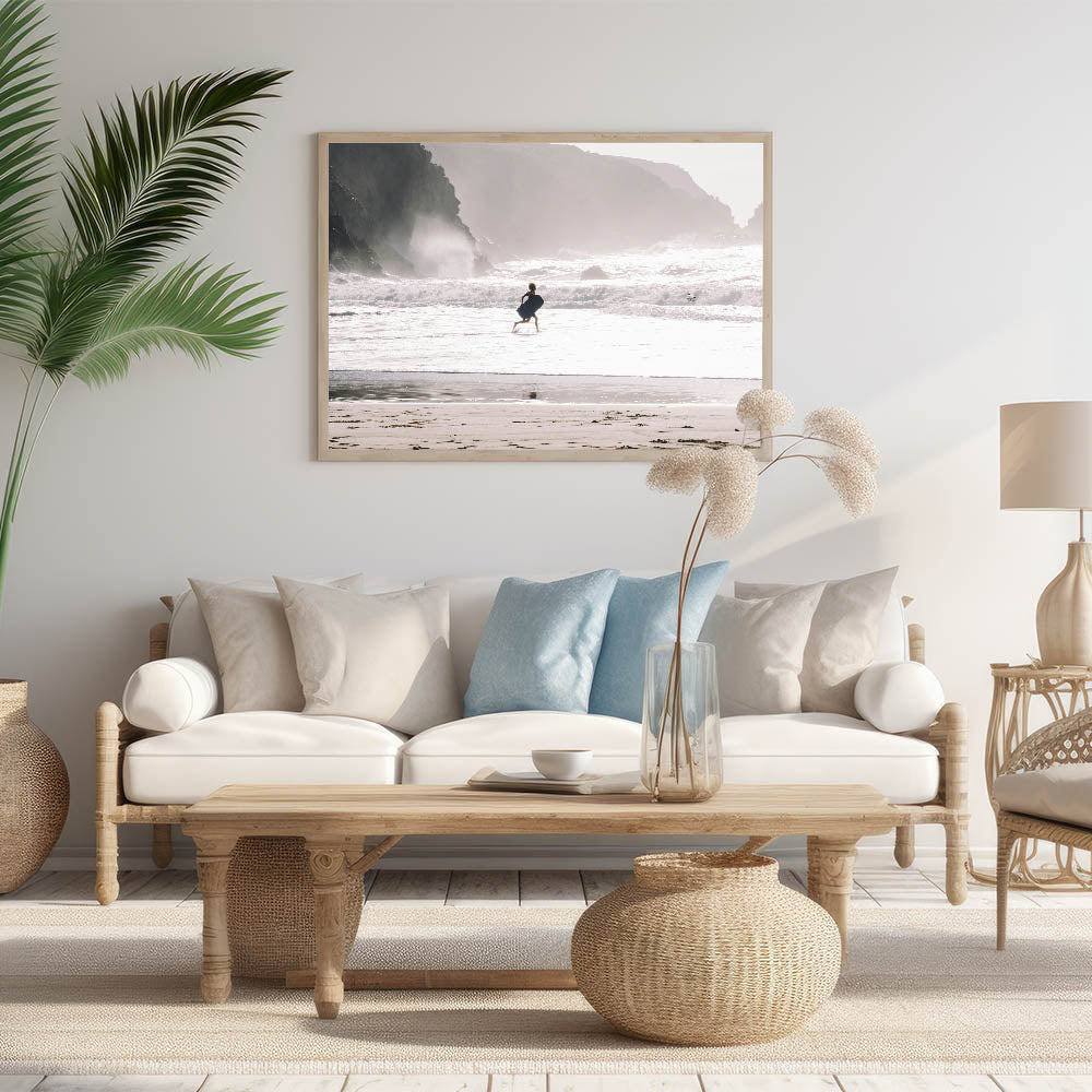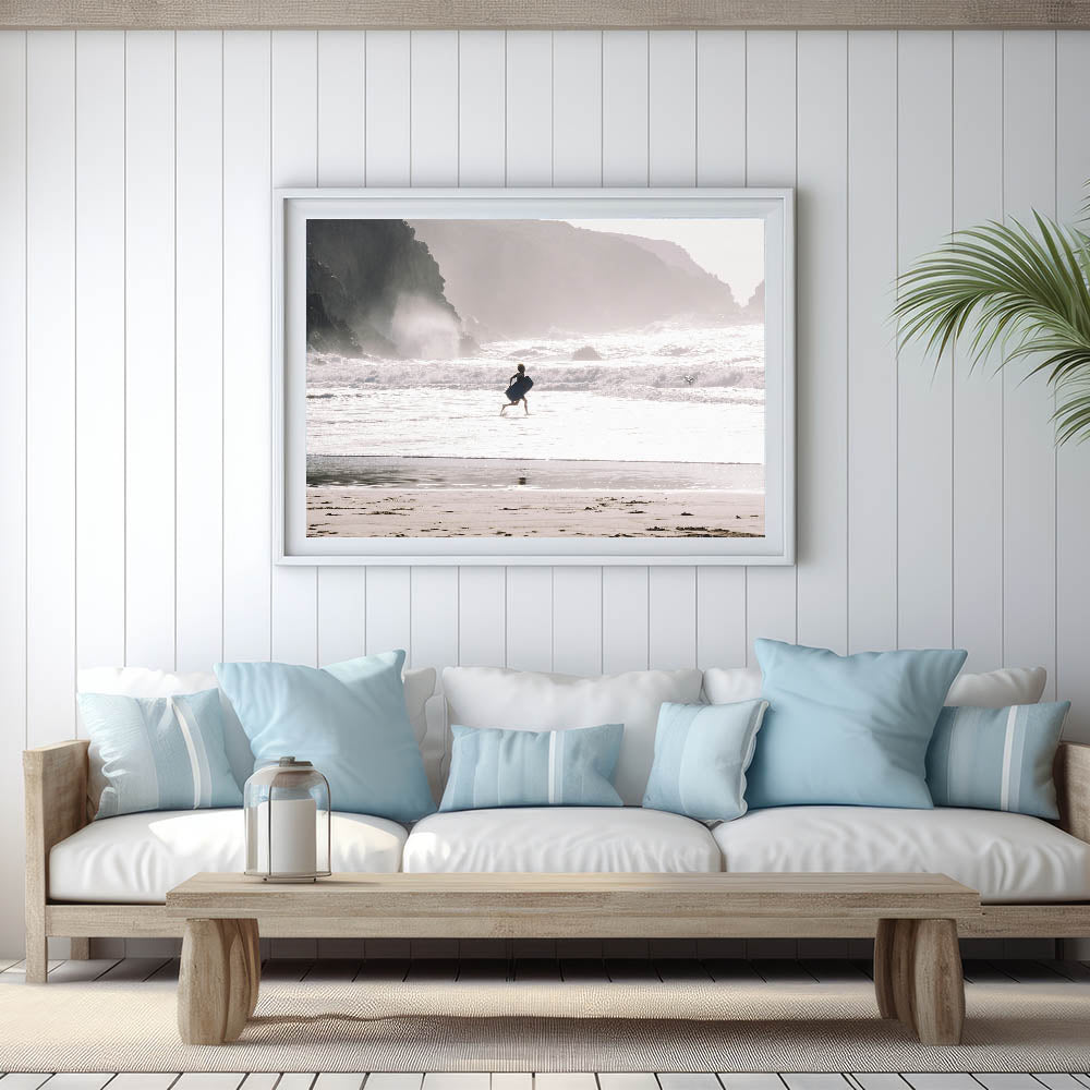 Capture the joy of a sun-filled day at the beach with this vibrant coastal wall art featuring a child running along the shore. The powerful waves crash against the rocky cliffs in the background, while the child carries a bodyboard, ready to dive into the surf. This artwork brings the energy and excitement of seaside adventures into your home, making it perfect for nautical or beach-themed decor. The stunning light and misty ambiance of the scene evoke a carefree spirit, ideal for coastal-inspired living spaces.