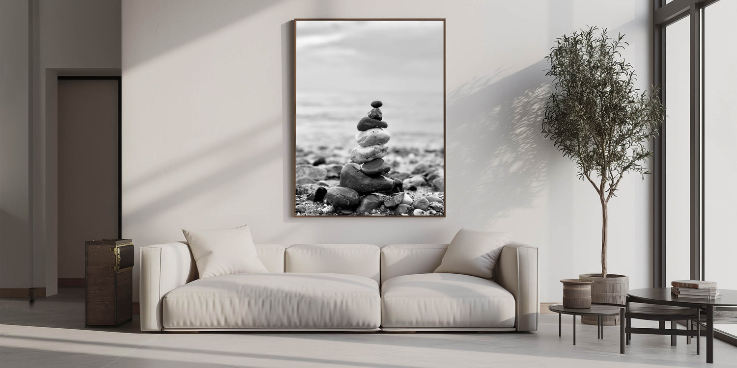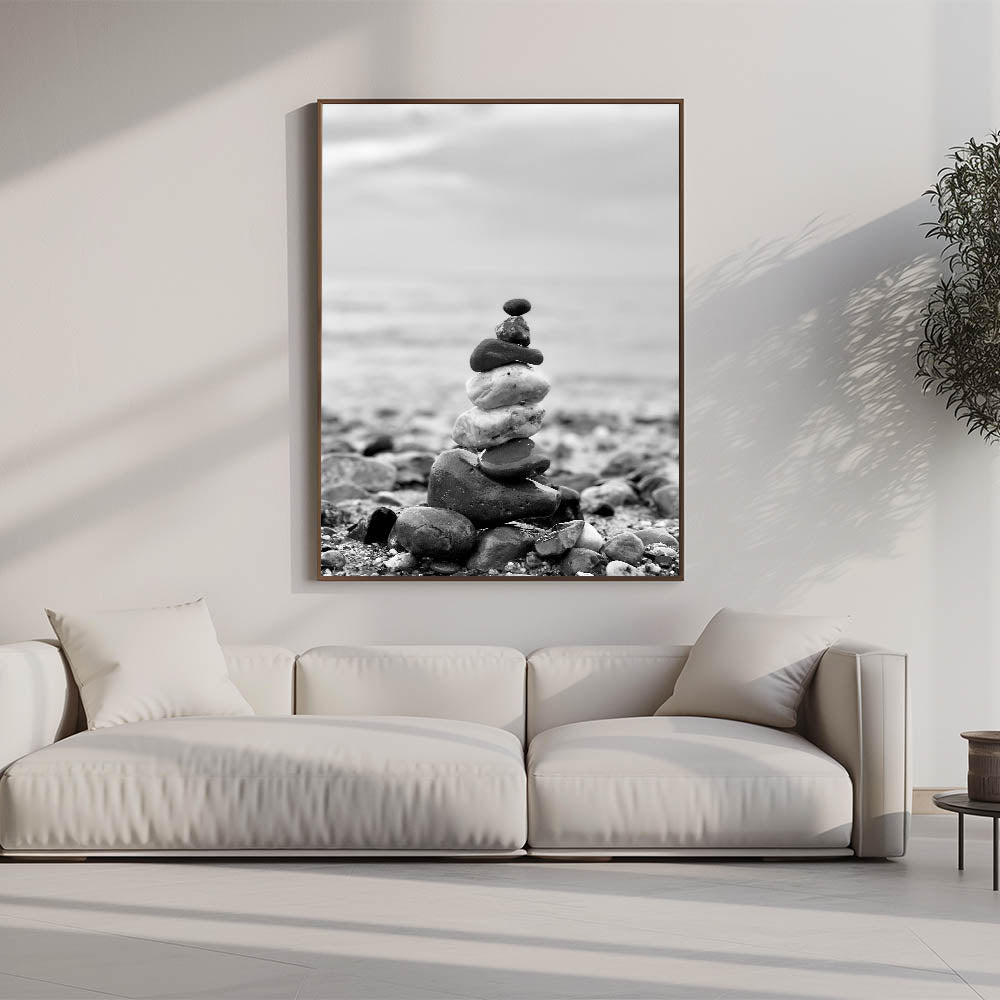 This stunning black and white coastal wall art features a simple yet profound image of stacked stones on a beach. The minimalist composition brings a sense of balance and tranquility, making it perfect for coastal-inspired and modern decor. The stones, carefully balanced against the soft backdrop of the ocean, create a meditative atmosphere that adds a calming focal point to any room.