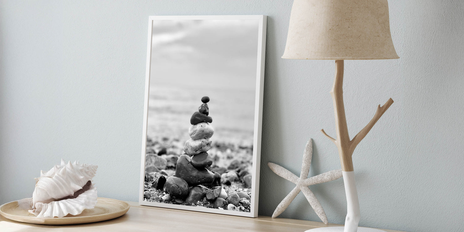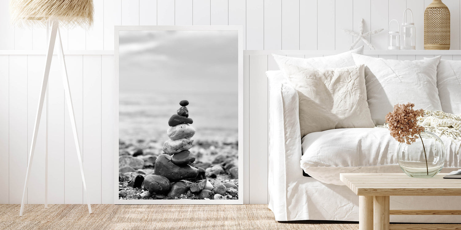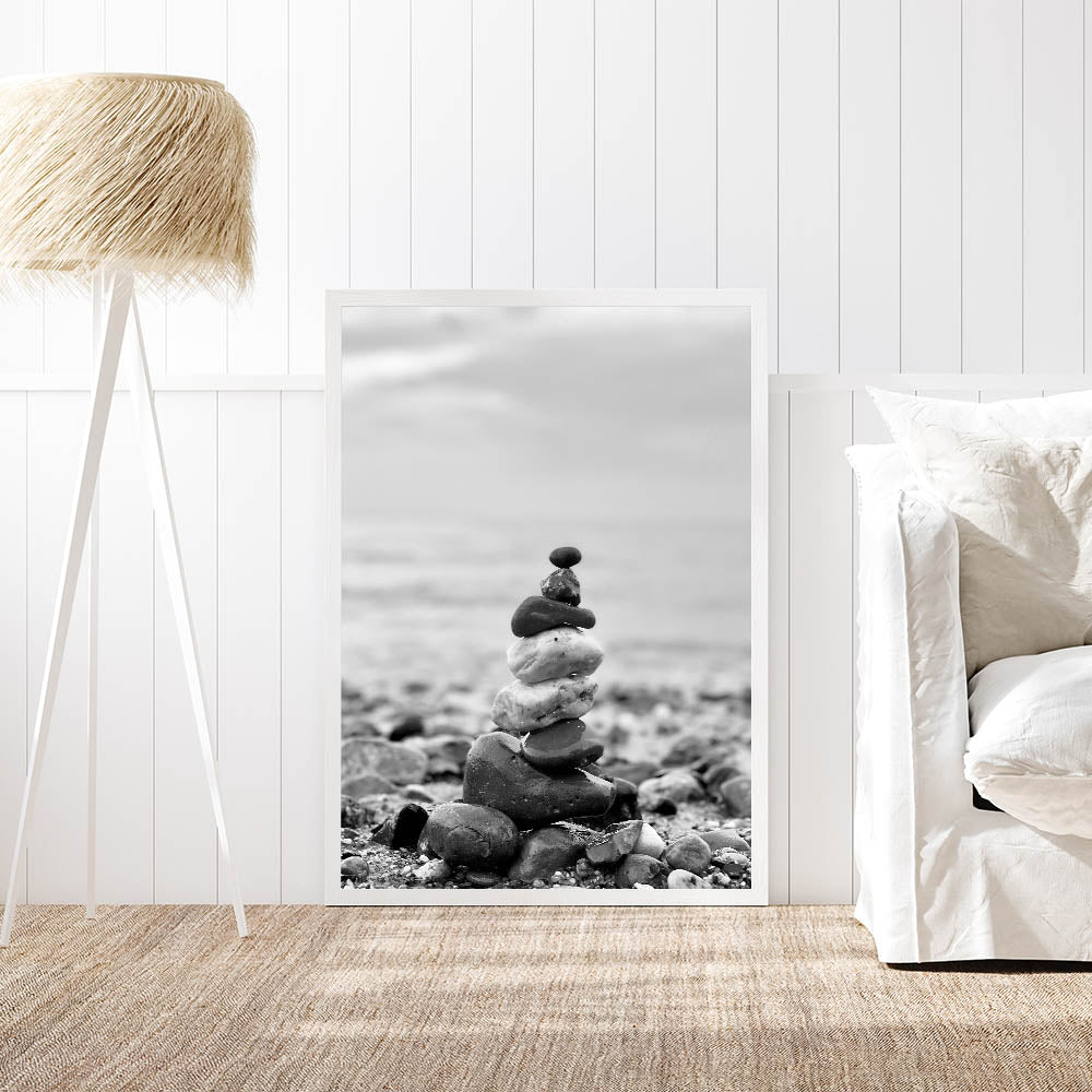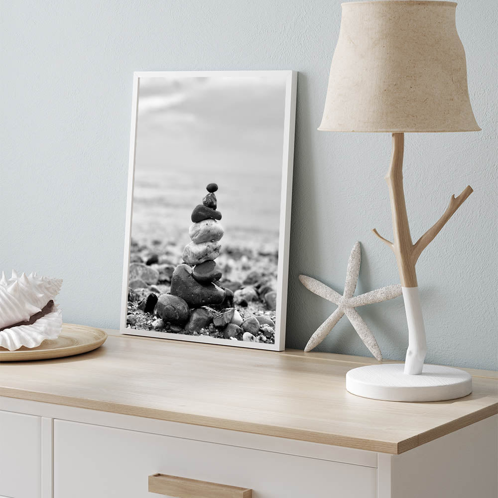 Coastal Wall Art - Black and White Stacked Stones Beach-Themed Print