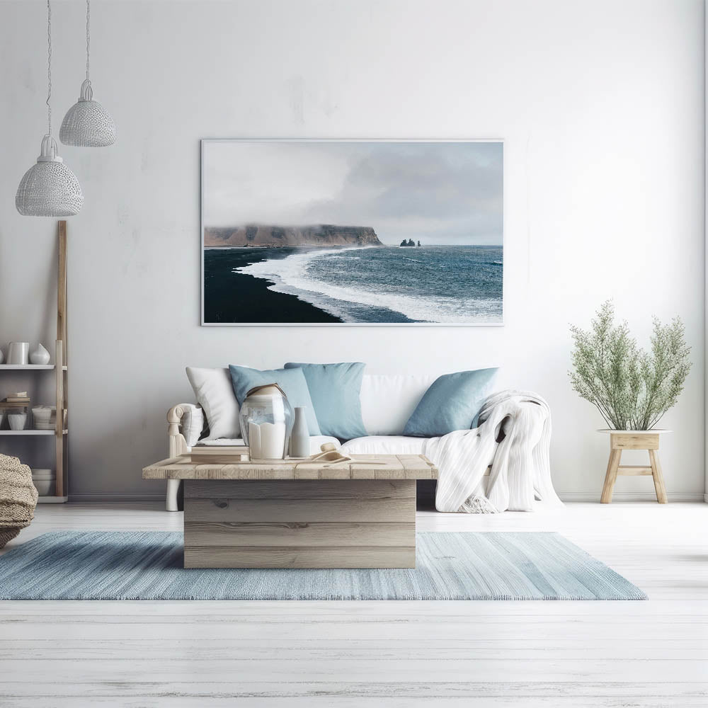 Bring the serene beauty of the ocean into your home with this captivating coastal scenery artwork. This stunning print captures the raw power of the sea as it crashes against mist-covered cliffs, creating an ambiance of peace and tranquility. Perfect for any room, this beach-themed art piece is ideal for adding a nautical touch to your space.
