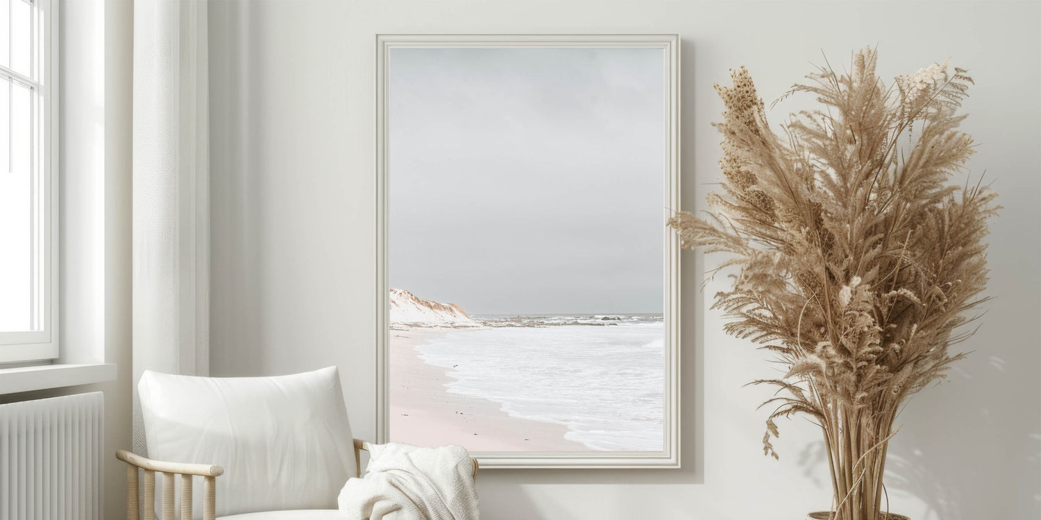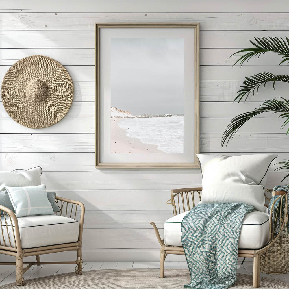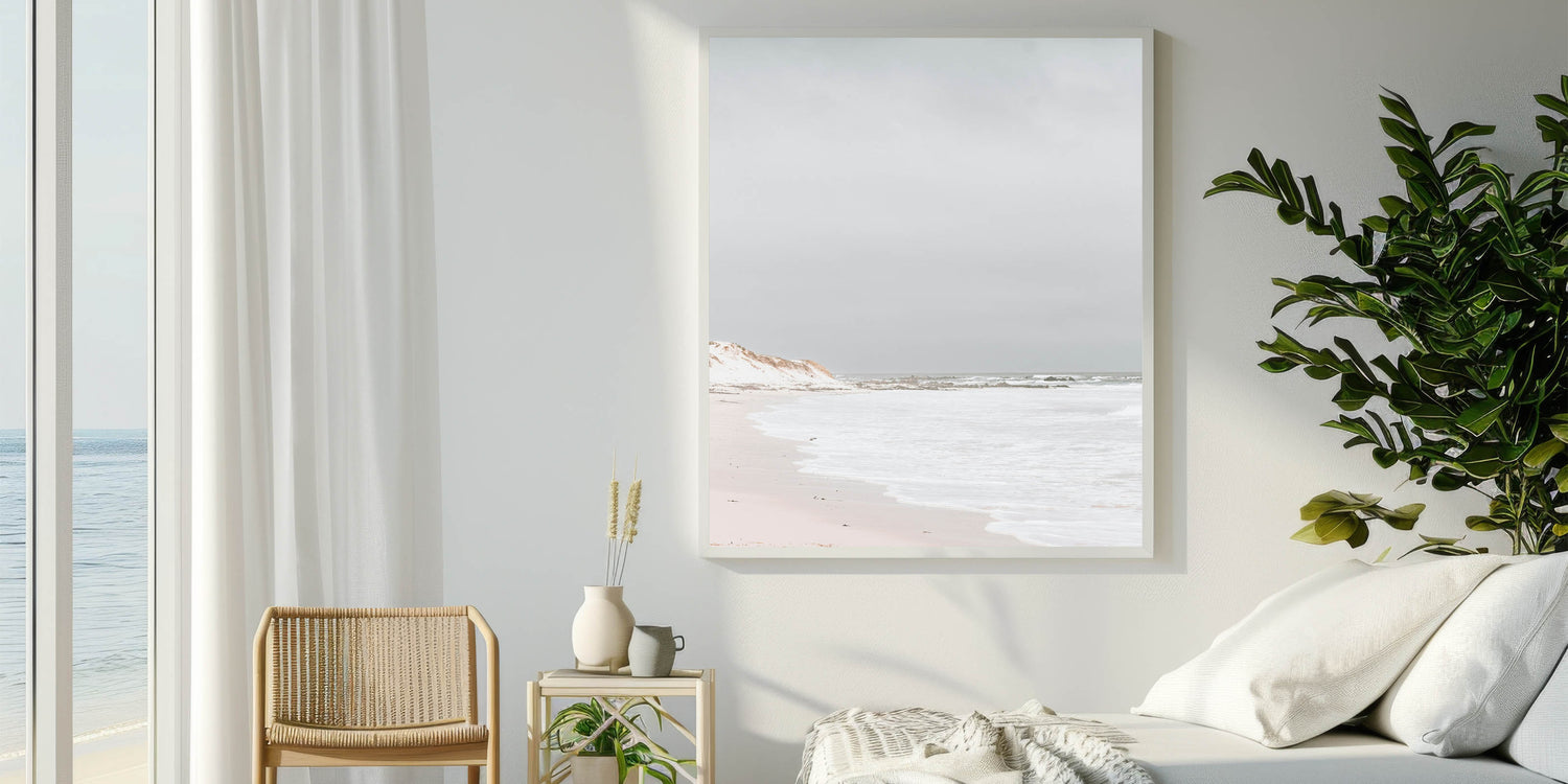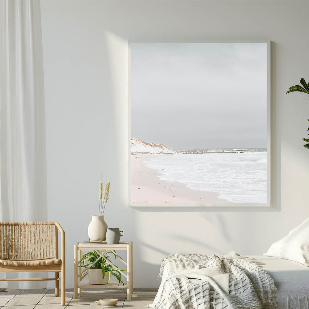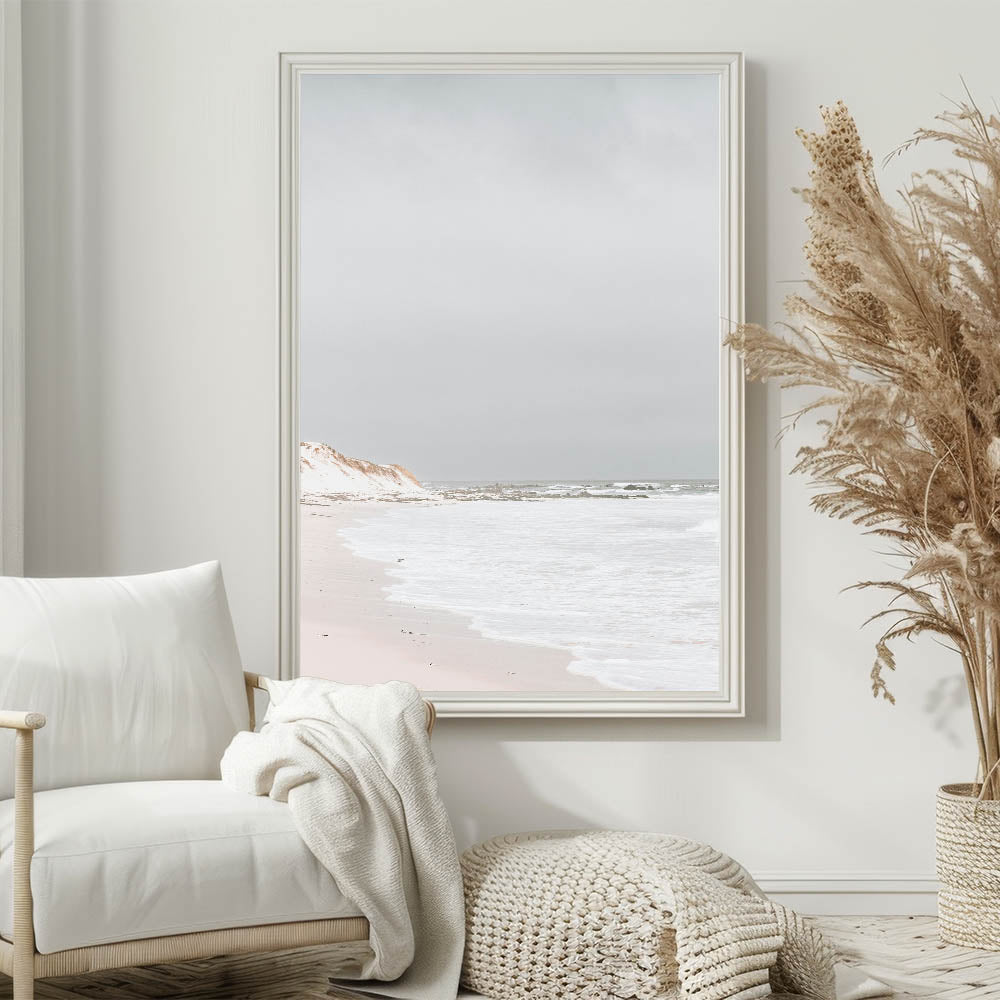 This minimalist coastal wall art features a serene, sandy shoreline under a muted, overcast sky. Perfect for creating a calm and peaceful atmosphere, this artwork brings the tranquility of the coast into any room. With soft, neutral tones, it is an ideal choice for those looking to add a touch of coastal serenity to modern or minimalist spaces. The gentle waves and expansive beachscape evoke a sense of endless horizons, making it a perfect piece for living rooms, bedrooms, or even office environments.