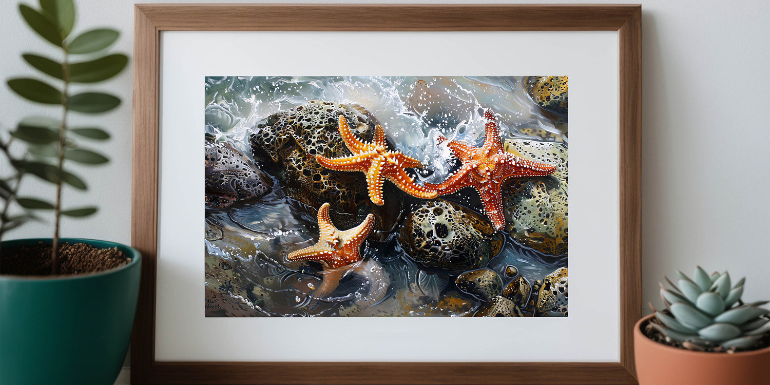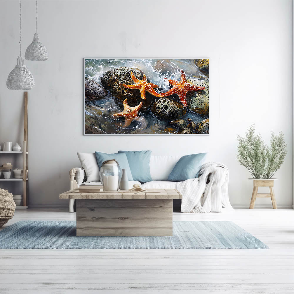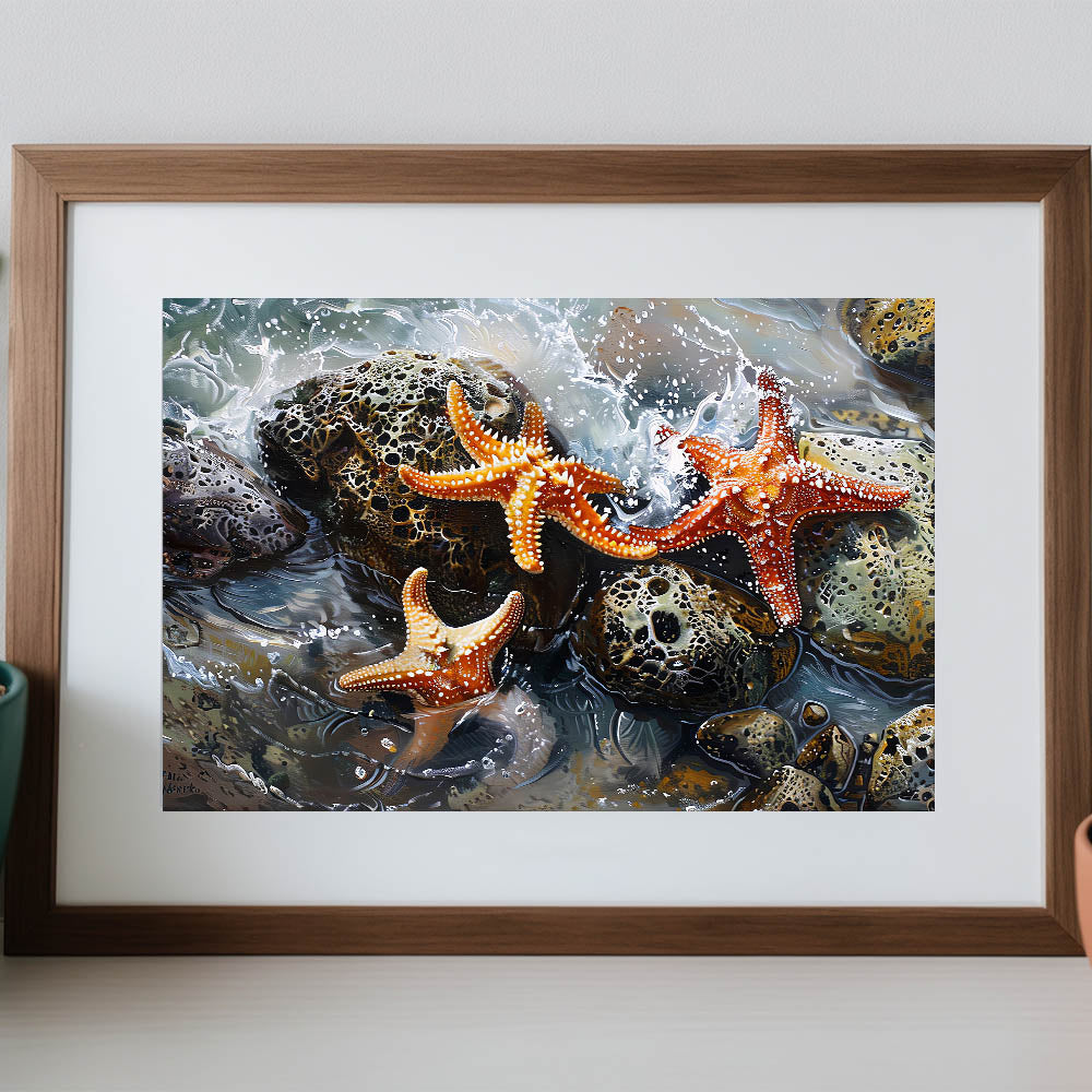 Capture the essence of seaside life with this vibrant piece of coastal wall art featuring starfish amidst the waves and rocks. The intricate details of the starfish and the swirling ocean make this a stunning focal point for any beach-inspired room. The rich, earthy tones mixed with ocean blues create an eye-catching contrast, perfect for those who want to bring a bit of the seaside into their homes.