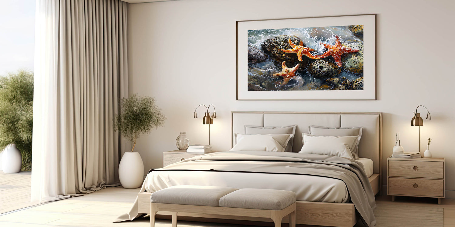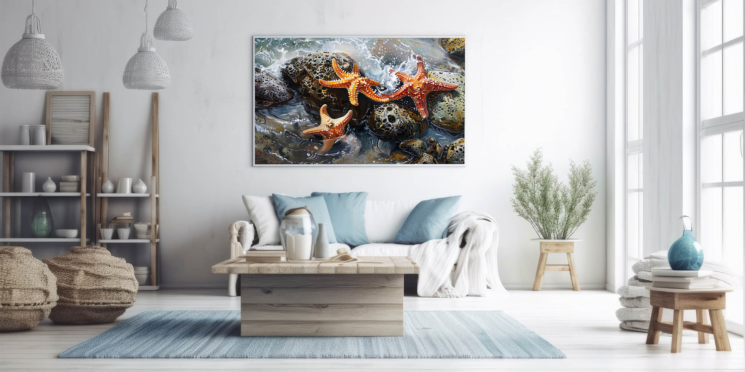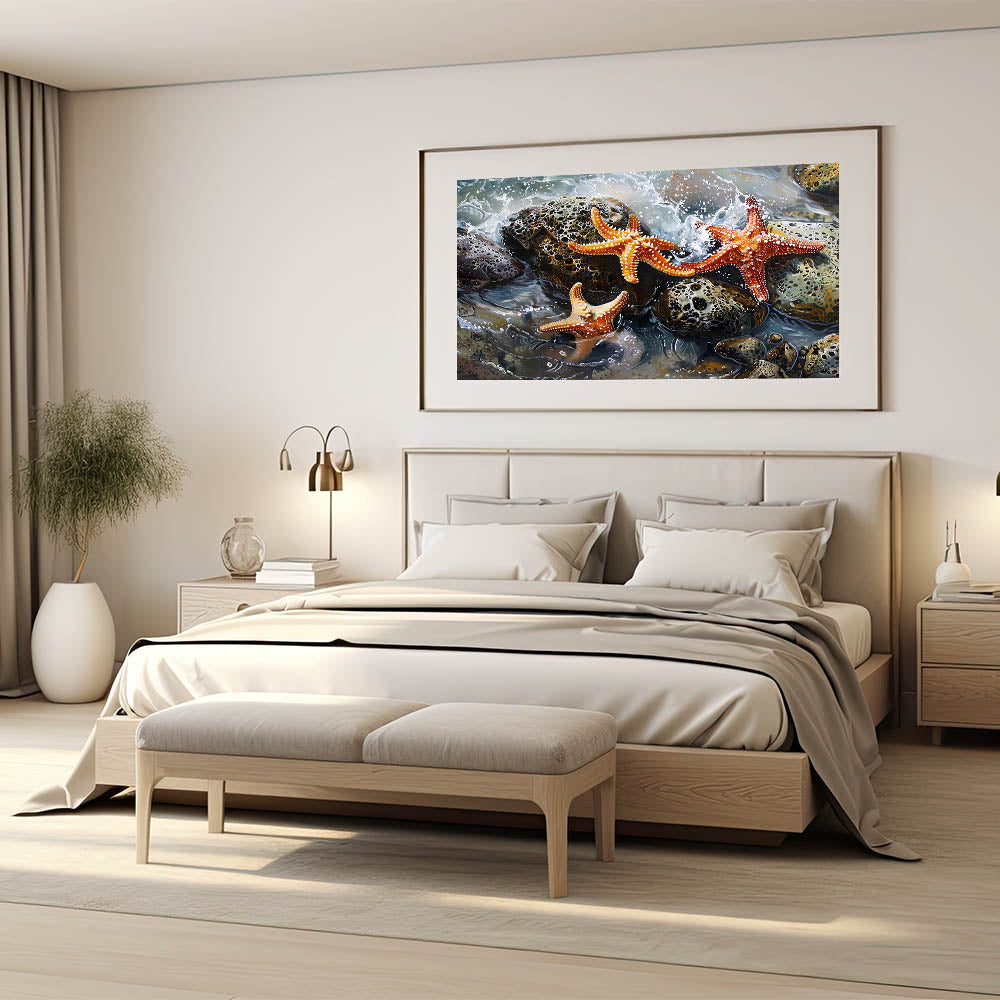 Capture the essence of seaside life with this vibrant piece of coastal wall art featuring starfish amidst the waves and rocks. The intricate details of the starfish and the swirling ocean make this a stunning focal point for any beach-inspired room. The rich, earthy tones mixed with ocean blues create an eye-catching contrast, perfect for those who want to bring a bit of the seaside into their homes.