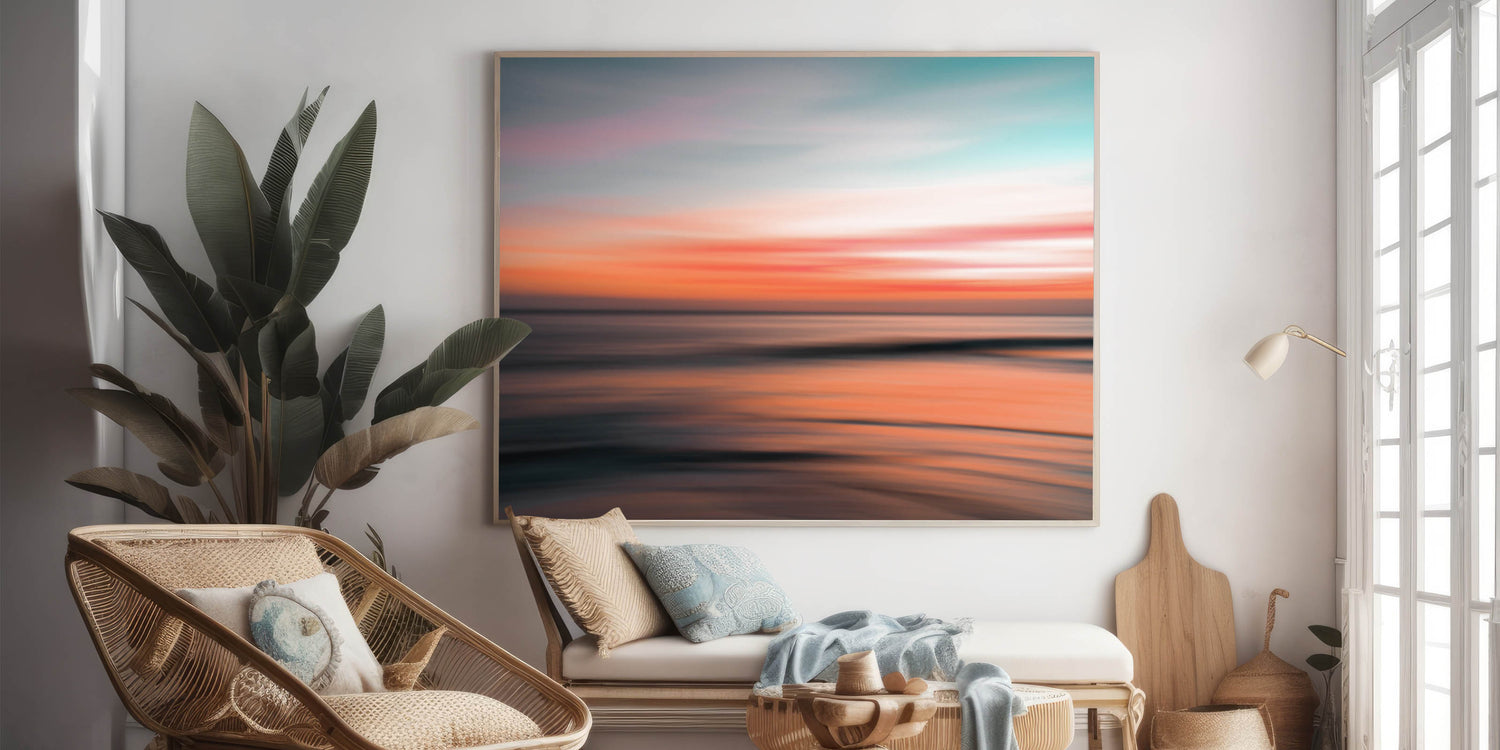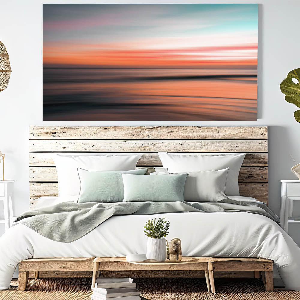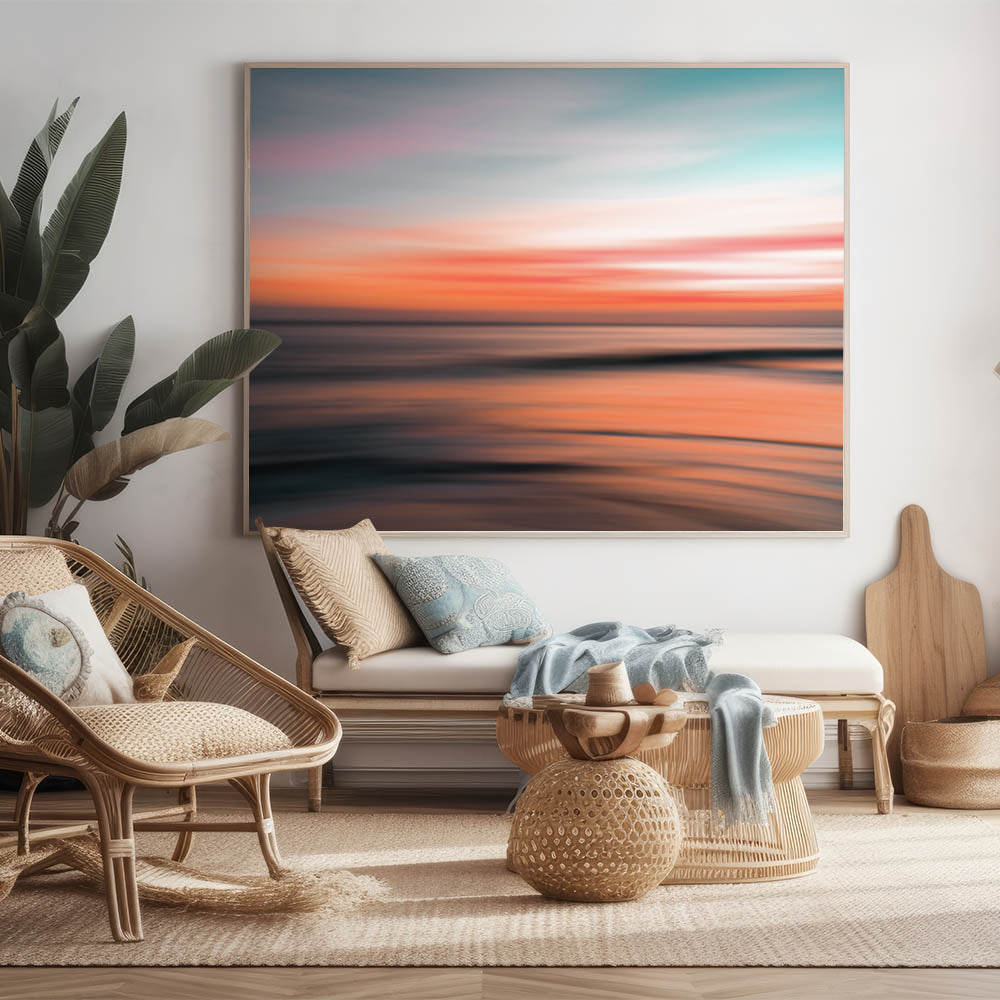 Elevate your space with this stunning piece of abstract coastal wall art featuring a vibrant, glowing sunset. The soft blend of pink, orange, and teal hues captures the essence of a serene seaside evening, making this artwork an ideal choice for any room seeking a touch of calm and beauty. The blurred motion effect gives the sunset a dreamlike quality, perfect for modern coastal-inspired decor.