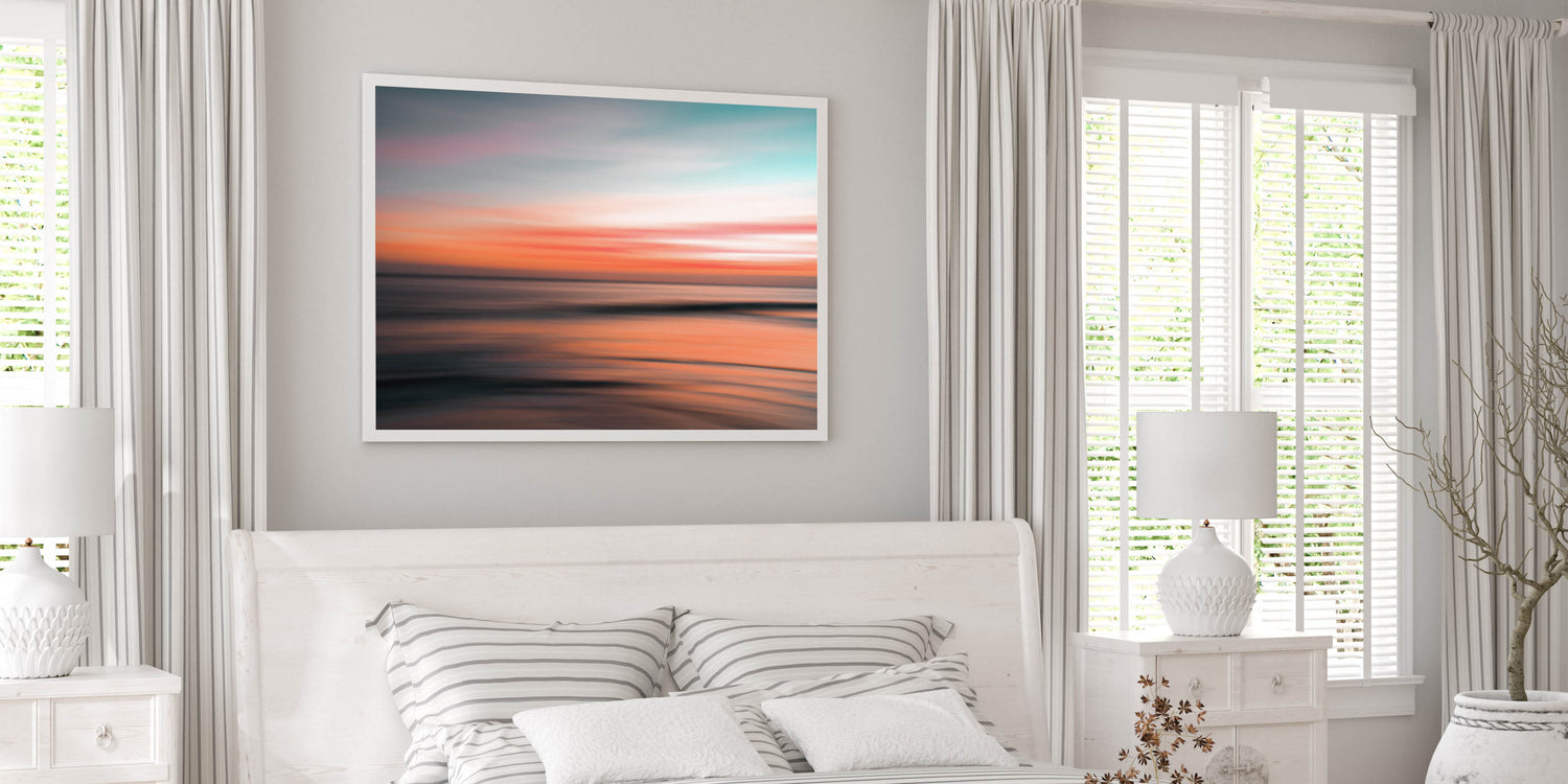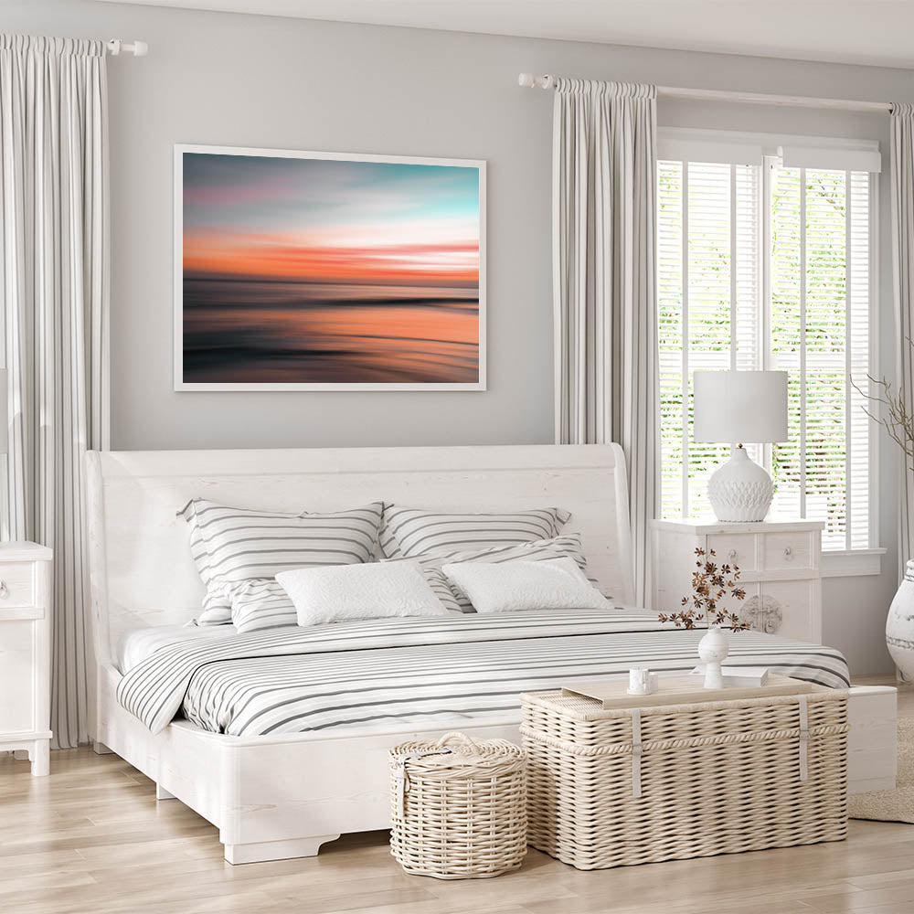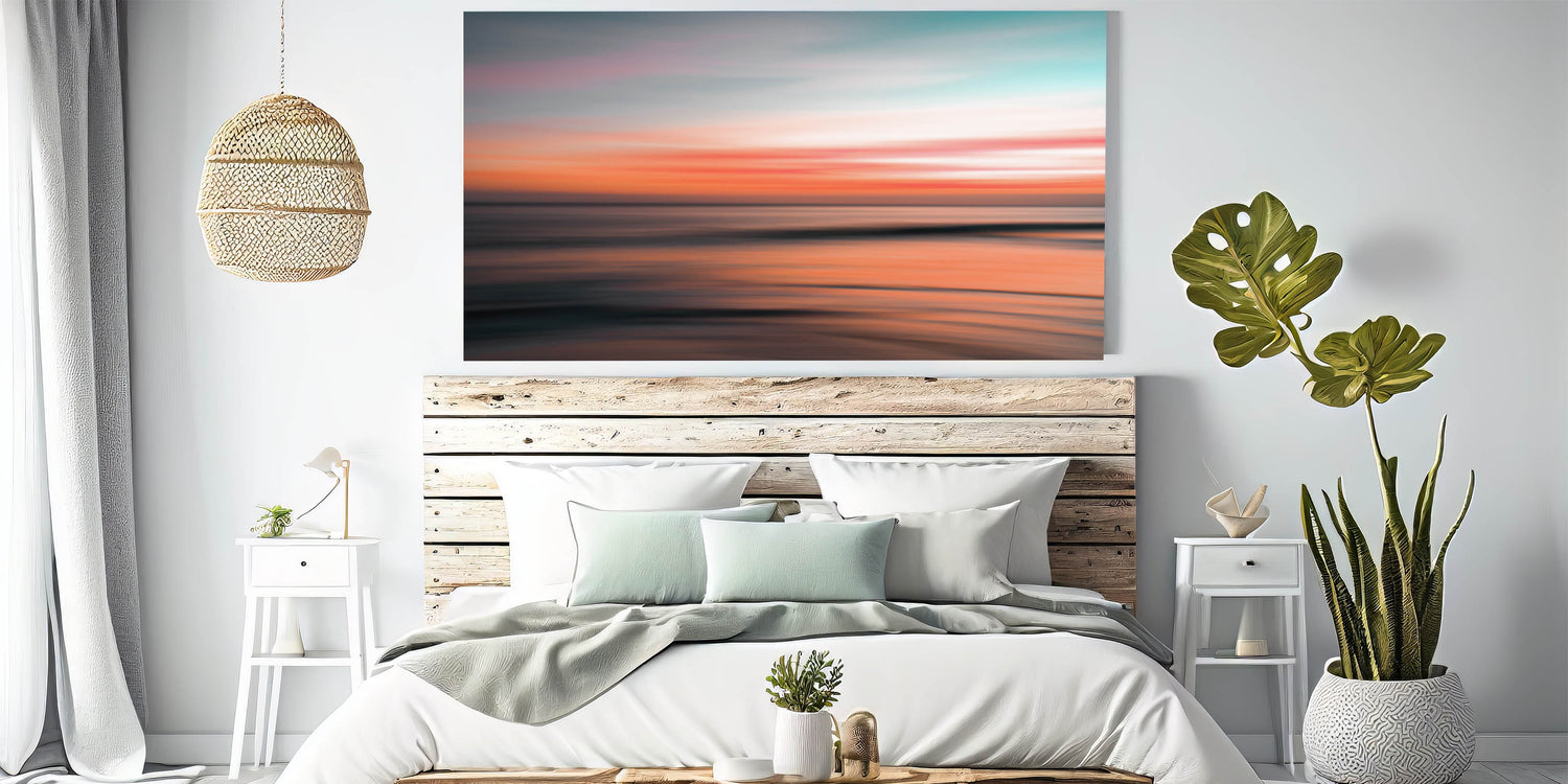 Elevate your space with this stunning piece of abstract coastal wall art featuring a vibrant, glowing sunset. The soft blend of pink, orange, and teal hues captures the essence of a serene seaside evening, making this artwork an ideal choice for any room seeking a touch of calm and beauty. The blurred motion effect gives the sunset a dreamlike quality, perfect for modern coastal-inspired decor.