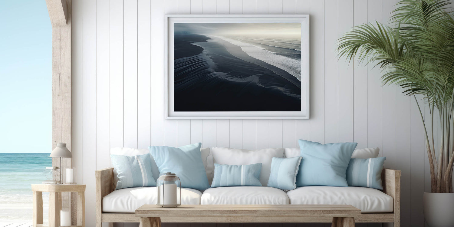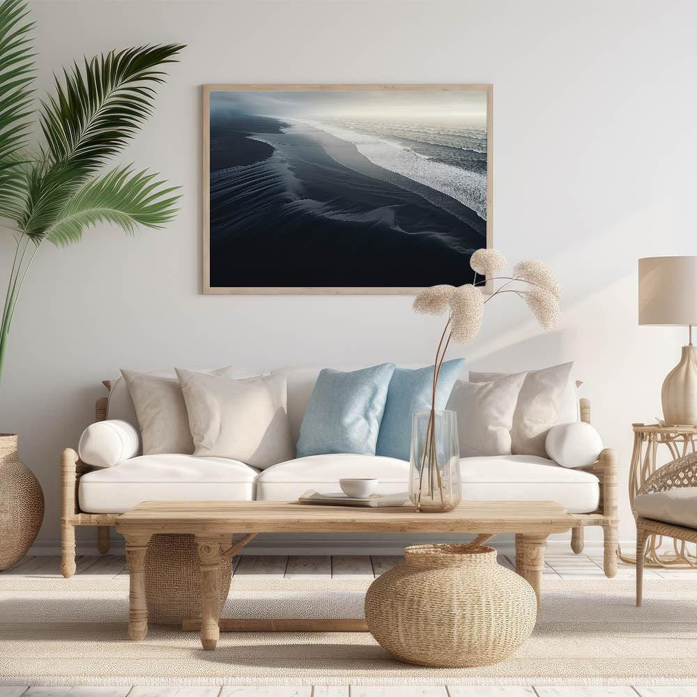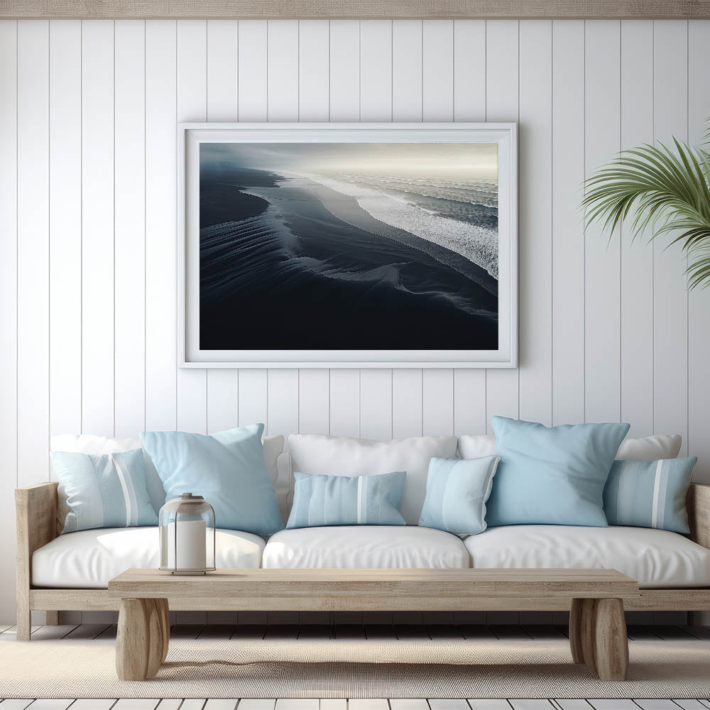Add a sense of mystery and depth to your space with this dark coastal beach wall art. Featuring deep, dark sands and misty waves rolling gently onto the shore, this artwork captures the dramatic beauty of the ocean in a moody and atmospheric style. The soft gradients of gray and black create a tranquil yet powerful contrast, making this piece perfect for those who appreciate the raw and untamed nature of the sea. Its minimalist and serene design makes it an excellent addition to modern, contemporary, or beach-themed decor.