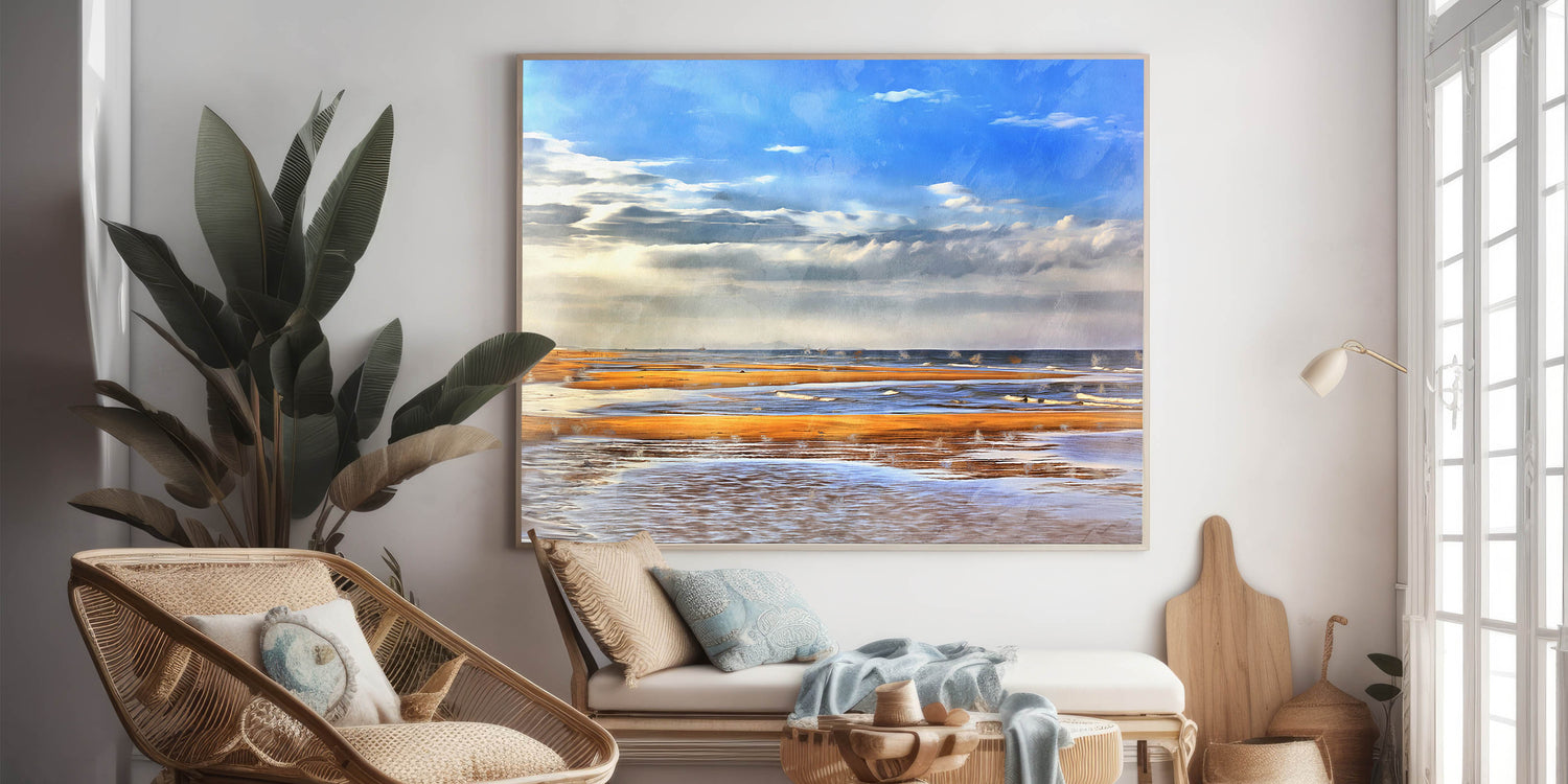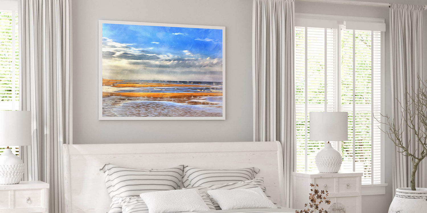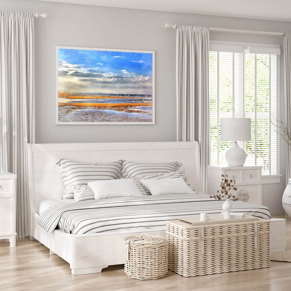 Let the calming beauty of the ocean and warm sands transport you to the beach. Whether you're decorating a beach house or looking to add a coastal touch to your home, this print will create a peaceful and inviting atmosphere.