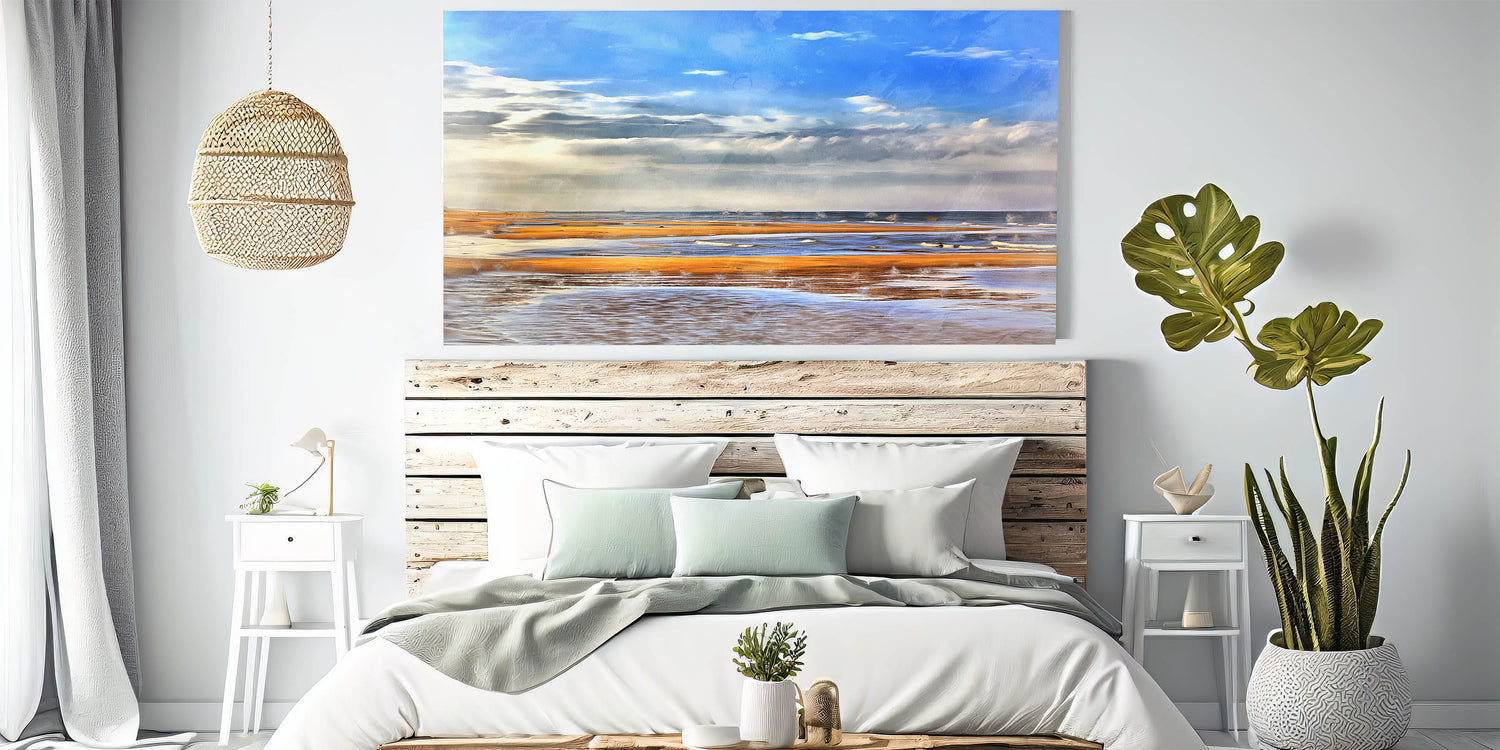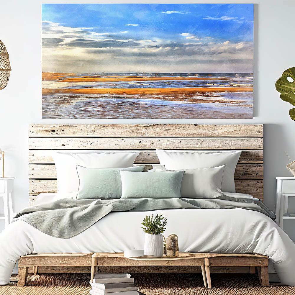 Brighten your space with the stunning beauty of this golden beach coastal wall art. Featuring soft waves lapping against the shore under a vibrant blue sky, this artwork captures the peaceful and serene nature of a day at the beach. The warm tones of the sand and water blend perfectly with the tranquil sky, making this piece ideal for any coastal, nautical, or beach-themed decor. This artwork will bring the charm of a seaside retreat into your living space, adding a touch of warmth and serenity to your home.