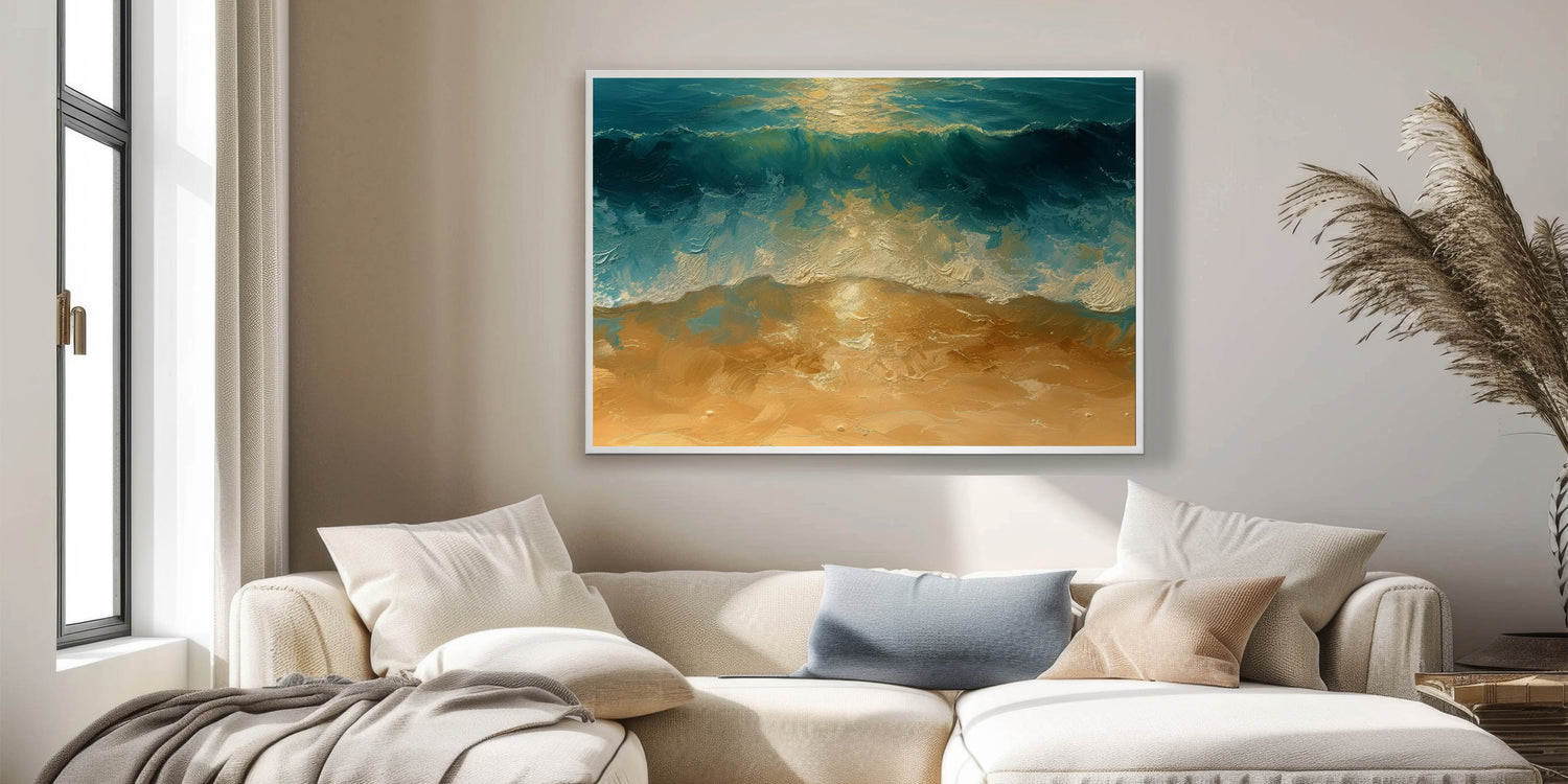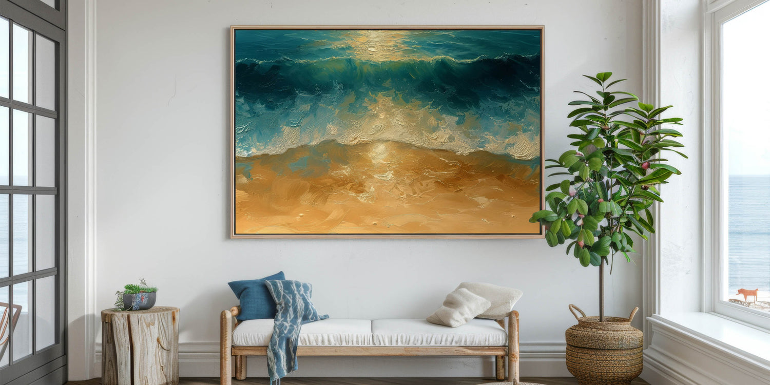Bring the beauty of the beach into your home with this stunning coastal wall art, featuring vibrant golden sands and deep ocean waves. The rich texture and dynamic brushstrokes create a sense of movement, capturing the power and tranquility of the sea as it meets the shore. The striking contrast between the golden sand and dark blue waves makes this artwork a perfect statement piece for any coastal or beach-inspired space.