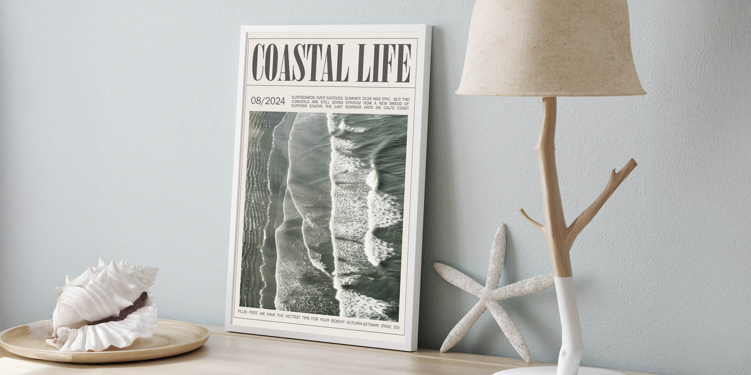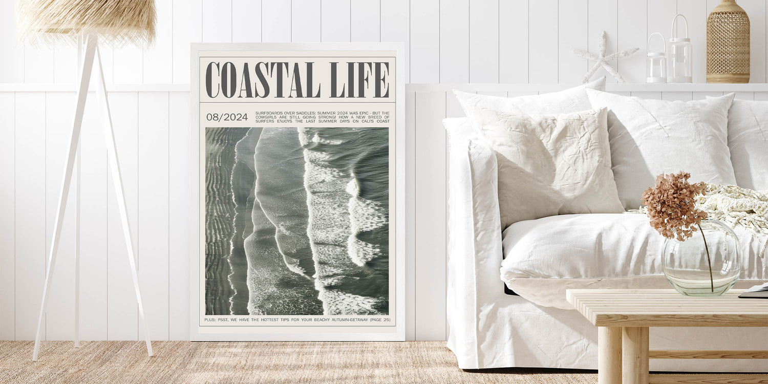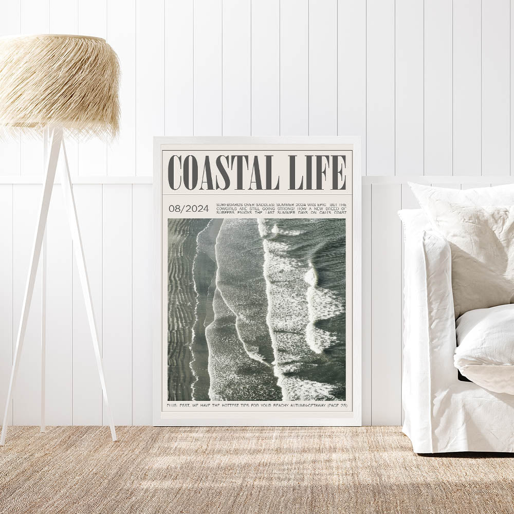 Capture the rhythm of the ocean with this vintage magazine-style coastal wall art. Showcasing an aerial view of waves rolling onto the shore, this design brings the timeless beauty and dynamic motion of the sea into your space. Framed as a classic magazine cover, the artwork not only reflects the coastal lifestyle but also adds a unique editorial touch to your decor. The muted, natural hues of the waves and sand blend effortlessly with various color schemes, making it an ideal choice for modern, minimalist, and beach-themed interiors alike. Perfect for living rooms, offices, or beach houses, this piece evokes a sense of calm and nostalgia, transporting you to the coast with every glance.