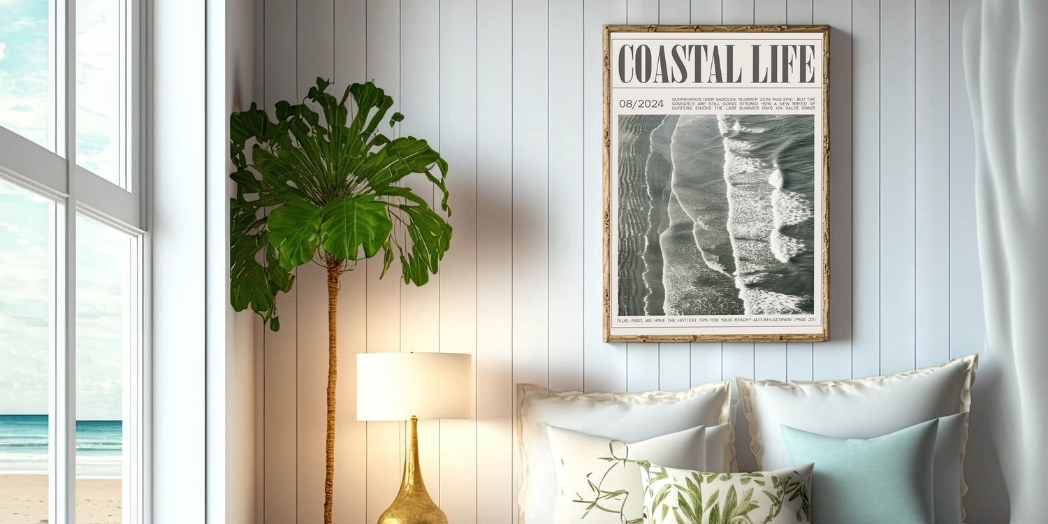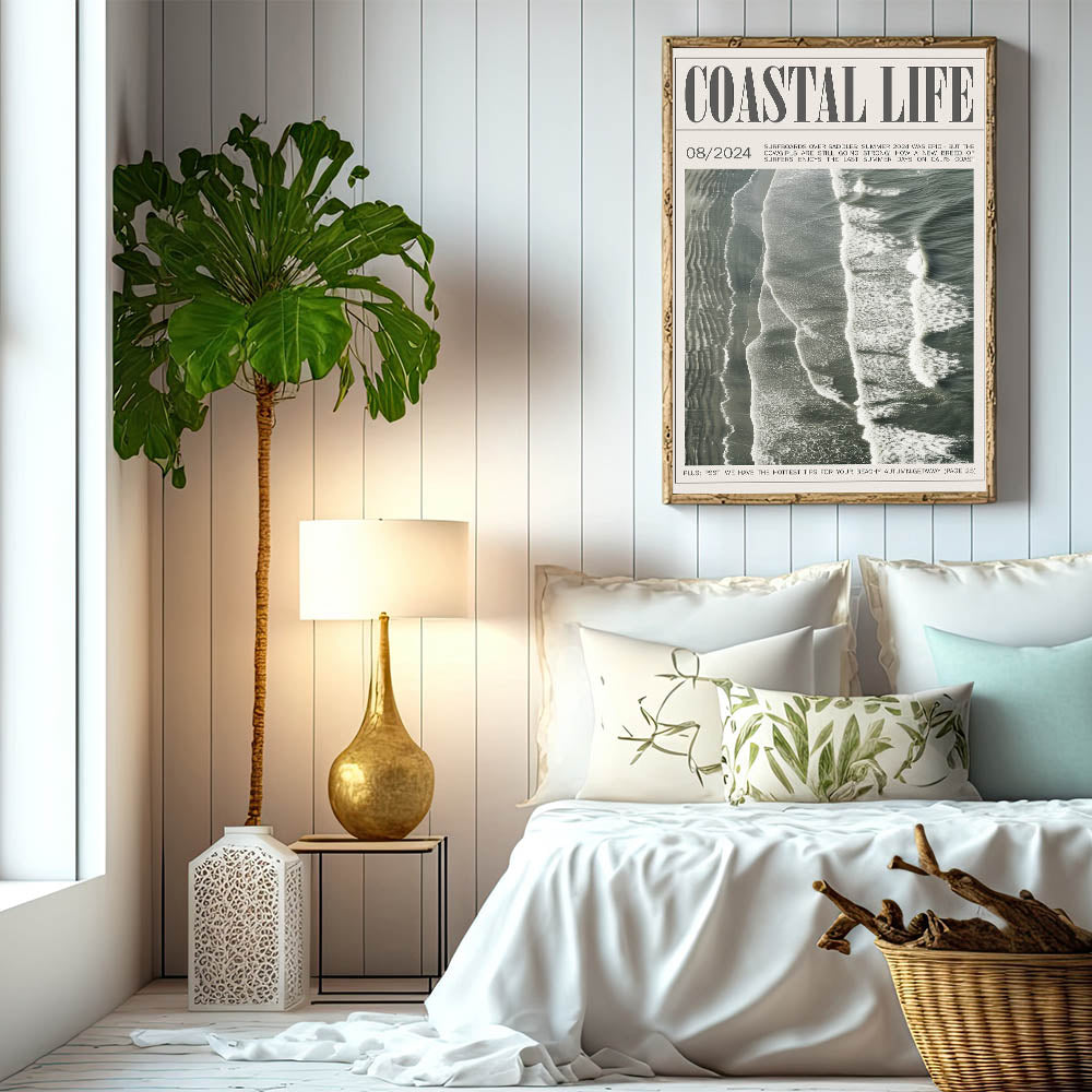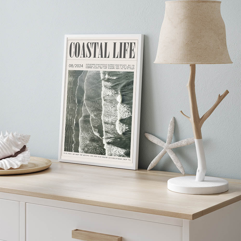 Capture the rhythm of the ocean with this vintage magazine-style coastal wall art. Showcasing an aerial view of waves rolling onto the shore, this design brings the timeless beauty and dynamic motion of the sea into your space. Framed as a classic magazine cover, the artwork not only reflects the coastal lifestyle but also adds a unique editorial touch to your decor. The muted, natural hues of the waves and sand blend effortlessly with various color schemes, making it an ideal choice for modern, minimalist, and beach-themed interiors alike. Perfect for living rooms, offices, or beach houses, this piece evokes a sense of calm and nostalgia, transporting you to the coast with every glance.
