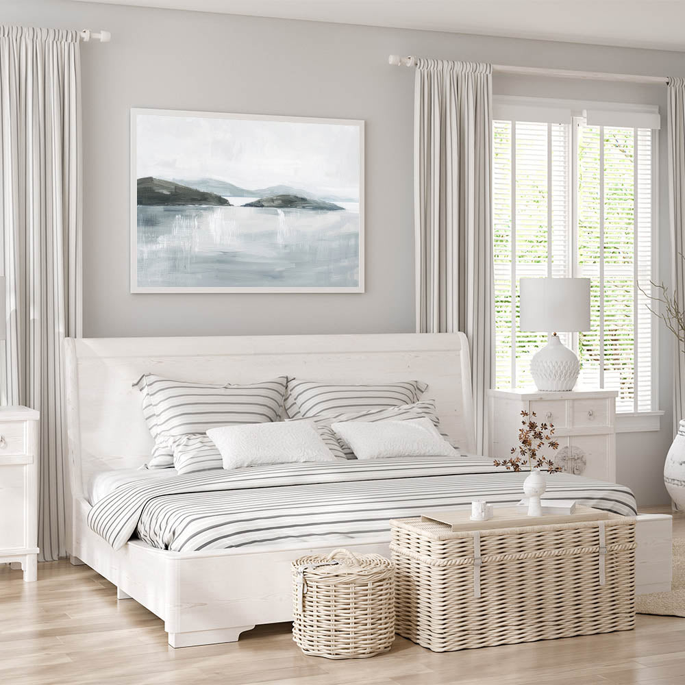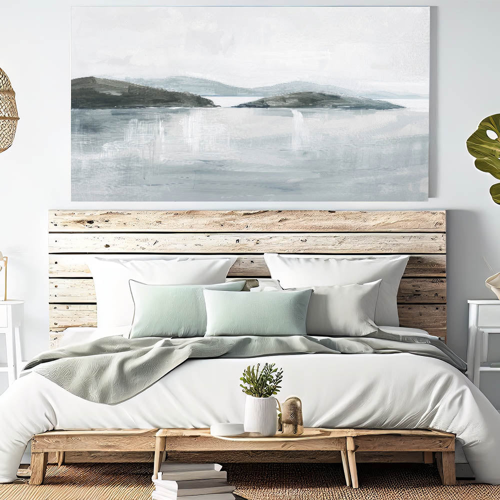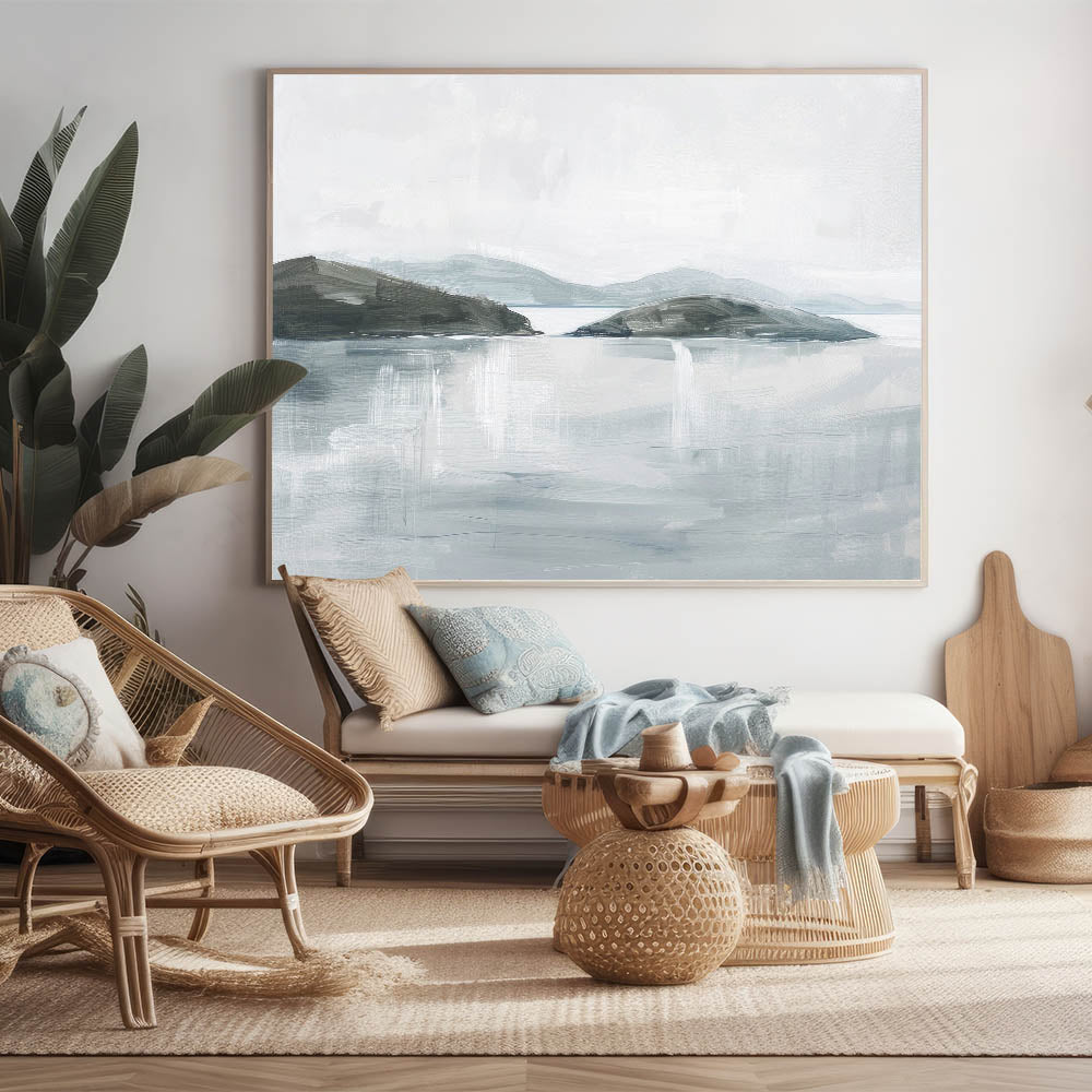 Create a peaceful atmosphere in your home with this minimalist coastal landscape wall art. Featuring soft brushstrokes of tranquil waters and distant hills, this serene seaside artwork captures the quiet beauty of the ocean's horizon. The calming hues of gray and green make this oceanic wall decor ideal for those who seek to bring a sense of relaxation and simplicity into their space. Its clean and modern design makes it a versatile piece that will complement any coastal or minimalist interior.