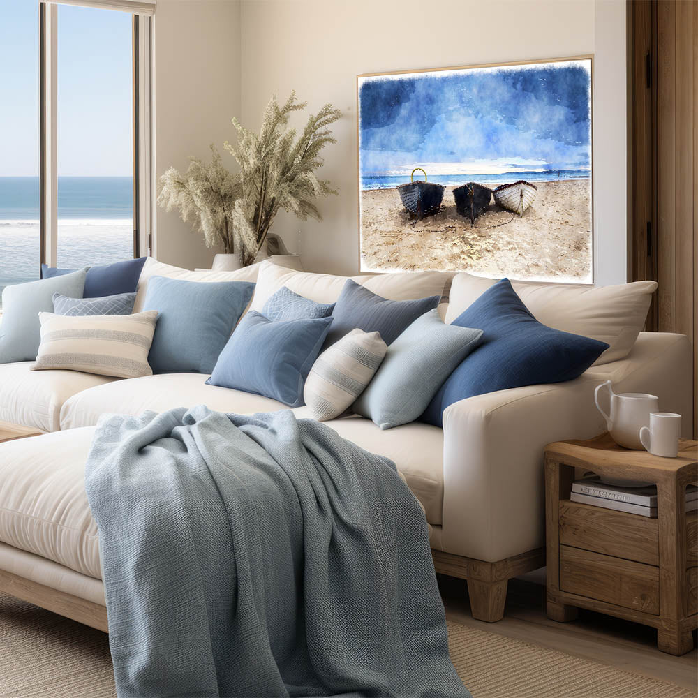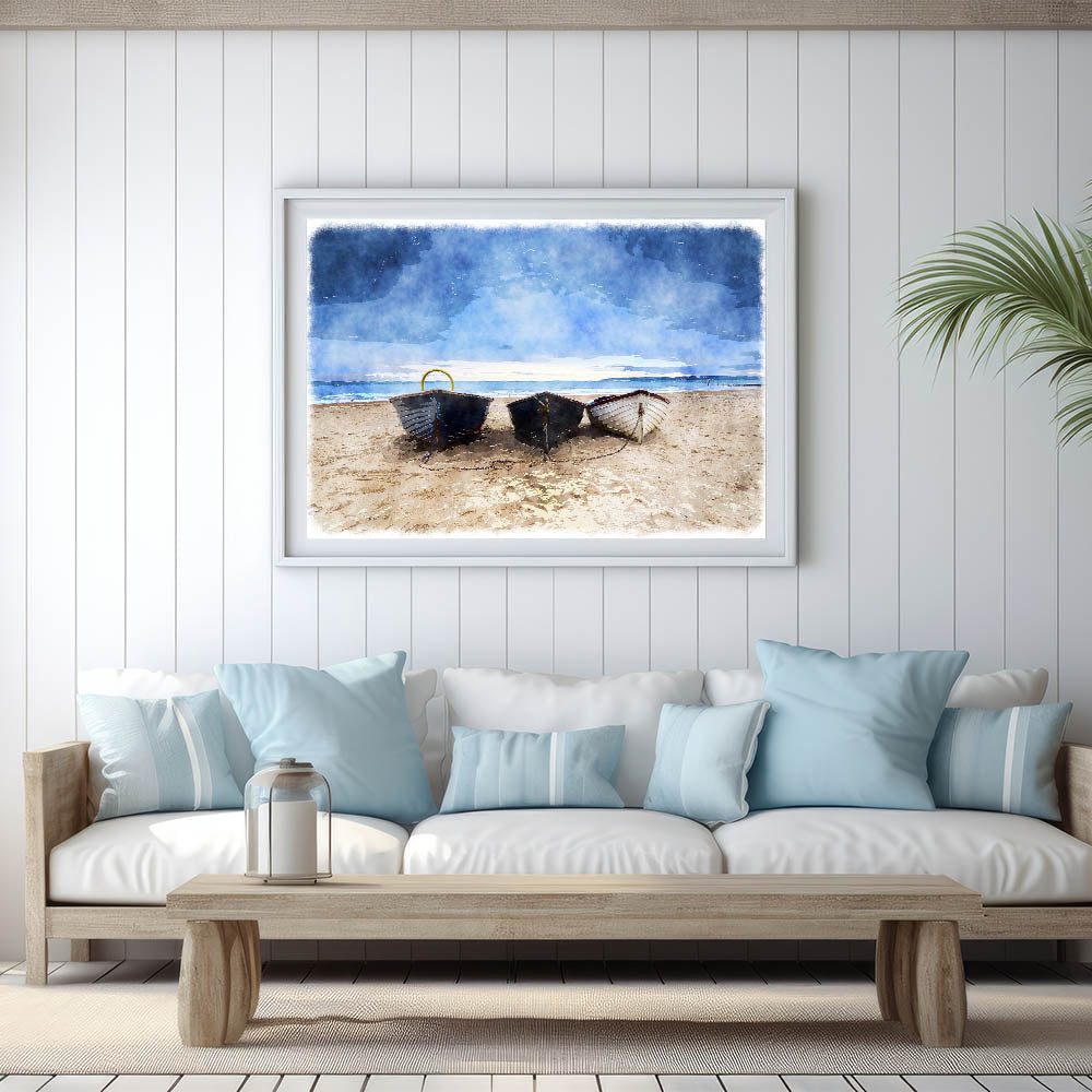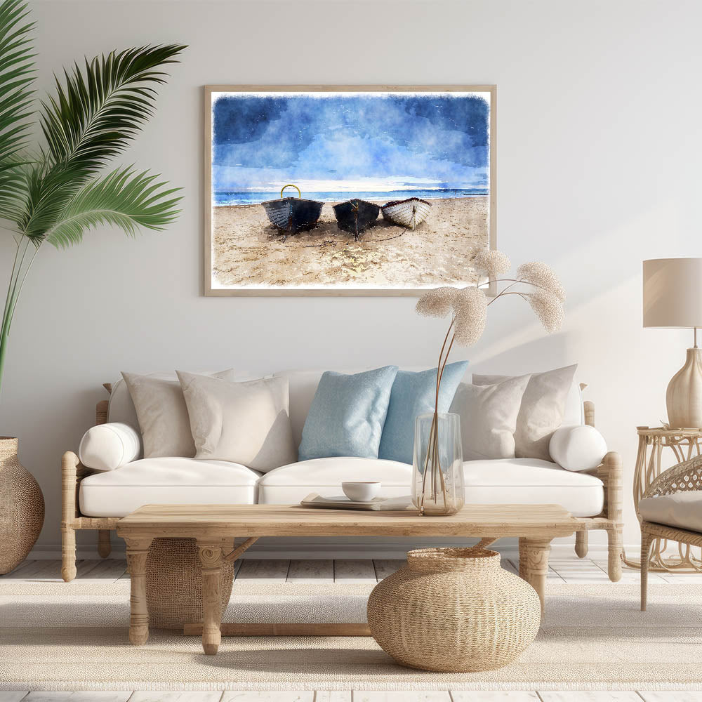 Embrace the serene charm of coastal life with this beautifully crafted nautical decor featuring three boats resting on a sandy shore. This piece captures the calmness of the beach, with soft blues and earthy tones blending to evoke a peaceful, seaside atmosphere. The rustic appeal of the boats, set against a tranquil ocean backdrop, makes this wall art ideal for any beach-themed living room, bedroom, or office space.