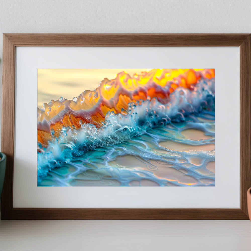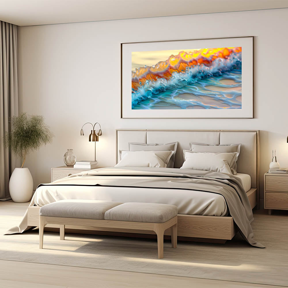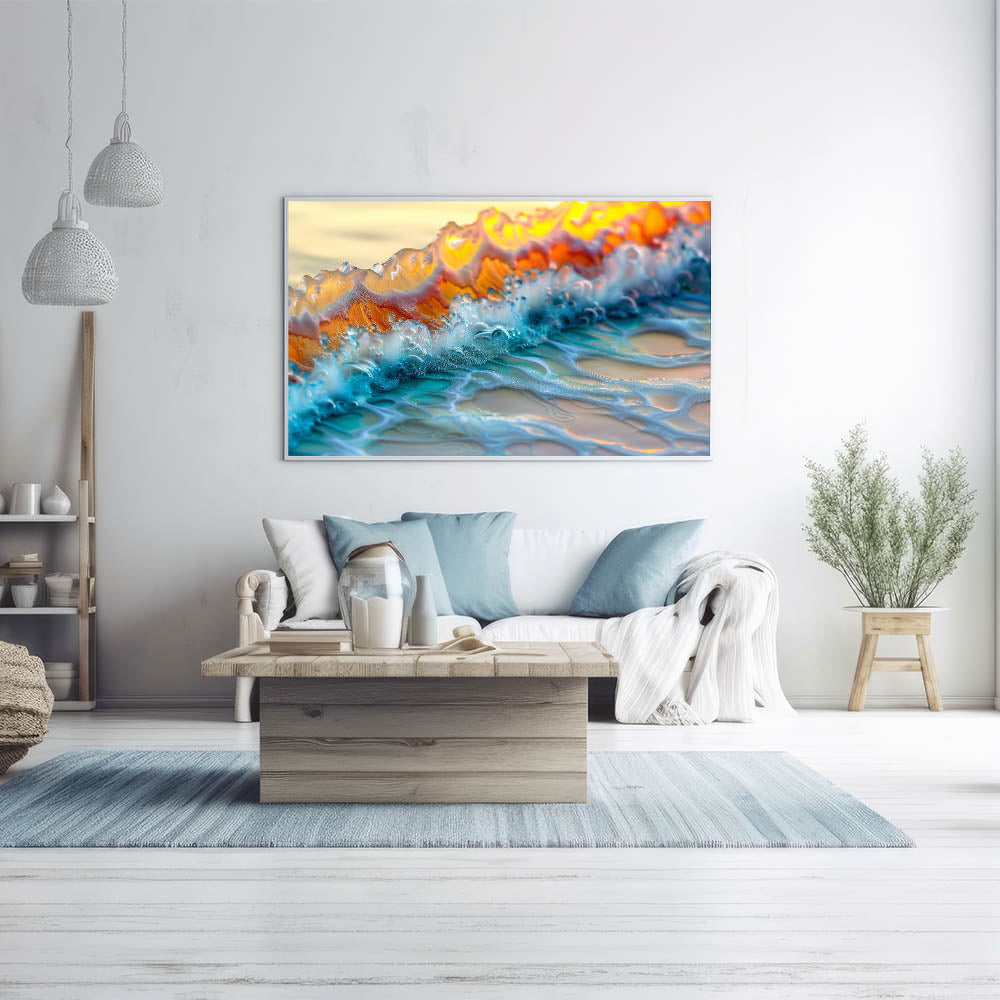 Bring the dynamic energy of the ocean into your home with this stunning piece of coastal wall art. Featuring a close-up of a vibrant wave, this artwork captures the beauty of the sea in striking hues of orange, blue, and teal. The rich colors and fluid motion of the wave create a sense of movement and vitality, making it a perfect centerpiece for any room inspired by the ocean.