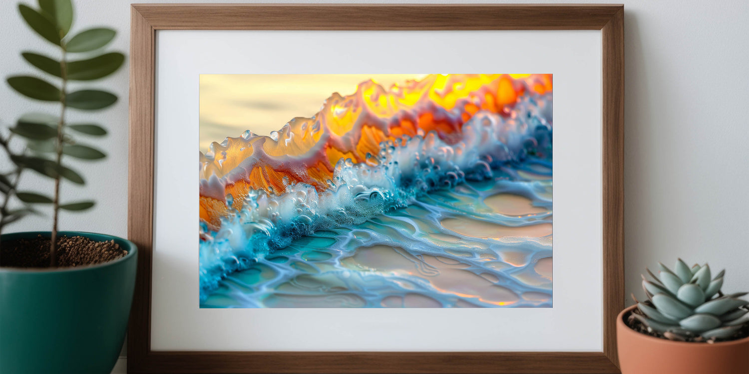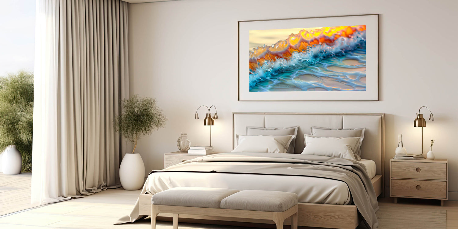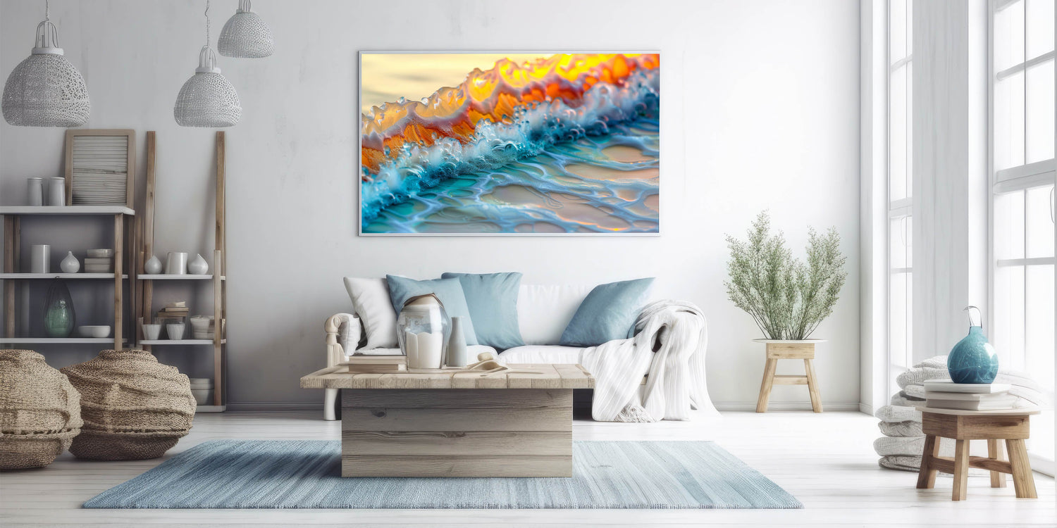 Bring the dynamic energy of the ocean into your home with this stunning piece of coastal wall art. Featuring a close-up of a vibrant wave, this artwork captures the beauty of the sea in striking hues of orange, blue, and teal. The rich colors and fluid motion of the wave create a sense of movement and vitality, making it a perfect centerpiece for any room inspired by the ocean.