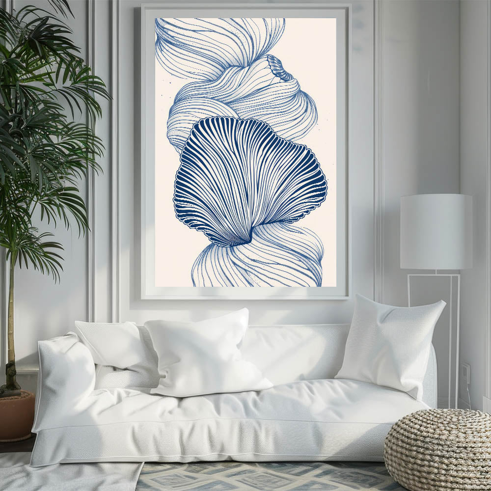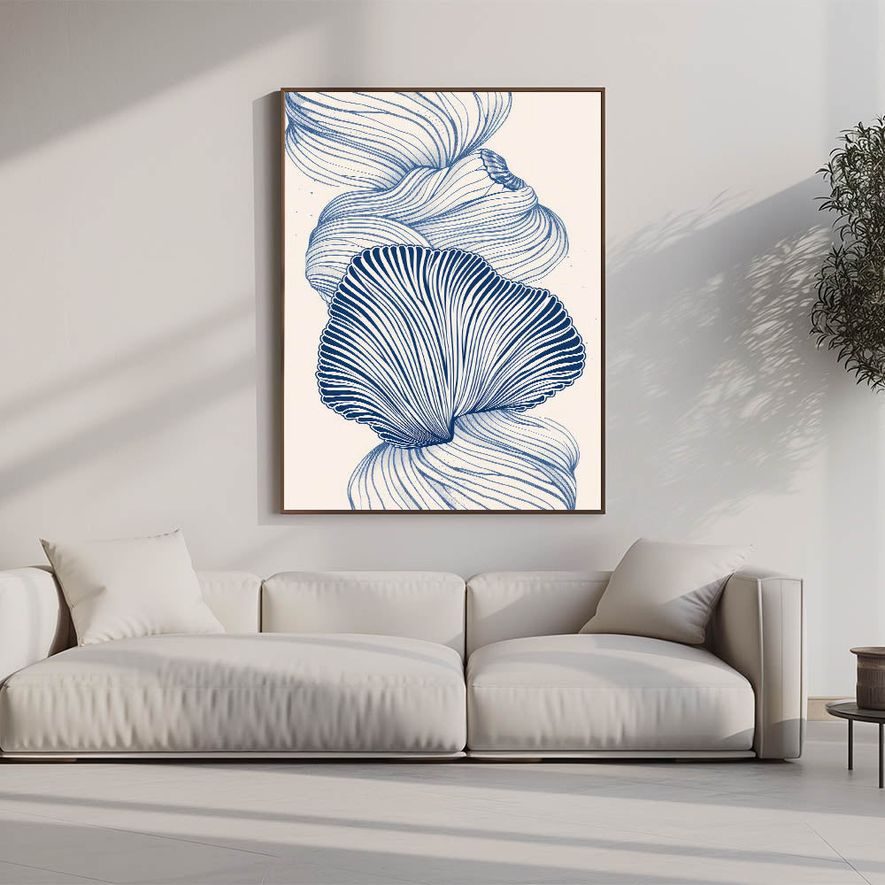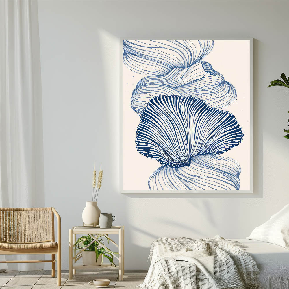 This elegant seashell abstract artwork brings a modern coastal touch to your home. With intricate, flowing lines in deep navy blue tones, this piece highlights the natural beauty and rhythmic patterns of ocean life. The design creates a sense of movement, reminiscent of ocean currents and the delicate forms of seashells, making it an ideal choice for enhancing any beach-themed or coastal-inspired space.
