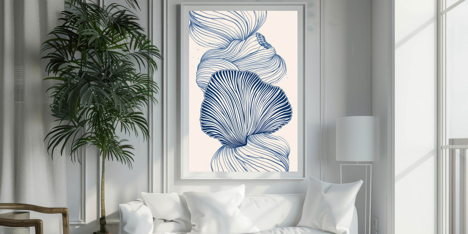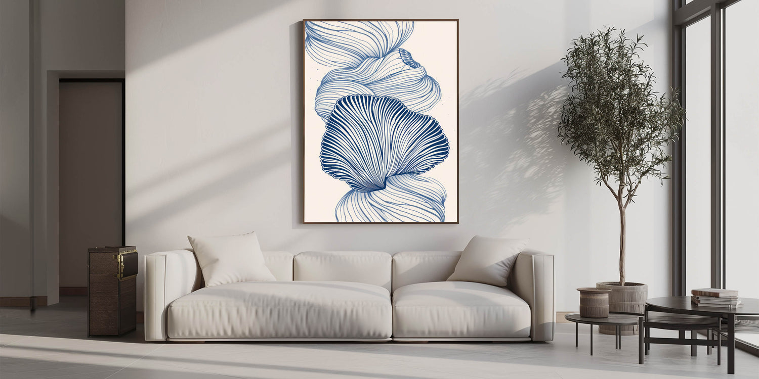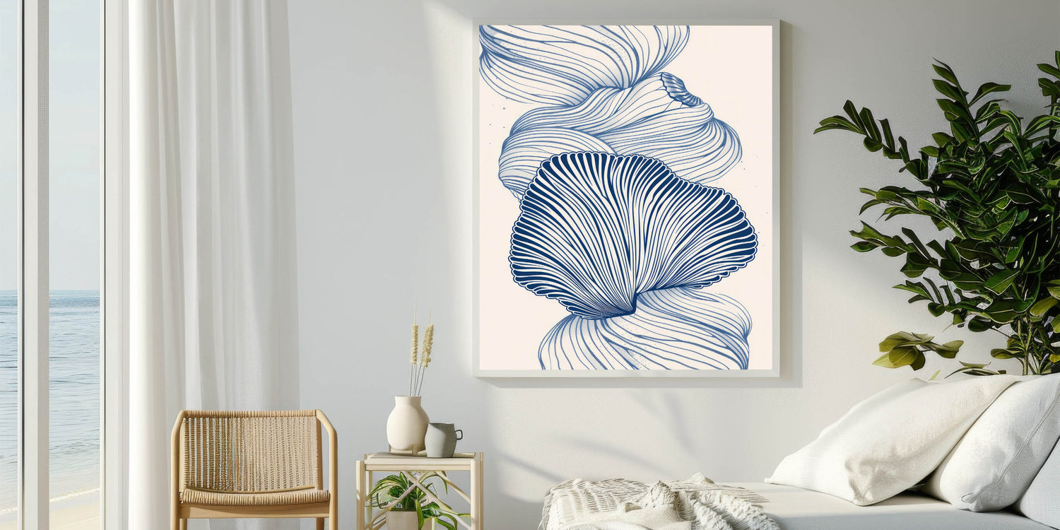 This elegant seashell abstract artwork brings a modern coastal touch to your home. With intricate, flowing lines in deep navy blue tones, this piece highlights the natural beauty and rhythmic patterns of ocean life. The design creates a sense of movement, reminiscent of ocean currents and the delicate forms of seashells, making it an ideal choice for enhancing any beach-themed or coastal-inspired space.