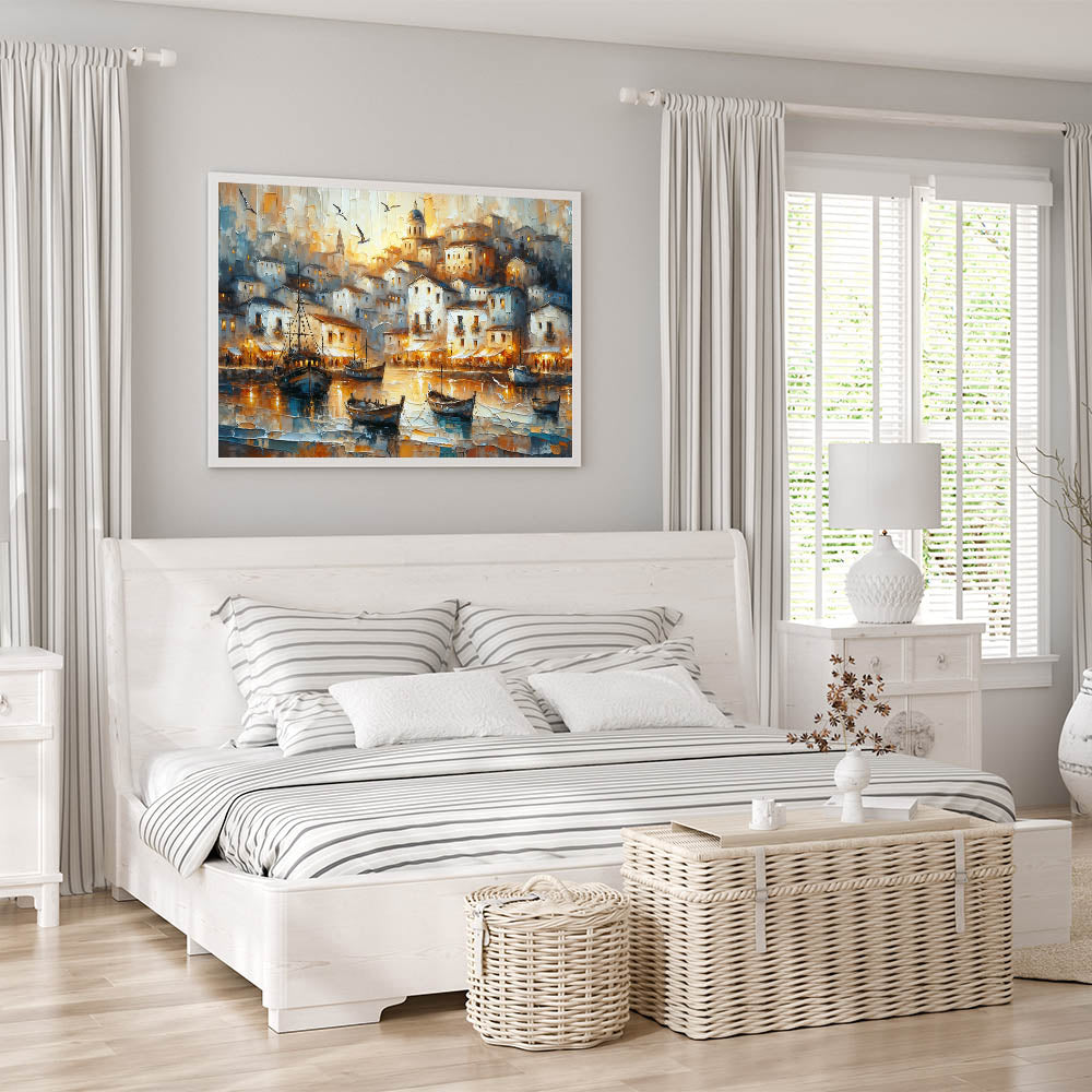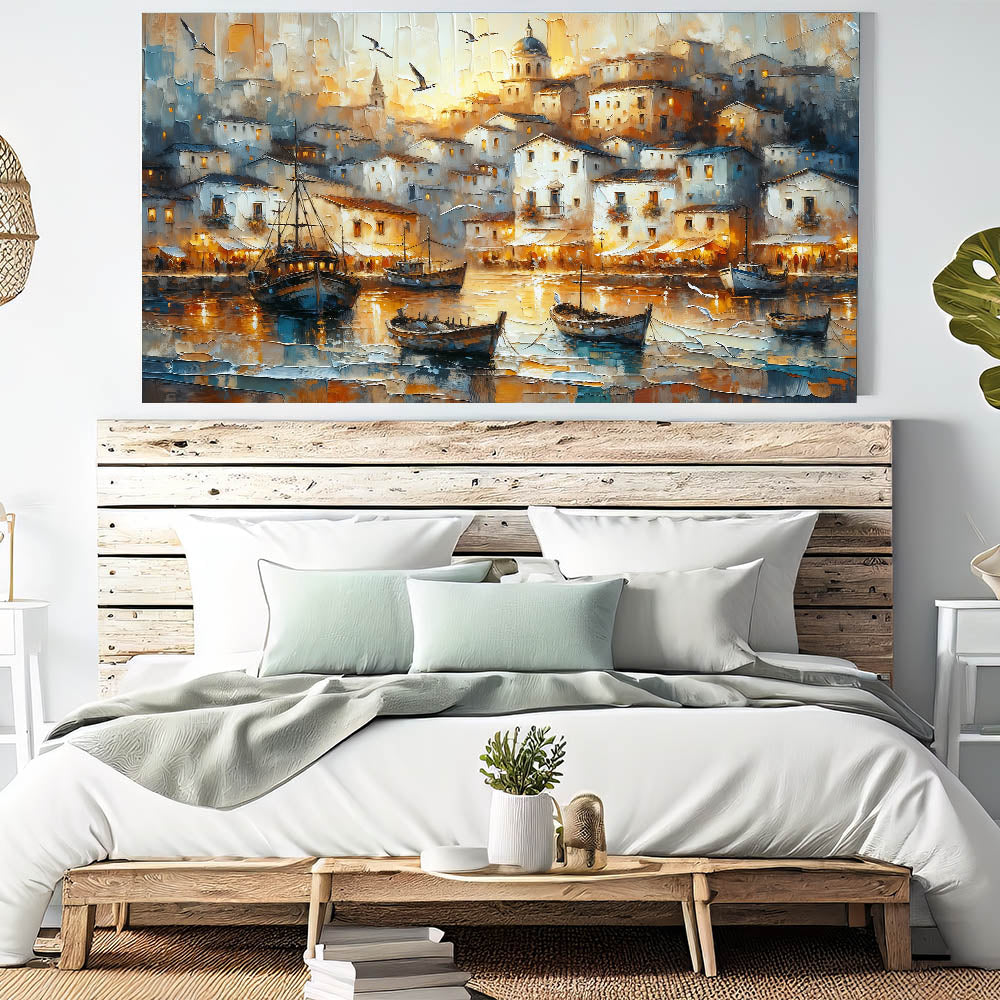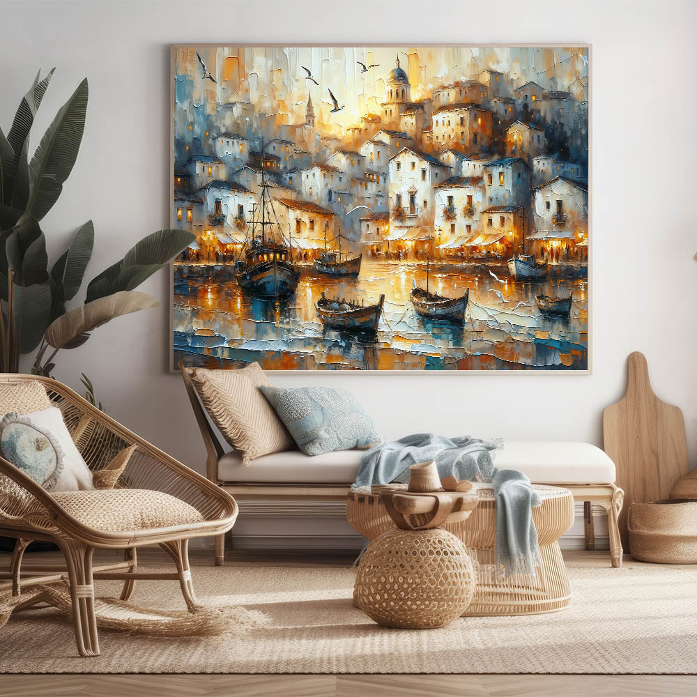 Bring the warmth and charm of a coastal village into your home with this beautiful seaside wall art. This piece showcases a bustling harbor at dusk, with boats gently resting in the illuminated waters, surrounded by quaint homes and buildings. The soft glow of the lights reflecting off the water creates a cozy and inviting atmosphere, perfect for adding a sense of coastal serenity to any room.