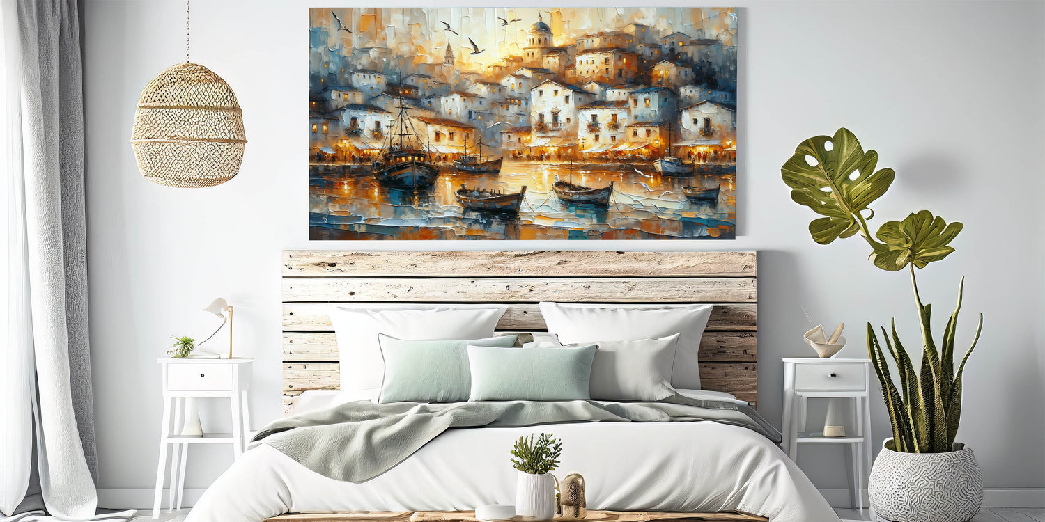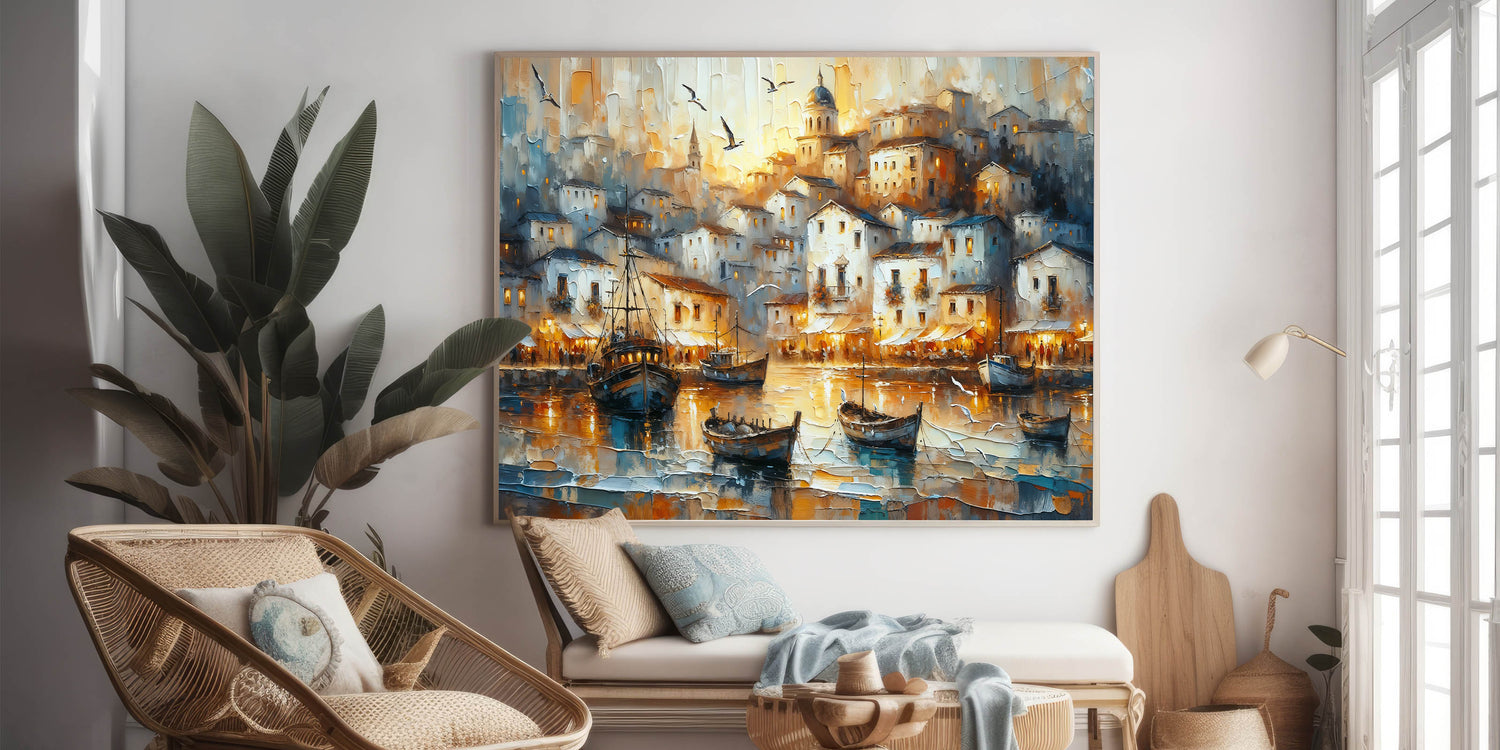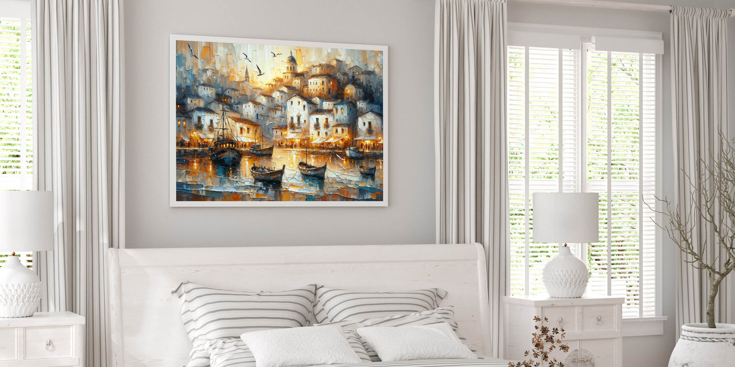Bring the warmth and charm of a coastal village into your home with this beautiful seaside wall art. This piece showcases a bustling harbor at dusk, with boats gently resting in the illuminated waters, surrounded by quaint homes and buildings. The soft glow of the lights reflecting off the water creates a cozy and inviting atmosphere, perfect for adding a sense of coastal serenity to any room.