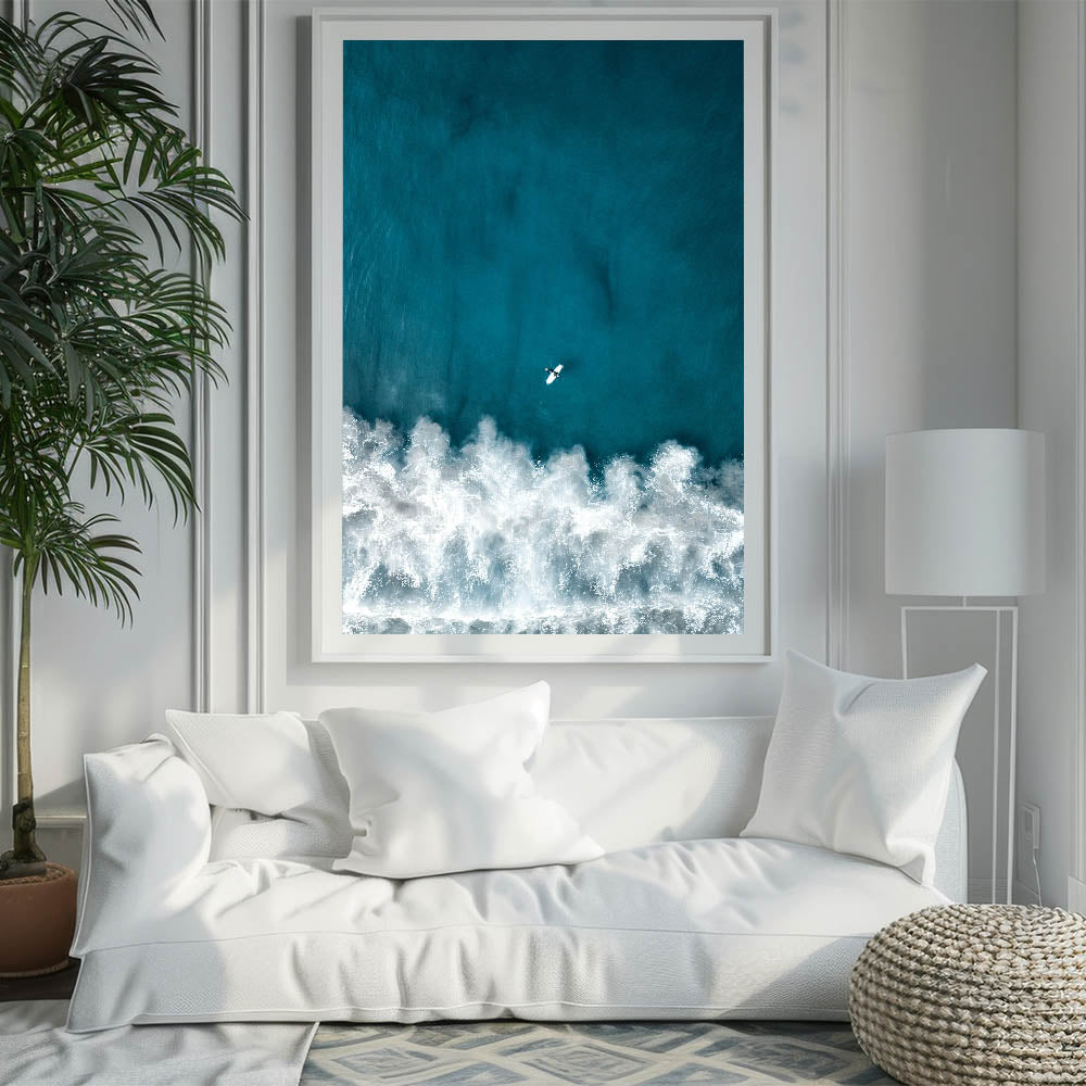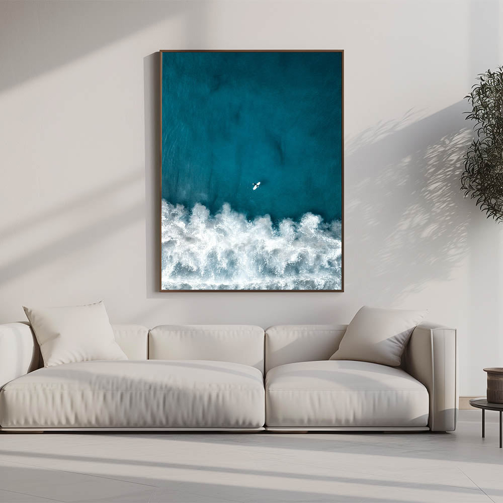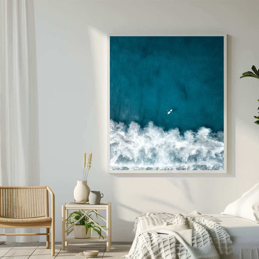 This captivating coastal wall art showcases an aerial view of a lone surfer paddling through the deep blue waves, capturing the essence of adventure and freedom. The rich, turquoise tones of the ocean contrast beautifully with the foamy white waves, creating a dramatic and dynamic visual experience. Perfect for ocean enthusiasts and surfers alike, this beach-themed art piece brings the thrill of the sea into any room, offering a refreshing and vibrant touch.