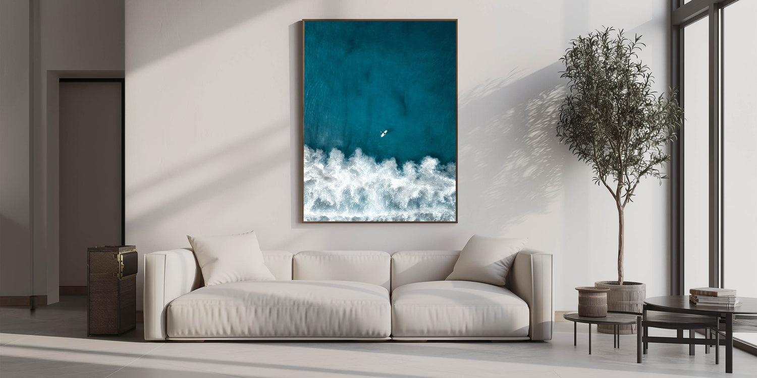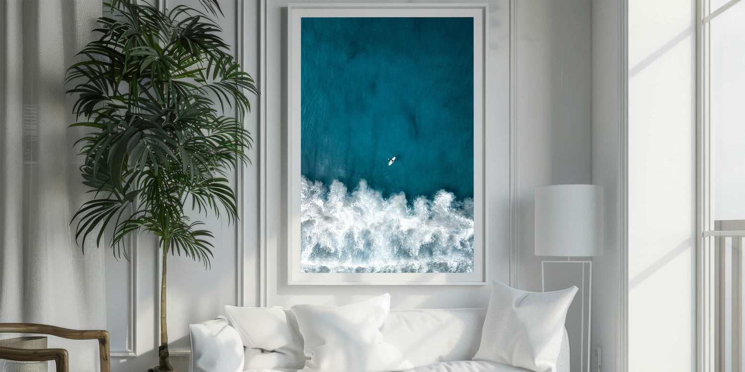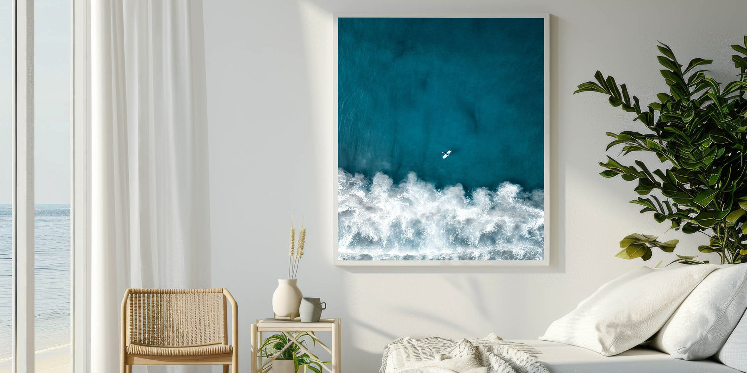 This captivating coastal wall art showcases an aerial view of a lone surfer paddling through the deep blue waves, capturing the essence of adventure and freedom. The rich, turquoise tones of the ocean contrast beautifully with the foamy white waves, creating a dramatic and dynamic visual experience. Perfect for ocean enthusiasts and surfers alike, this beach-themed art piece brings the thrill of the sea into any room, offering a refreshing and vibrant touch.