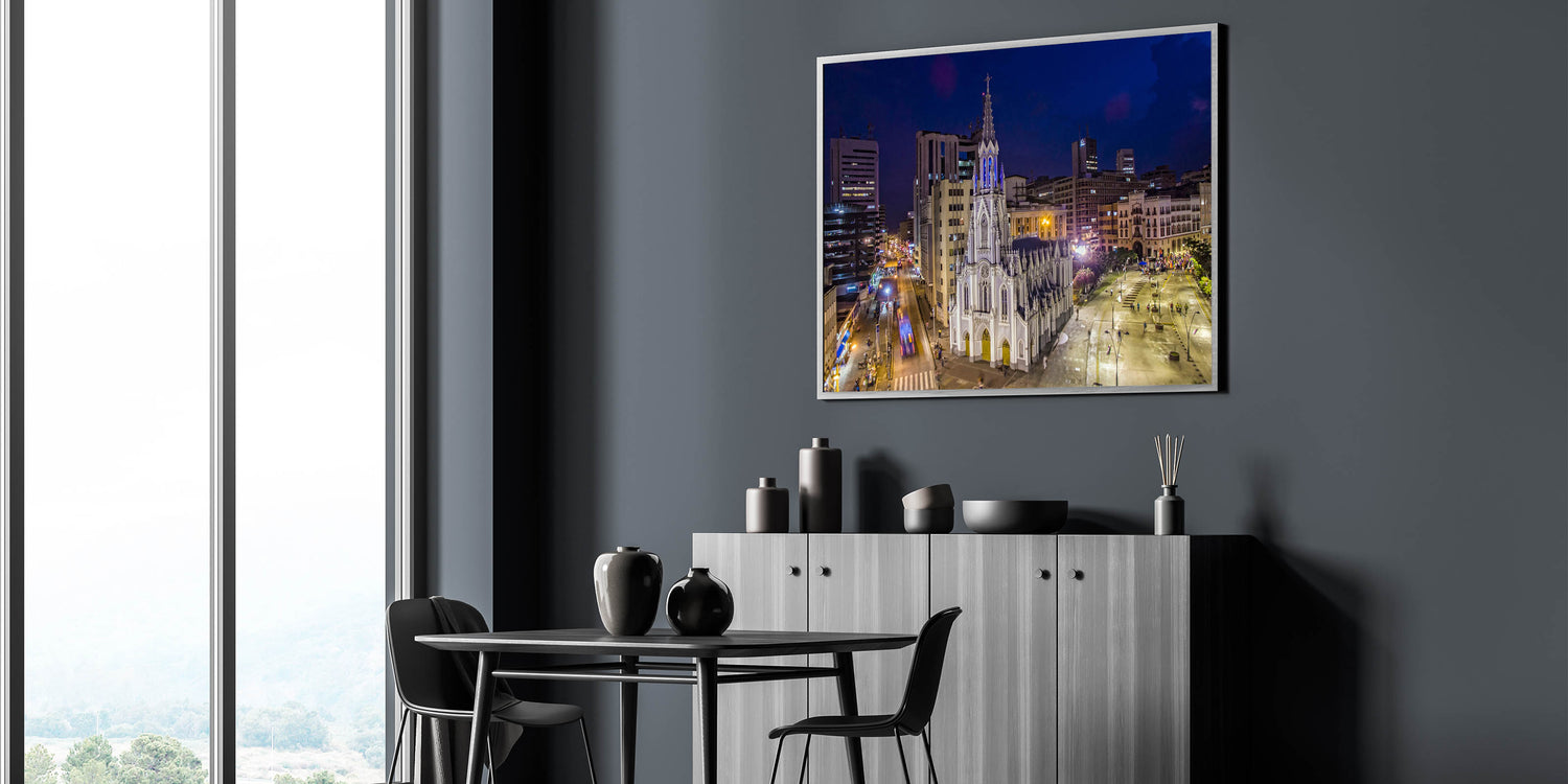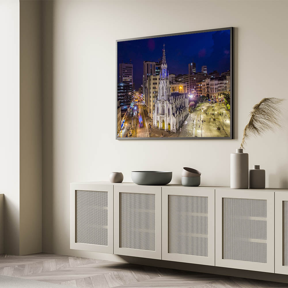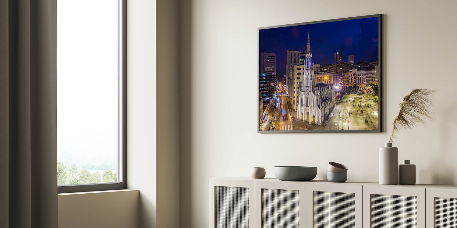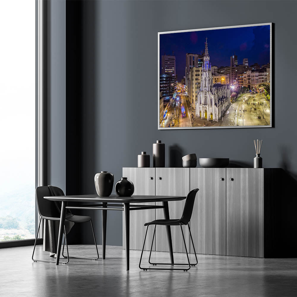 Immerse yourself in the vibrant energy of Bogotá at night with this stunning cityscape wall art. Featuring one of Colombia’s iconic Gothic-style churches illuminated against the backdrop of a bustling urban night, this print perfectly captures the spirit and architecture of Bogotá. This framed Colombia art is perfect for those looking to add a touch of urban sophistication to their home or office, showcasing the beauty of Colombia’s capital city.