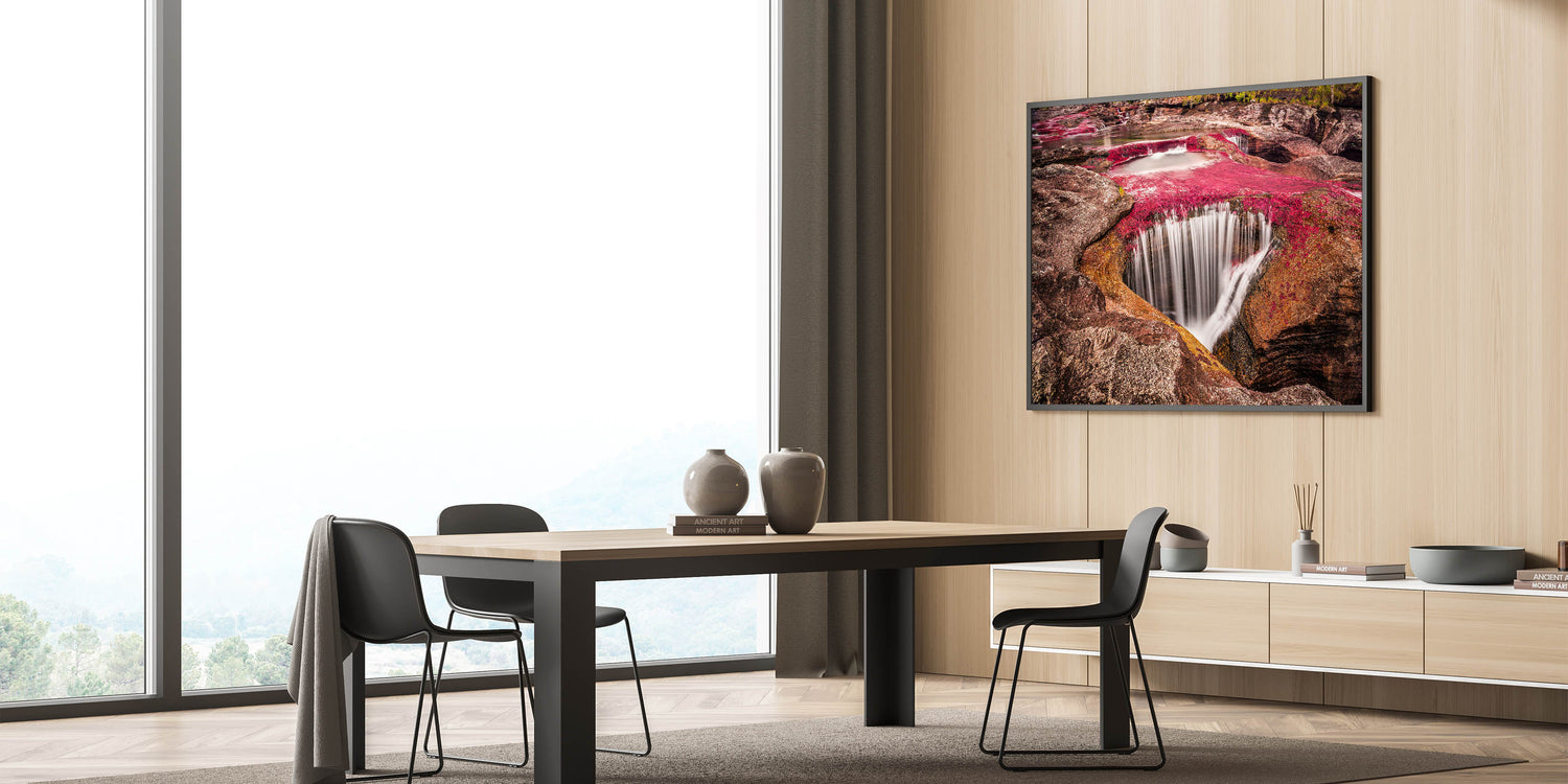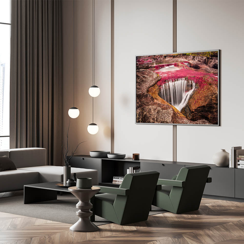 Transform your space with the natural wonder of Colombia’s Caño Cristales. This stunning wall art captures the river’s vivid colors and serene waterfall, making it an ideal focal point for any room.