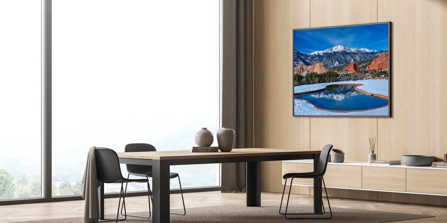 Bring the serene beauty of Colorado Springs into your home with this stunning canvas print featuring a snowy Pikes Peak reflected in a still pool of water. The vibrant red rock formations contrast beautifully with the crisp blue sky and snow-covered mountains, creating a breathtaking scene that captures the essence of winter in Colorado. This artwork is perfect for nature lovers who appreciate the peacefulness of a snowy landscape paired with the rugged beauty of the Rocky Mountains.