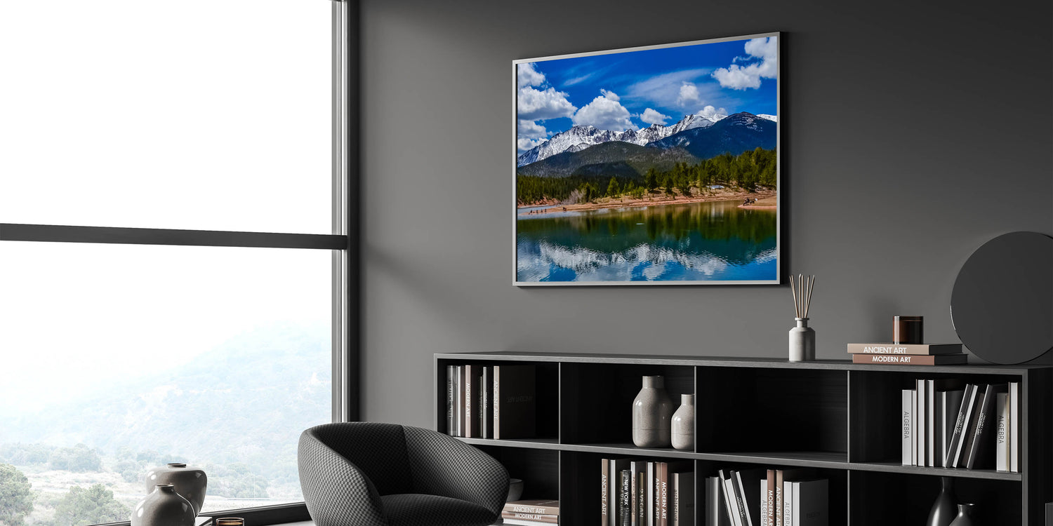 • Pikes Peak art print featuring snow-capped mountains and a reflective lake.