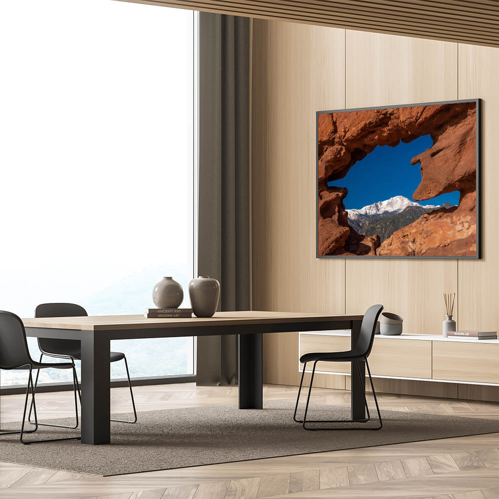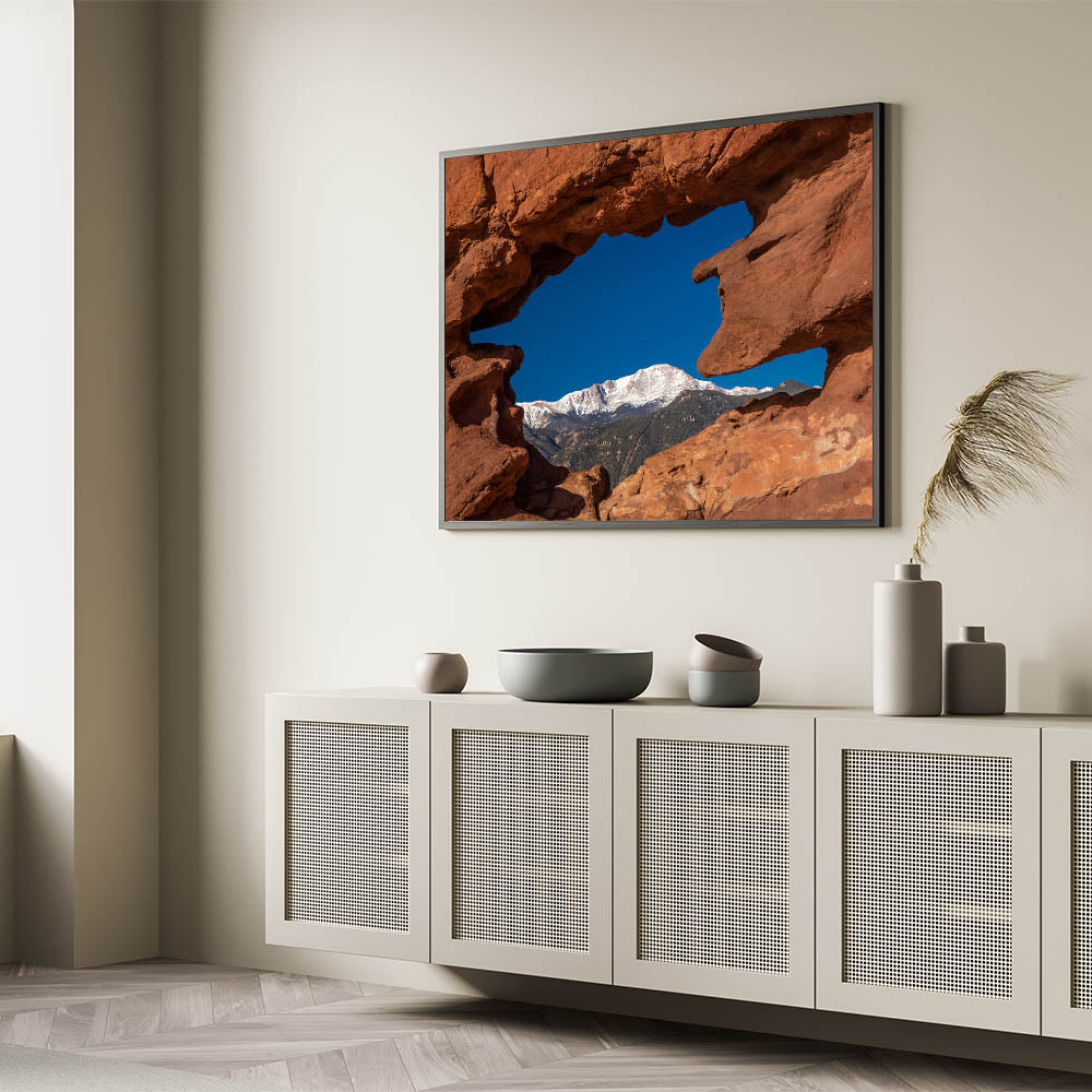 This breathtaking wall art captures a unique perspective of Pikes Peak, framed by the famous red rock formations of Garden of the Gods in Colorado Springs. The vibrant contrast between the warm, earthy tones of the rocks and the cool blue sky makes this piece an eye-catching focal point for any space. The snow-capped peak of Pikes Peak in the distance adds a majestic touch, making this artwork perfect for nature lovers and those with a connection to Colorado.