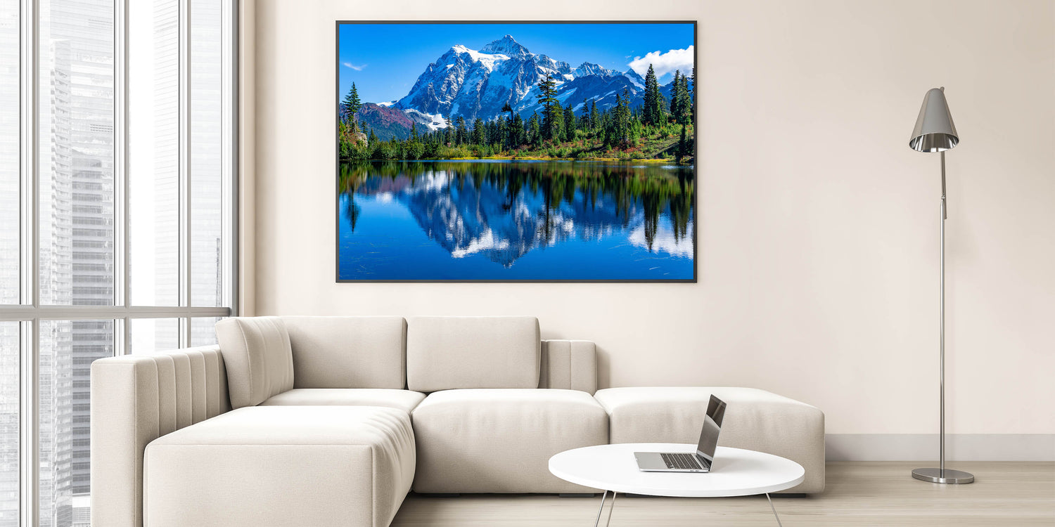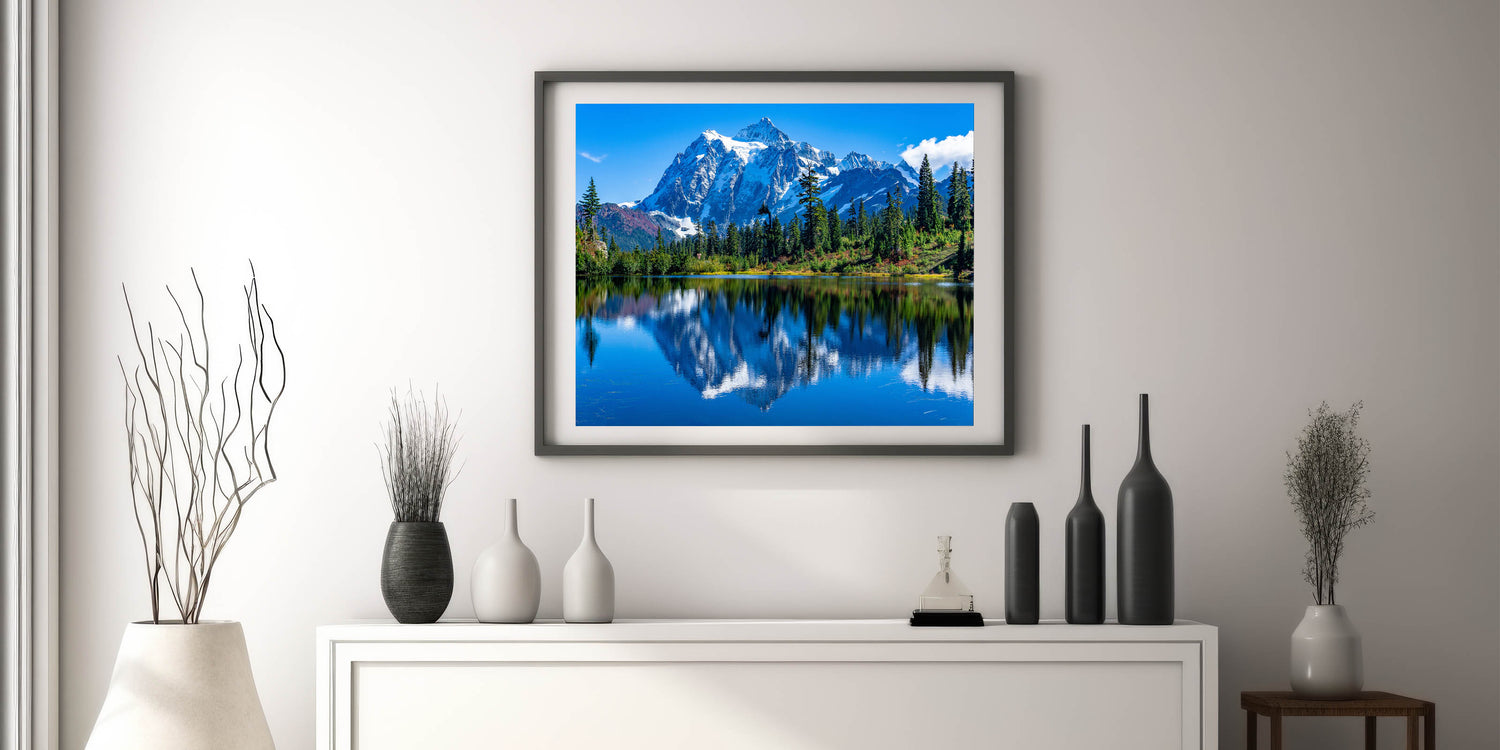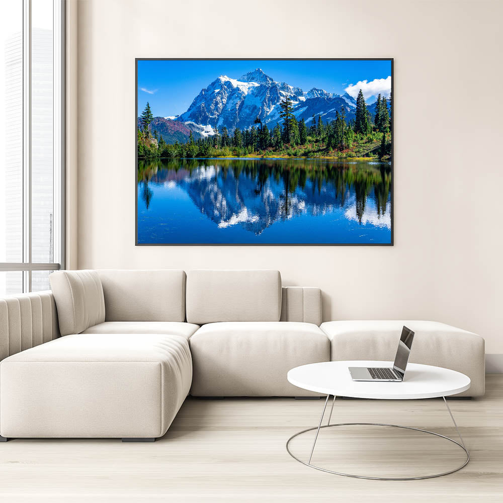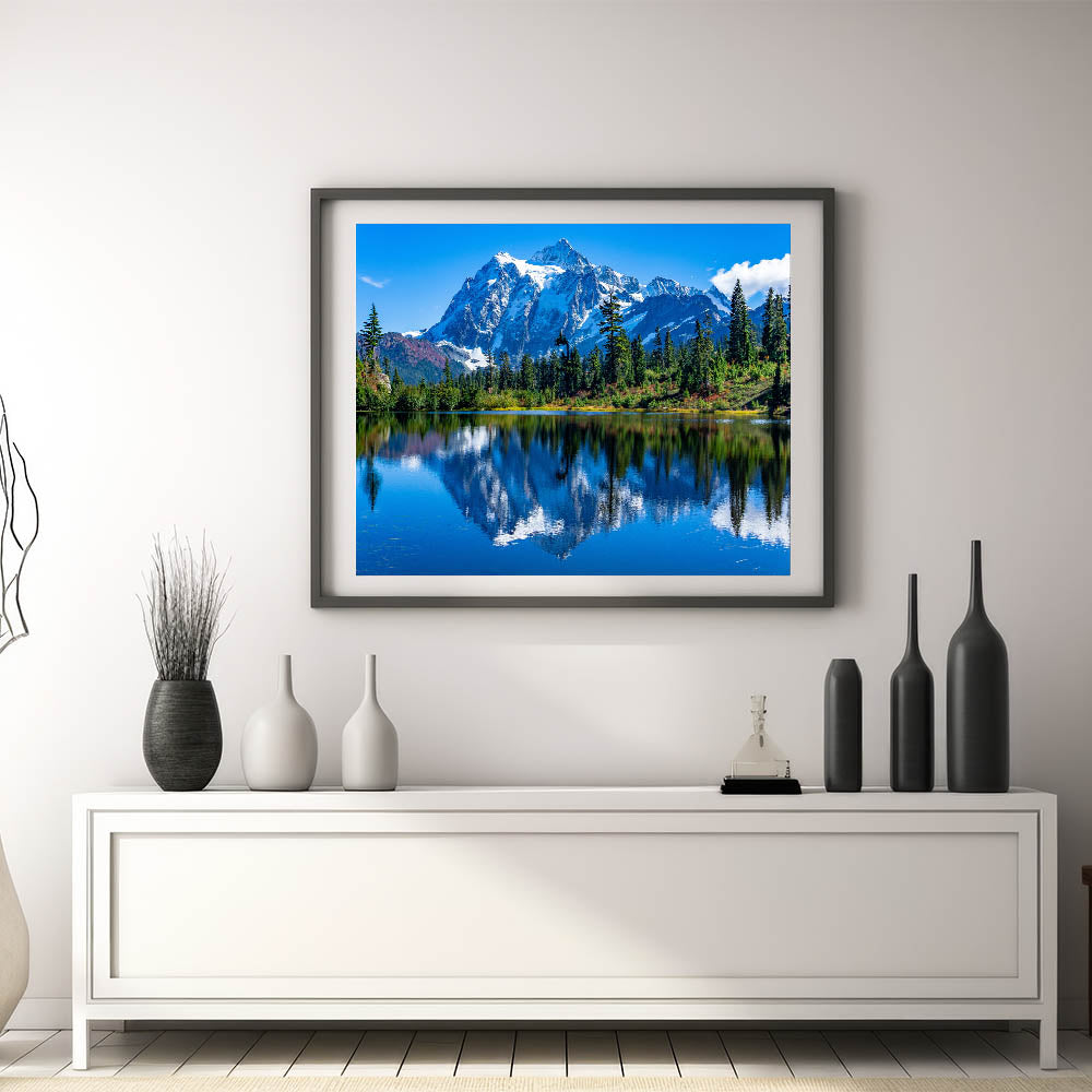 Experience the beauty of the breathtaking Rocky Mountains with this stunning photography print. Capturing the stillness of a crystal-clear lake, this artwork showcases the majestic snow-capped peaks of the Rockies perfectly reflected in the water below. The lush green trees and deep blue sky complete this peaceful landscape, making it ideal for any nature lover.