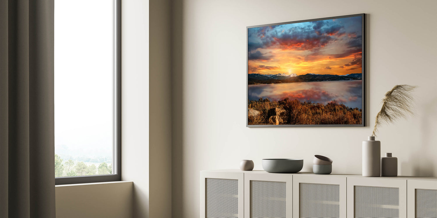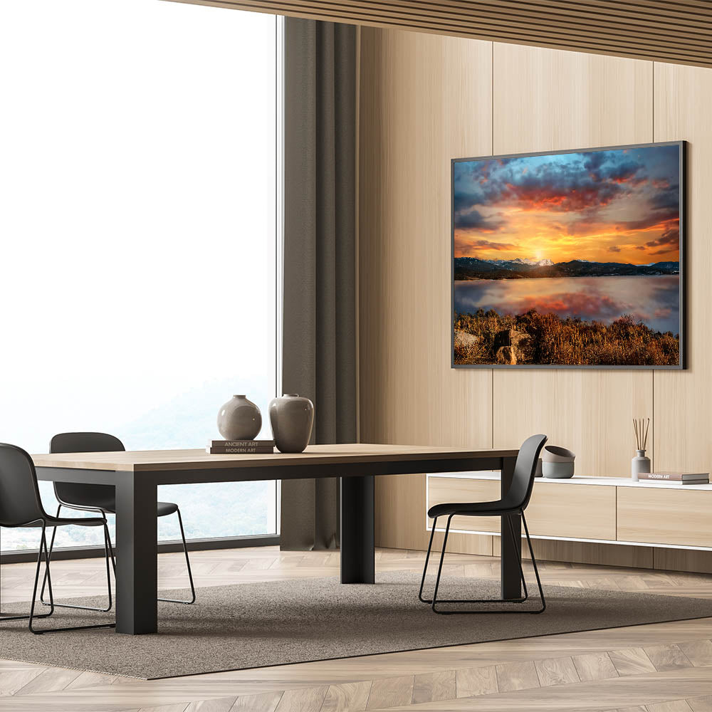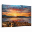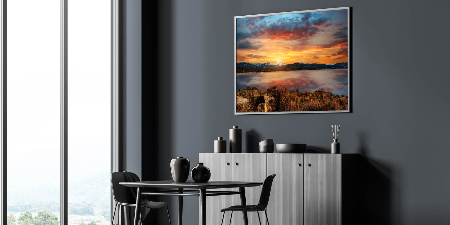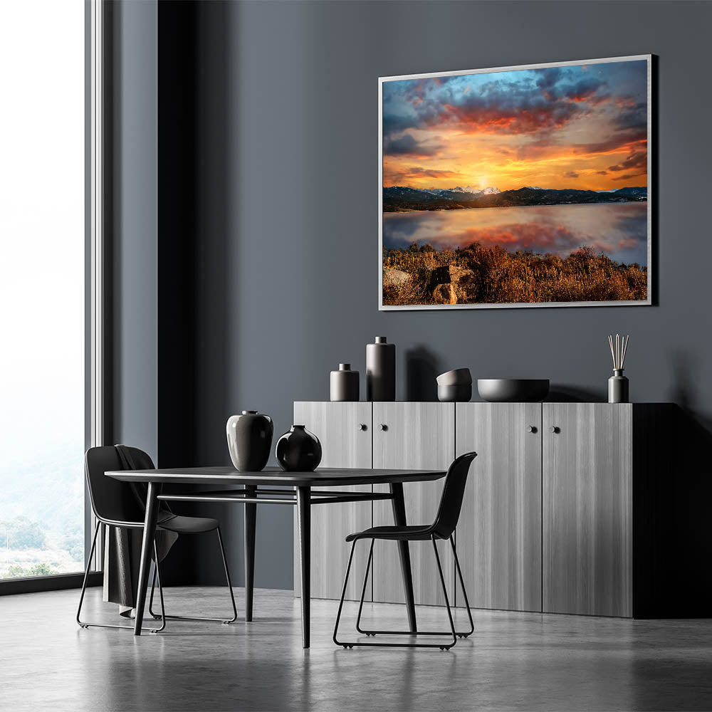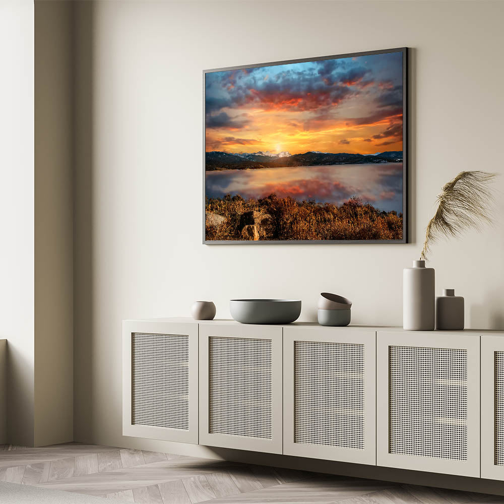Bring the beauty of the Rocky Mountains into your home with this breathtaking sunset landscape. The vibrant hues of orange, pink, and gold dance across the sky, reflecting on the calm waters of the lake below. The snow-capped mountain range in the distance adds a touch of majesty, making this artwork perfect for anyone who loves nature’s dramatic beauty.