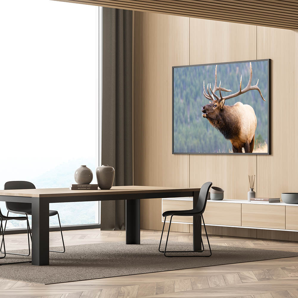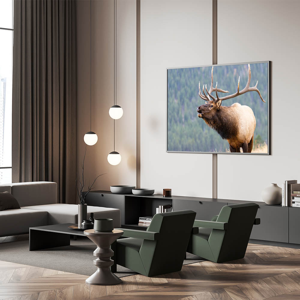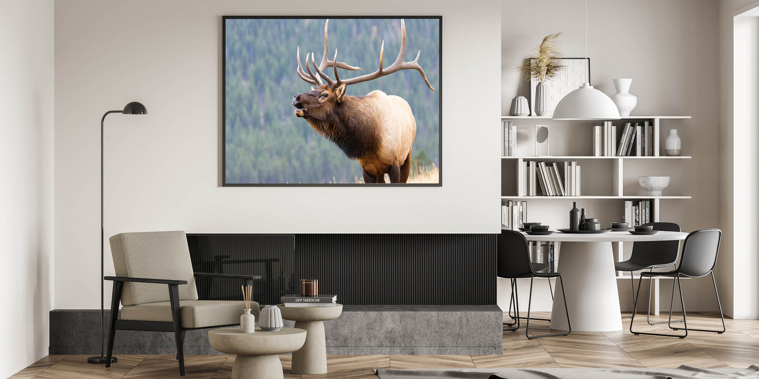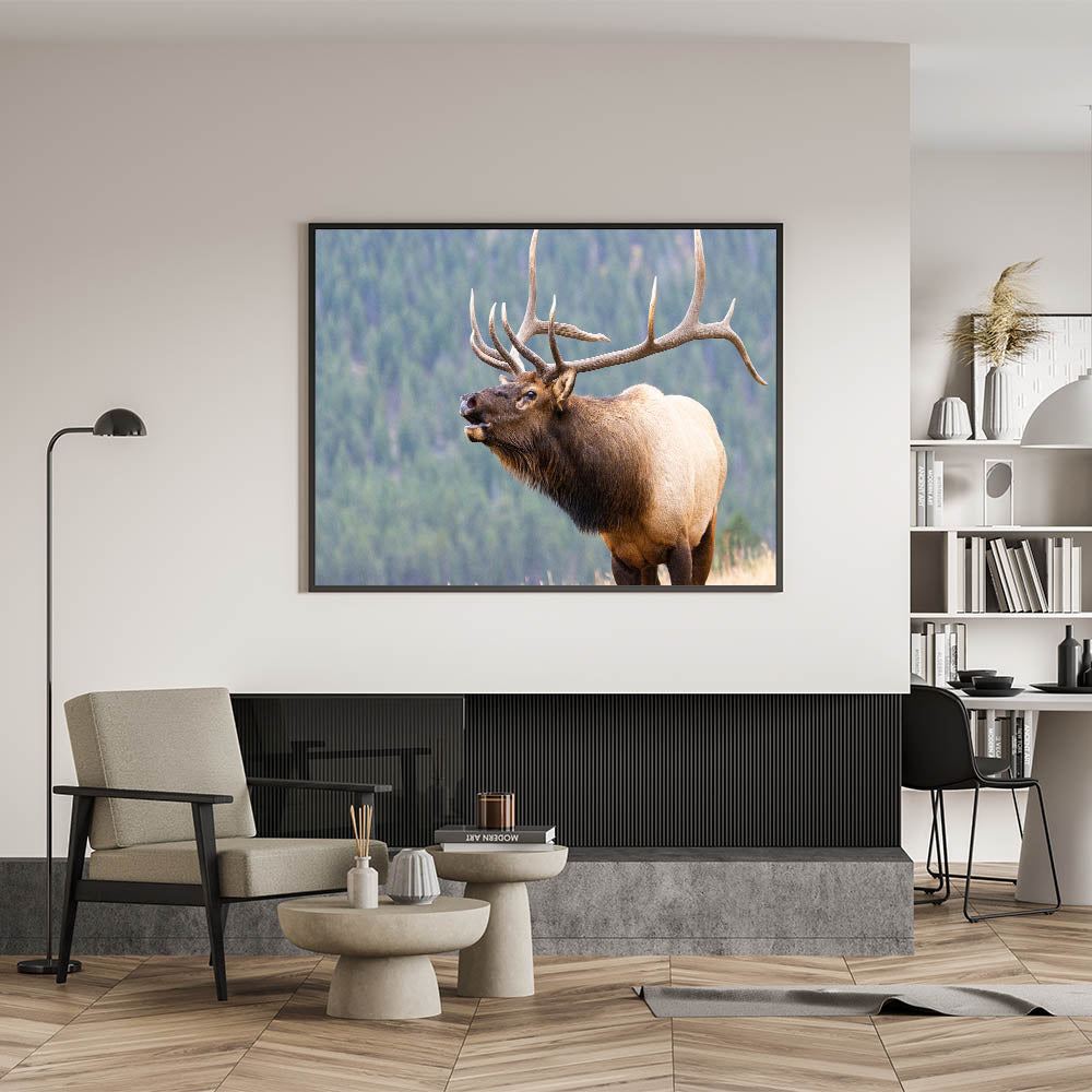 Celebrate the majestic beauty of the Rocky Mountains with this striking photograph featuring a proud elk in its natural habitat. The powerful animal is captured mid-call, standing tall against the backdrop of lush green forests. This artwork is perfect for wildlife lovers and those looking to bring a piece of the wild outdoors into their home.